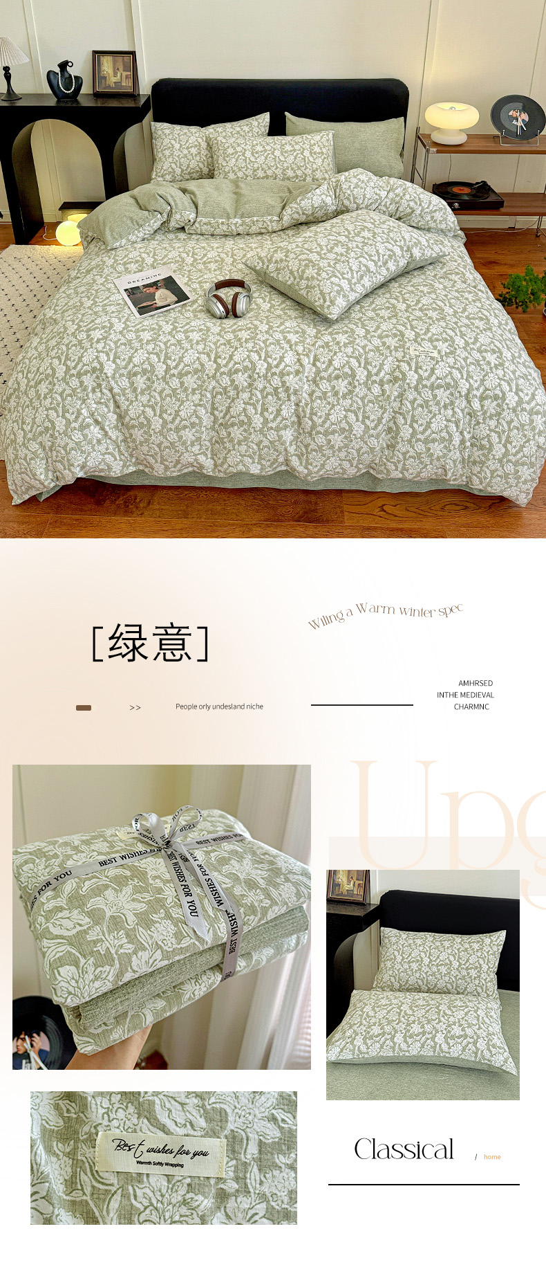 金梦拉家纺 2025秋冬爆款新品高克重加厚原麻亚麻皱皱纱印花四件套 秘境绿