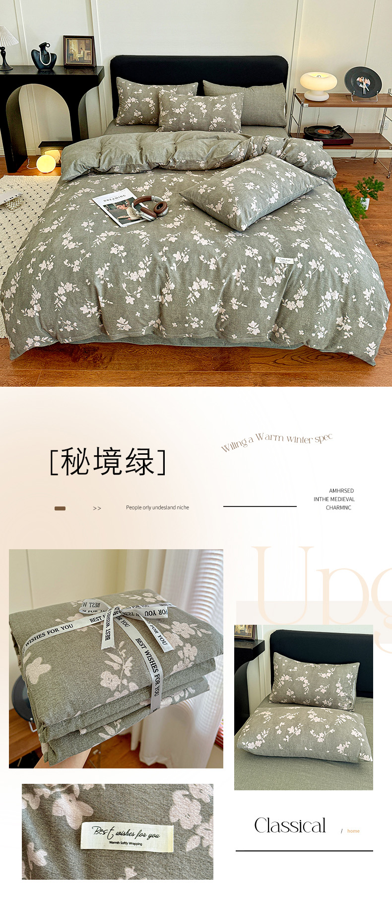 商品名称:金梦拉家纺 2025秋冬爆款新品高克重加厚原麻亚麻皱皱纱印花四件套 秘境绿