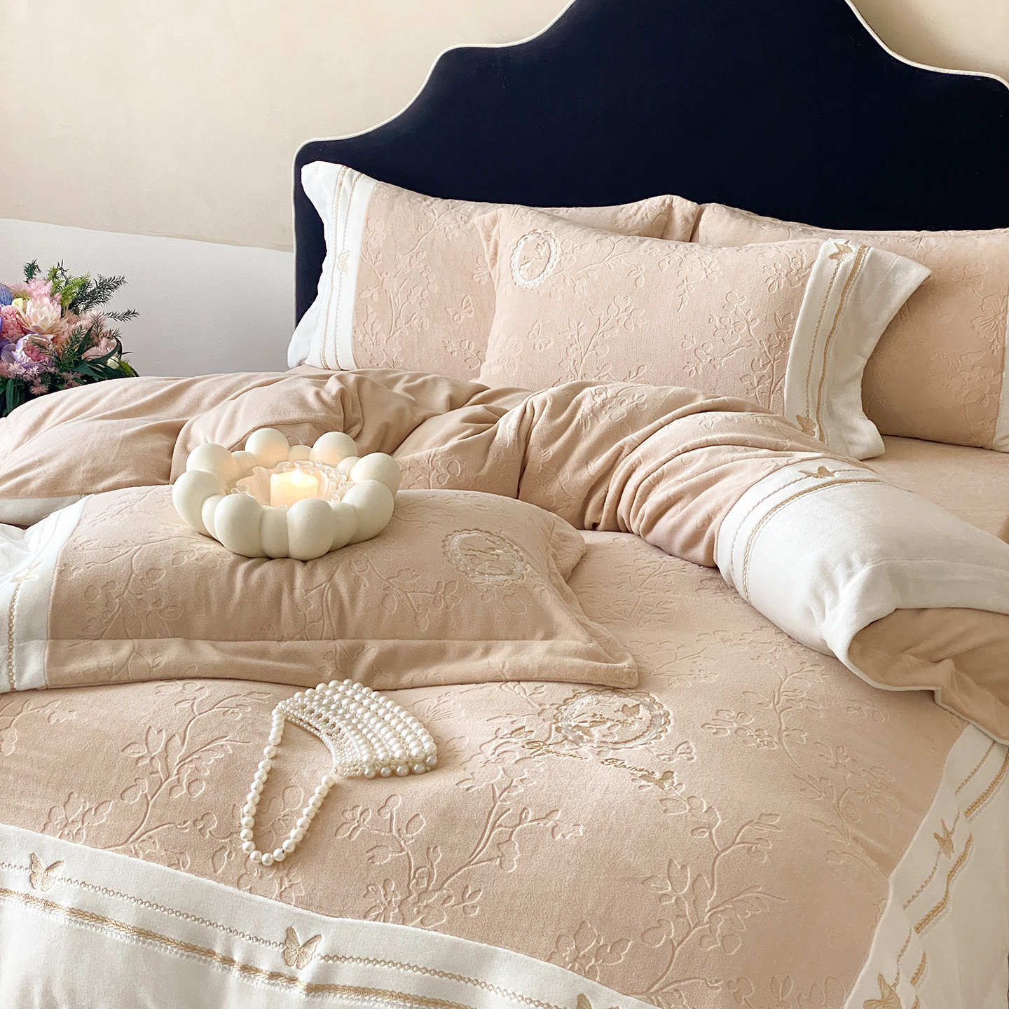 太古汇家居 2025新款牛奶绒雕花+绣花四件套-薇薇安系列 薇薇安-卡其