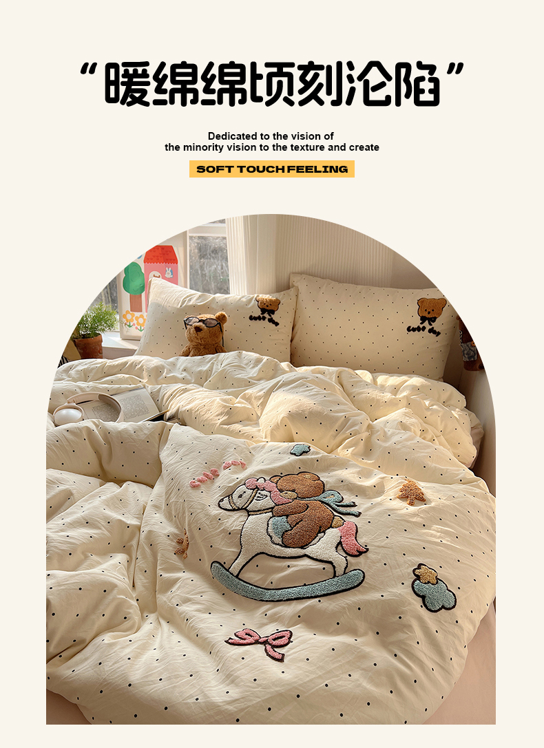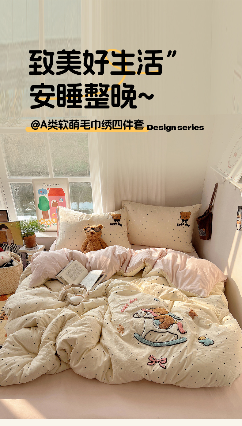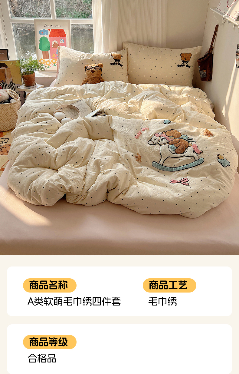 当前位置: 91家纺网 > 商品网购 > 床品套件 > 四件套 > 毛巾绣四件套 > 初夏家纺 2026 毛巾绣四件套A类仿棉105g 卡通可爱【提供买家秀】 毛巾绣-木马小熊