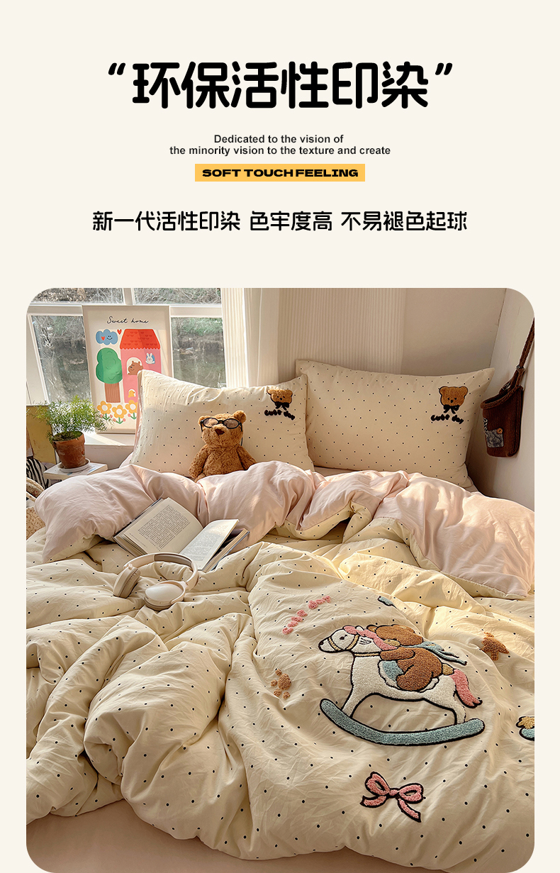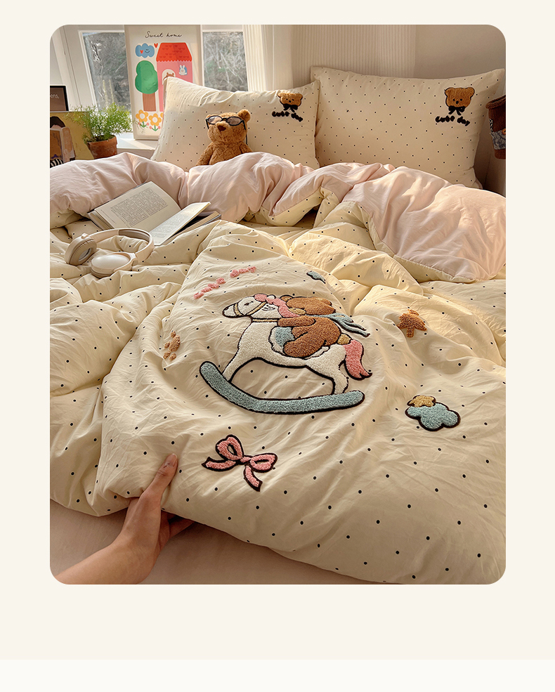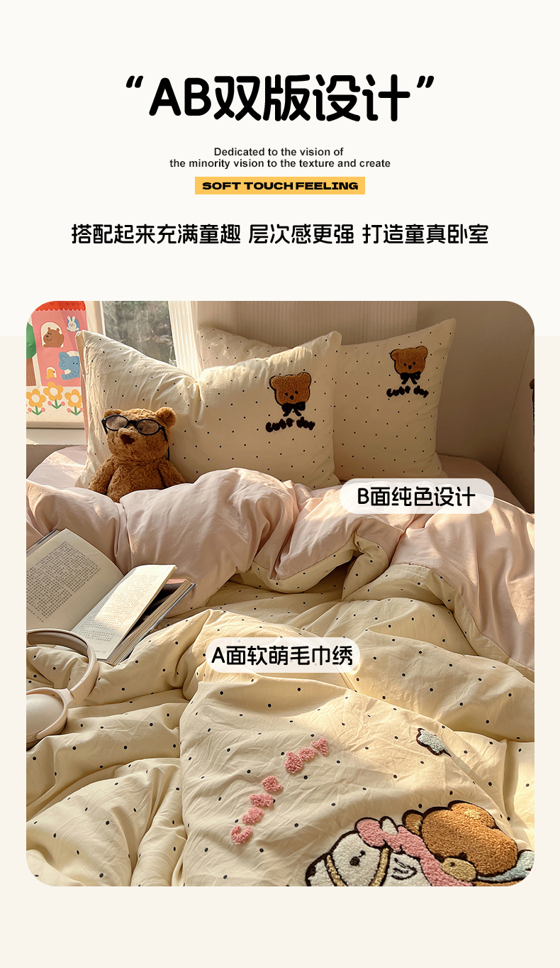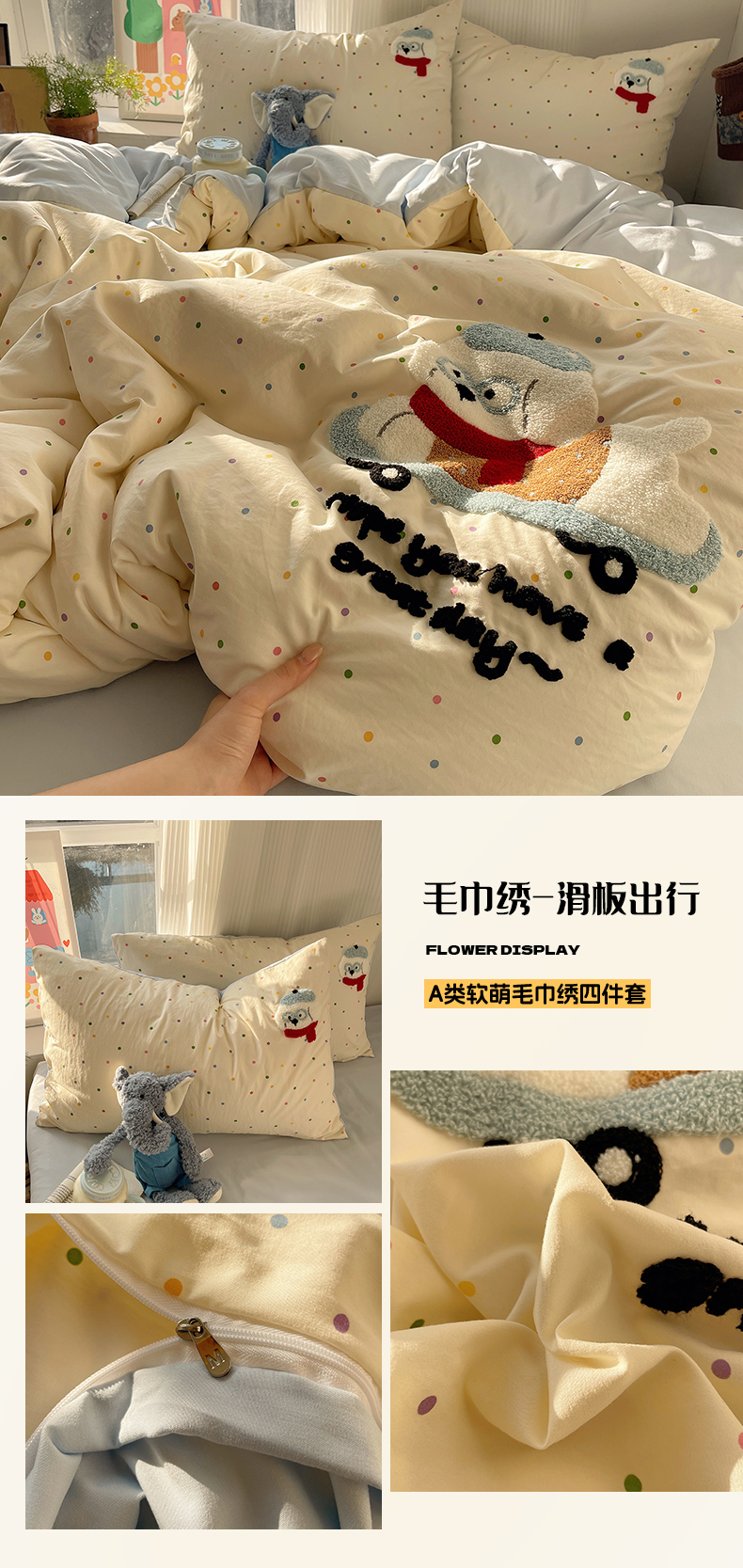 当前位置: 91家纺网 > 商品网购 > 床品套件 > 四件套 > 毛巾绣四件套 > 初夏家纺 2026 毛巾绣四件套A类仿棉105g 卡通可爱【提供买家秀】 毛巾绣-木马小熊