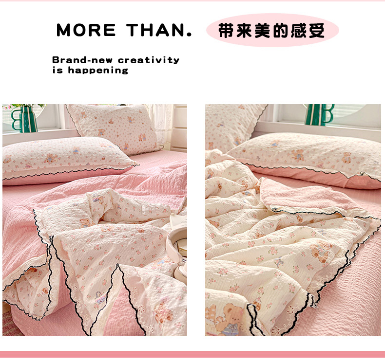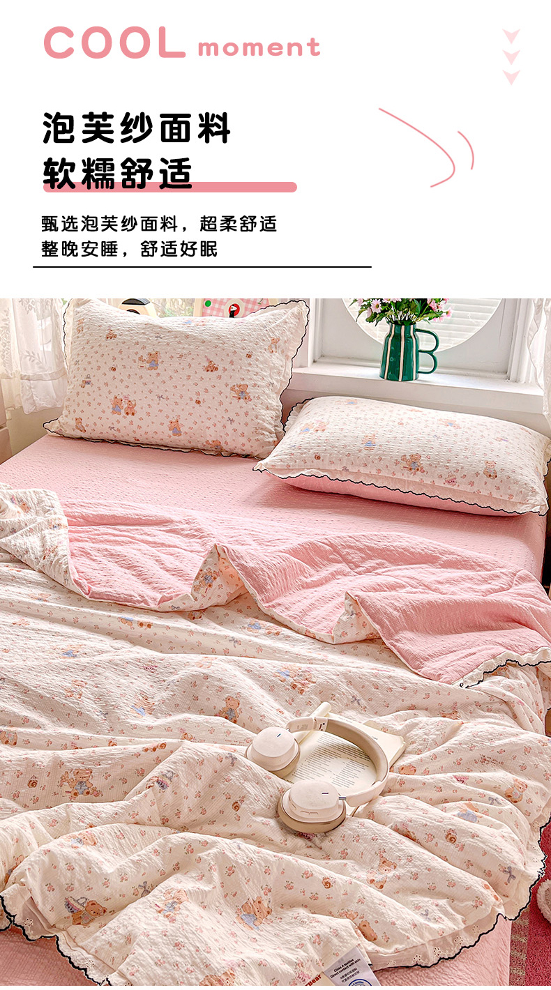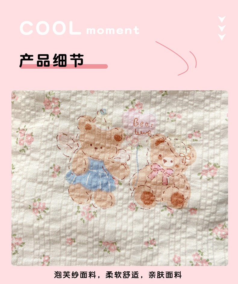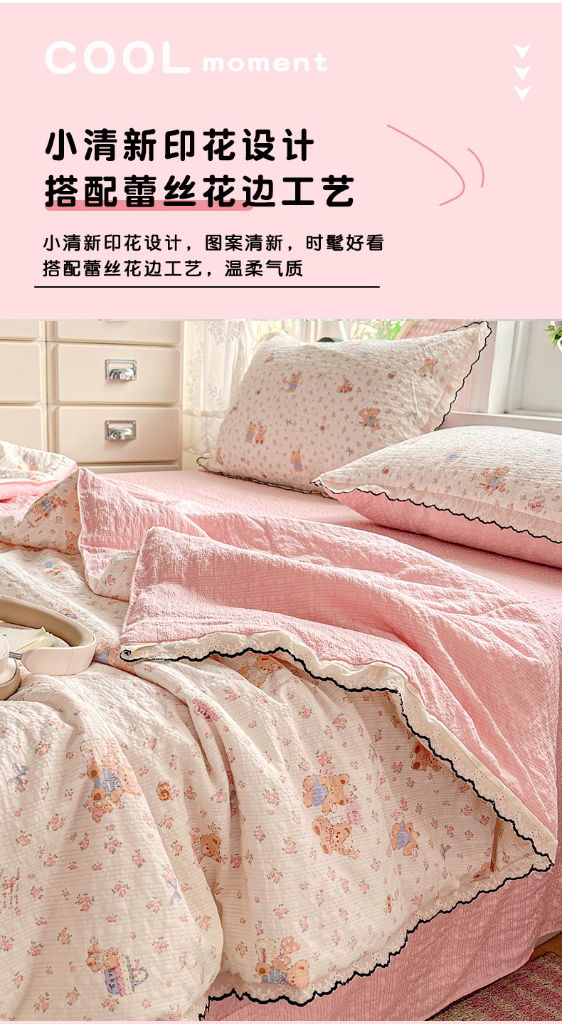 金梦拉家纺 2026新款泡芙纱全棉小黑花边夏被四件套 碎花熊
