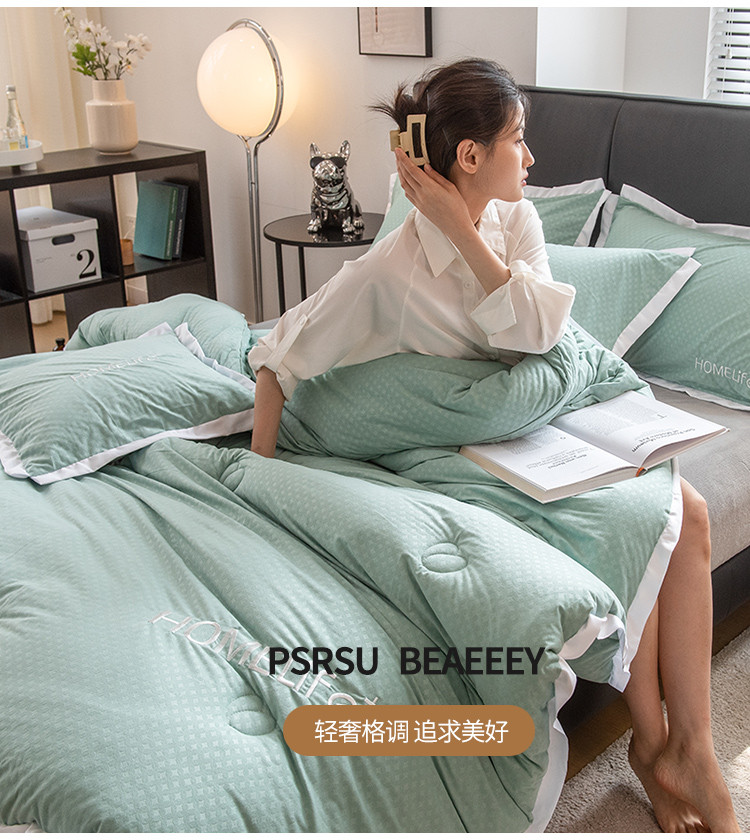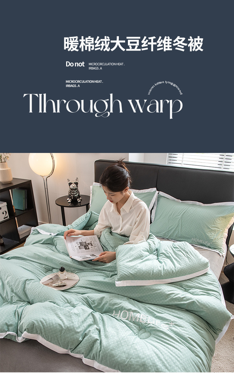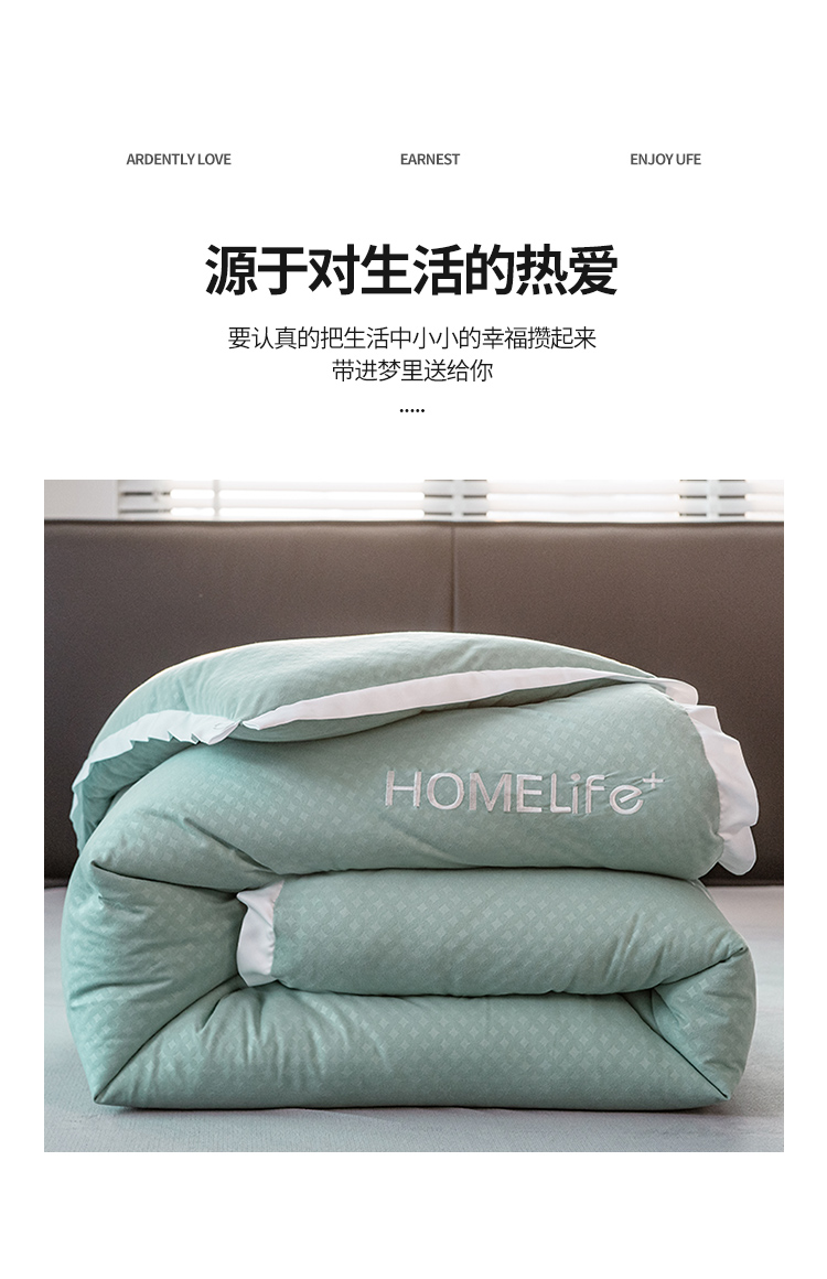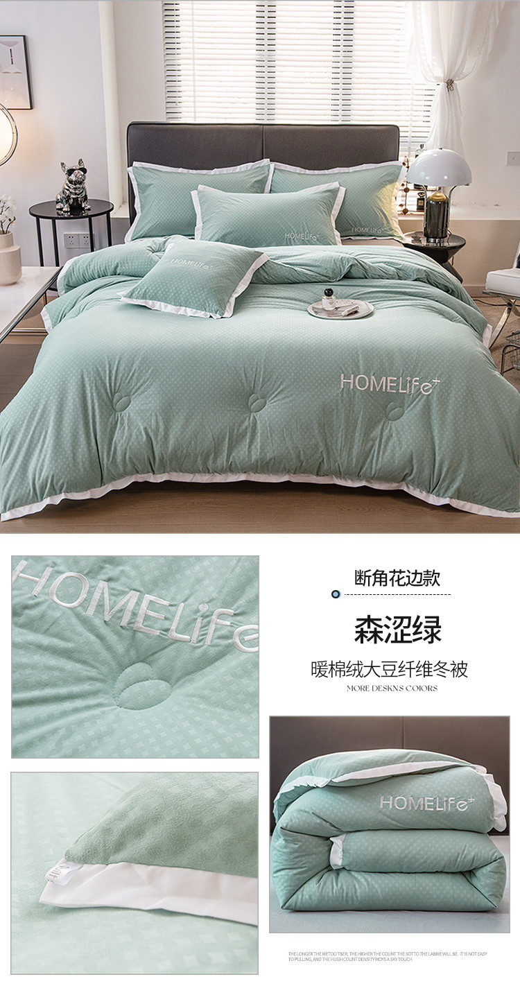 • 91家纺网 家纺一手货源 找家纺 全季直播A类大豆纤维暖棉绒提花冬被被子被芯 断角花边款森涩绿