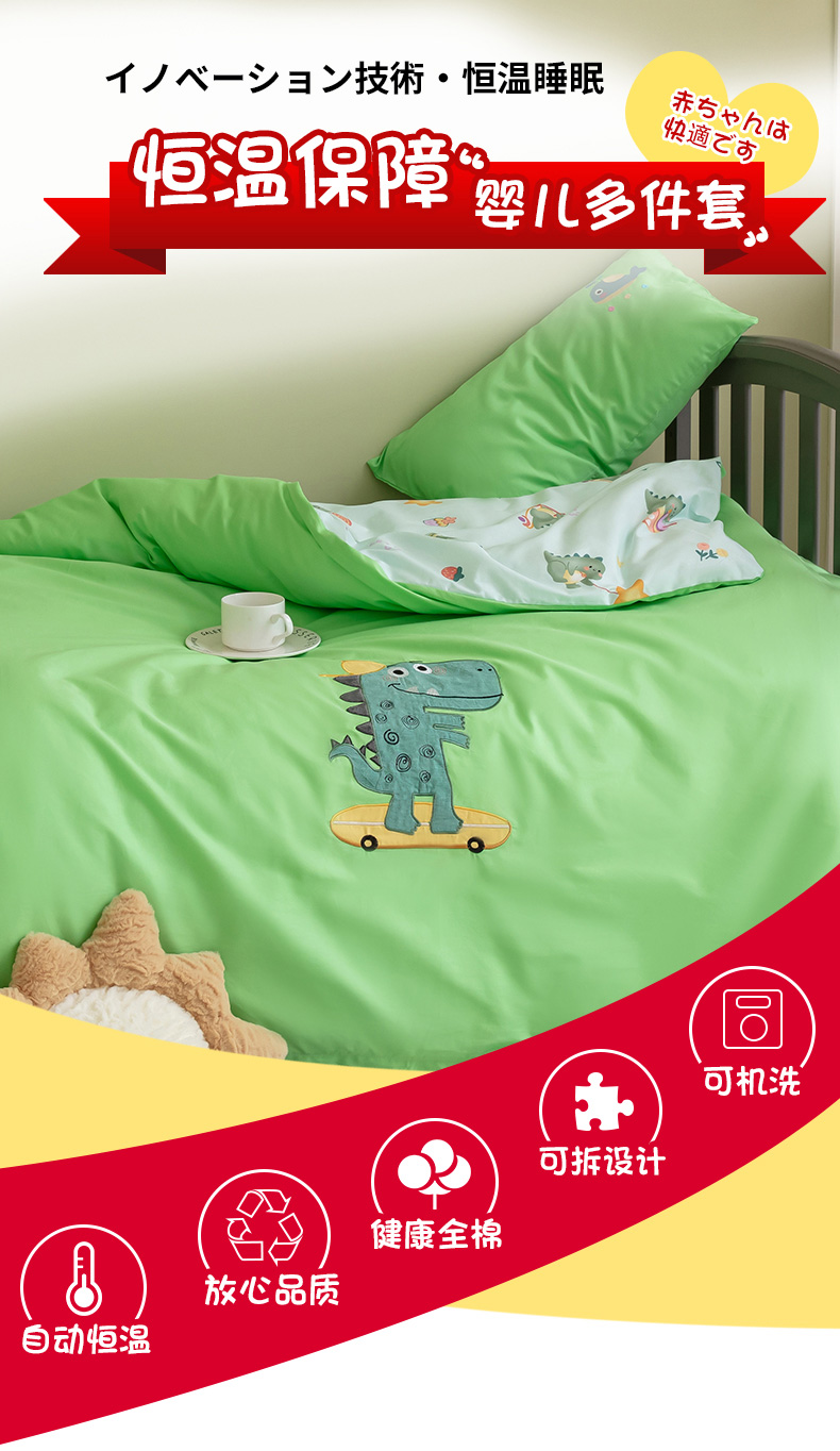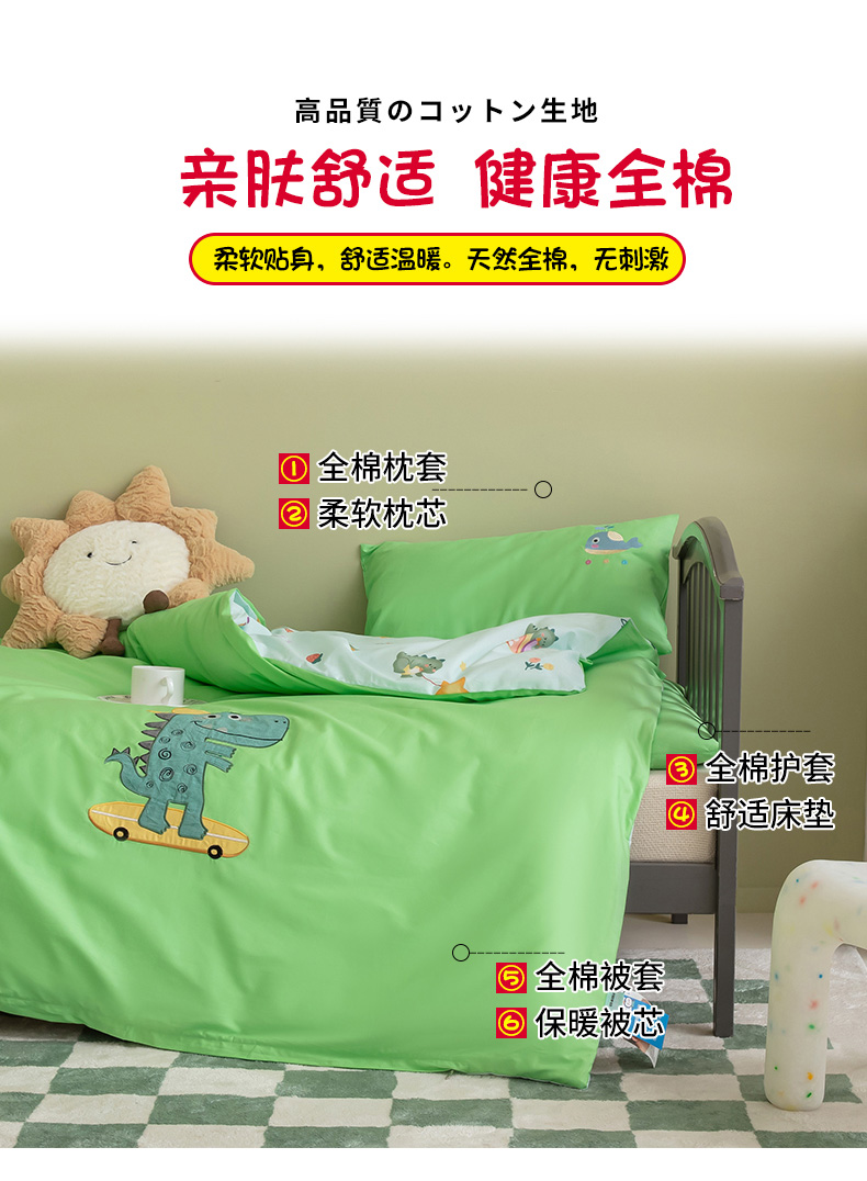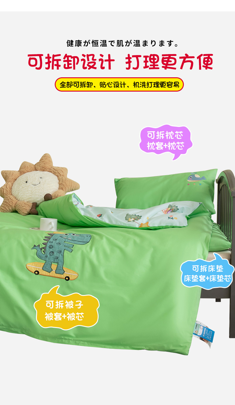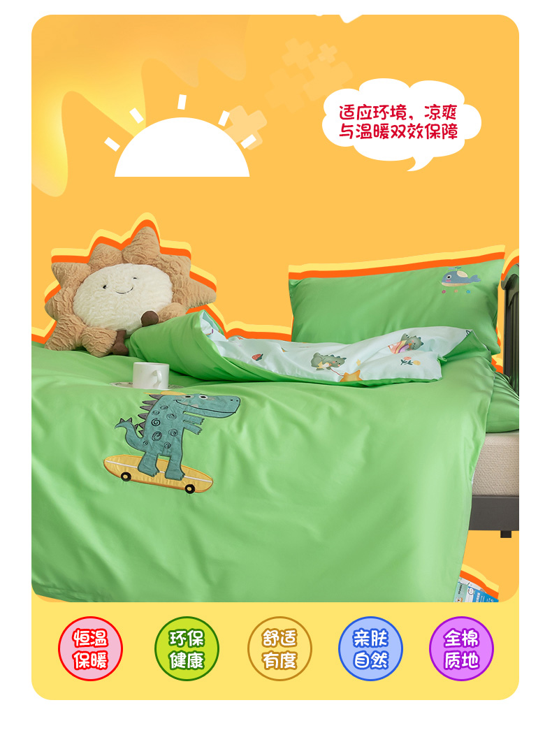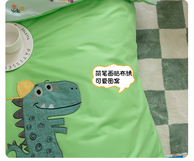 当前位置: 91家纺网 > 商品网购 > 床品套件 > 三件套 > 喜多兔 2023新款40支13372纯棉小小梦绣花幼儿园被子三件套 绿色滑板恐龙