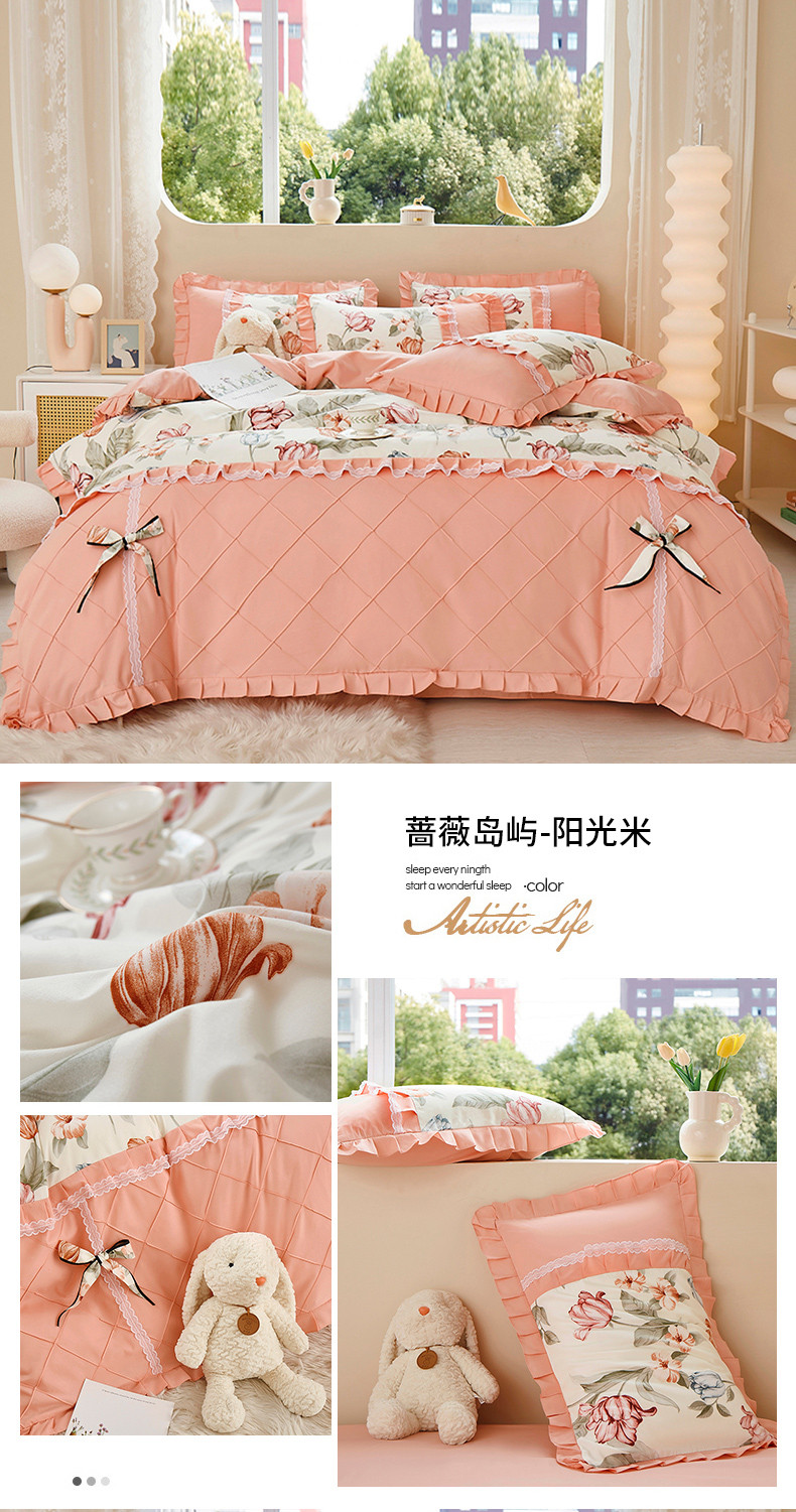 靓生活 2023新款贡棉浪漫花边印花四件套 蔷薇岛屿-阳光米