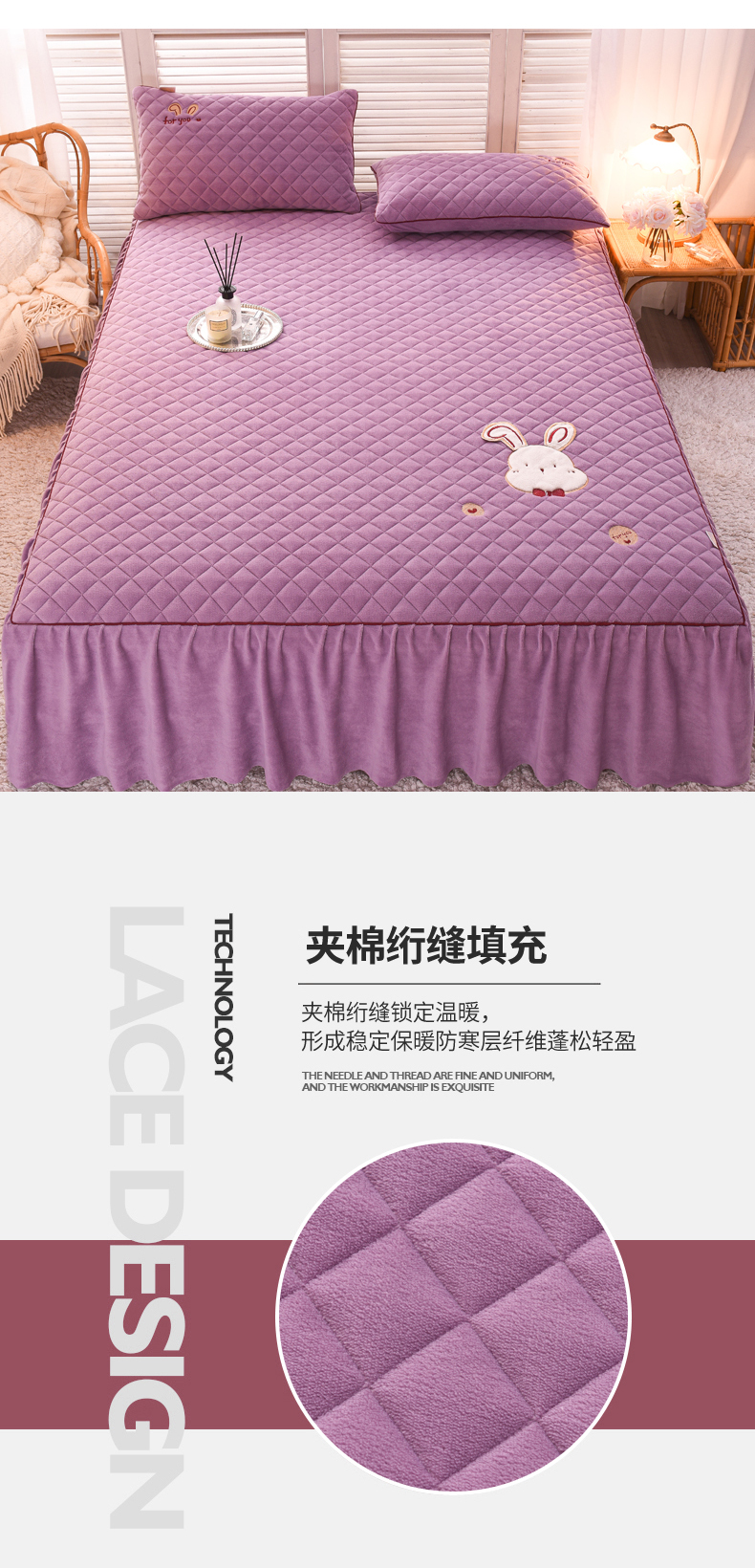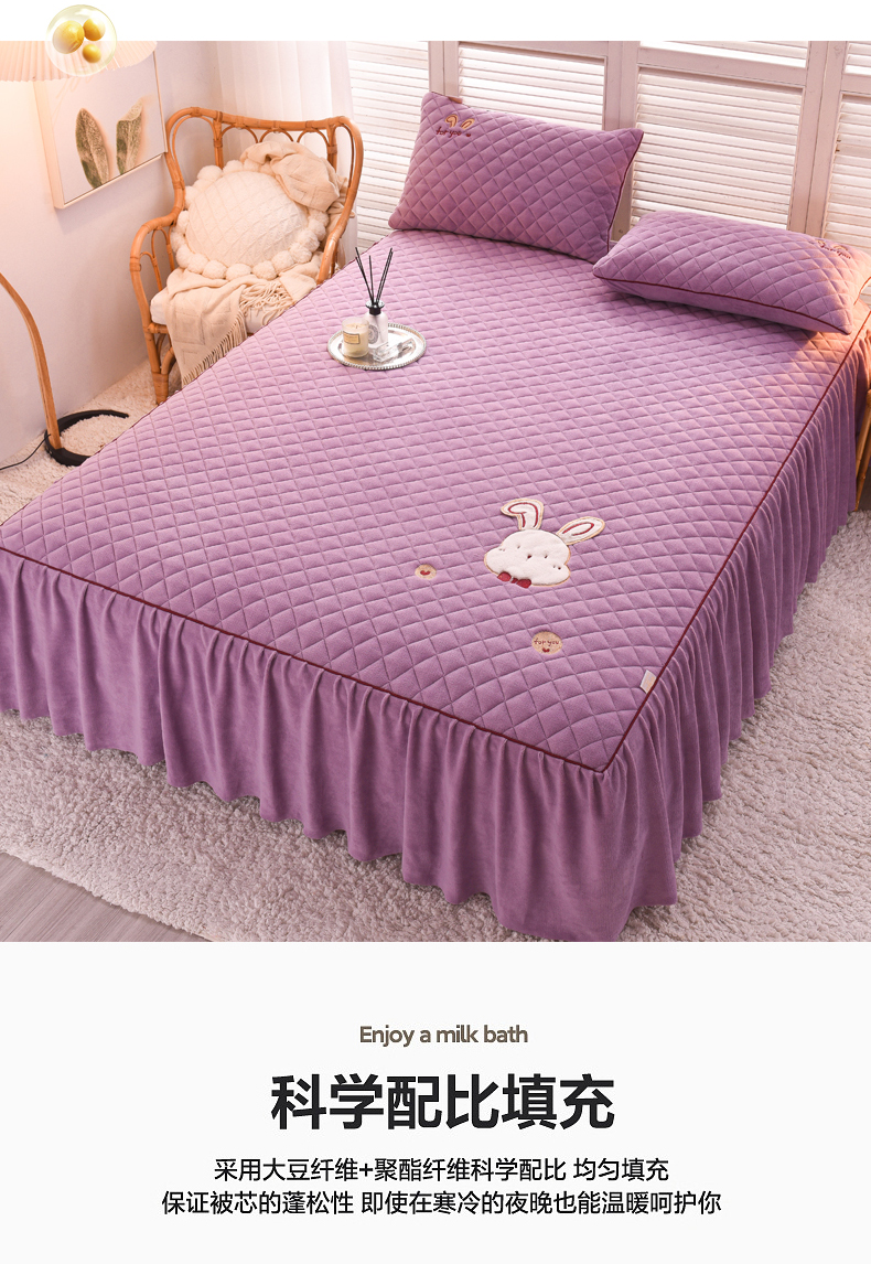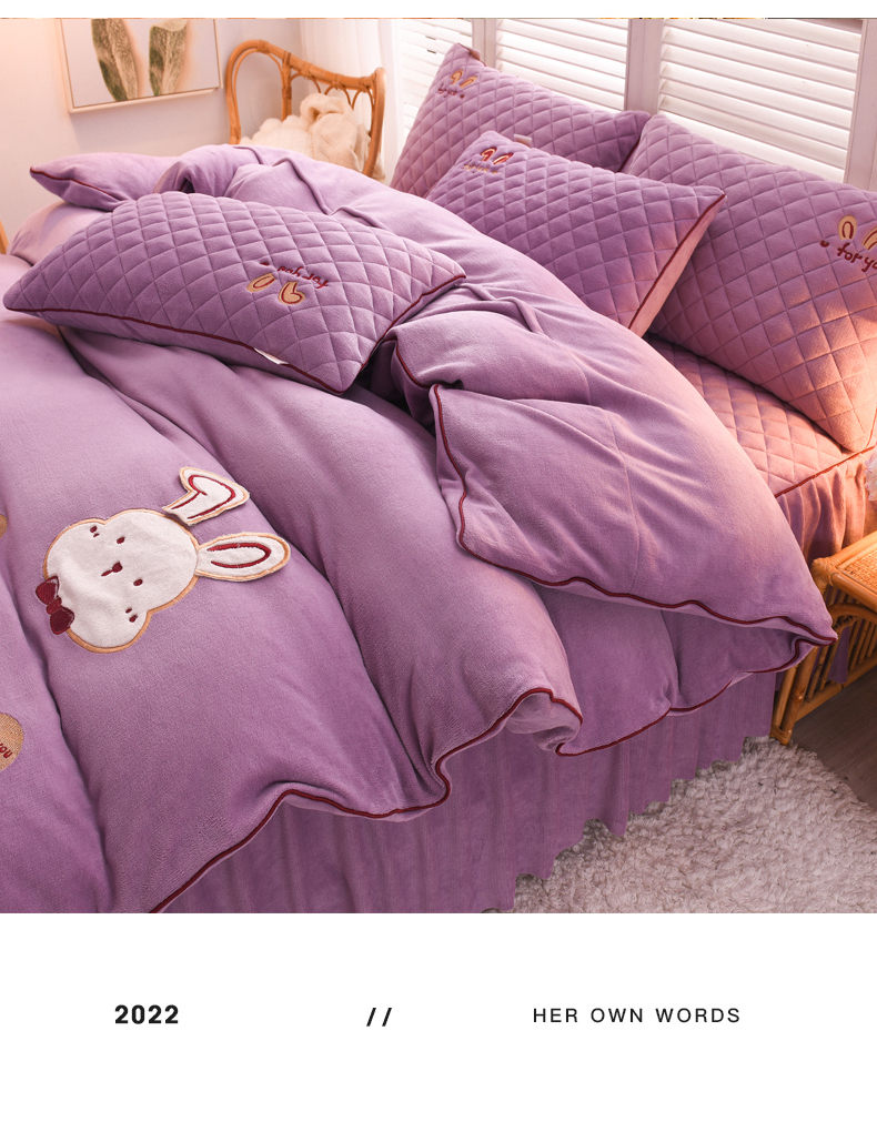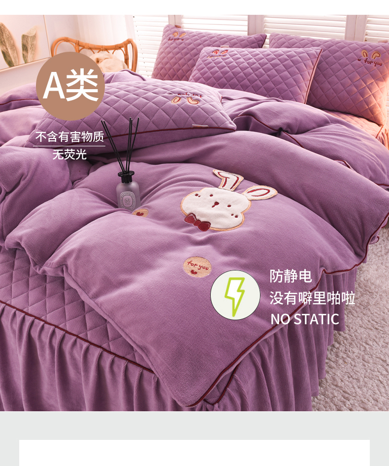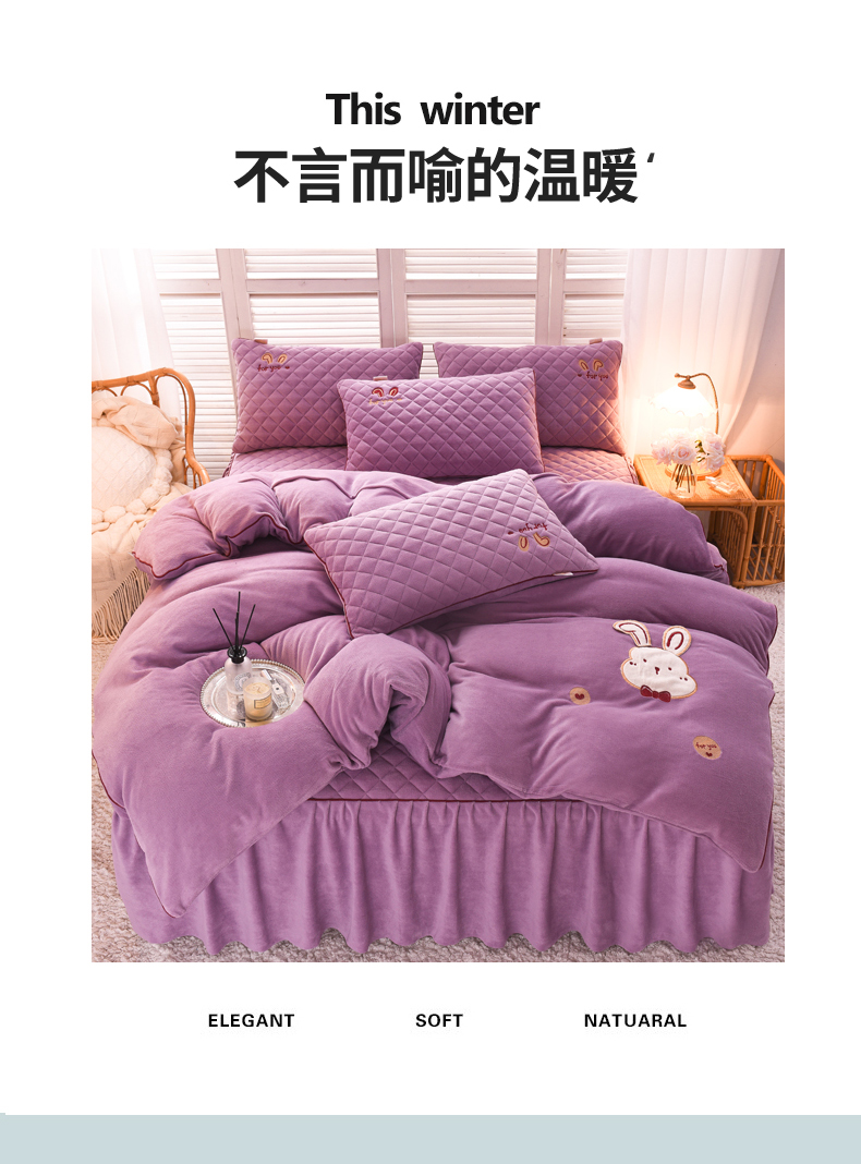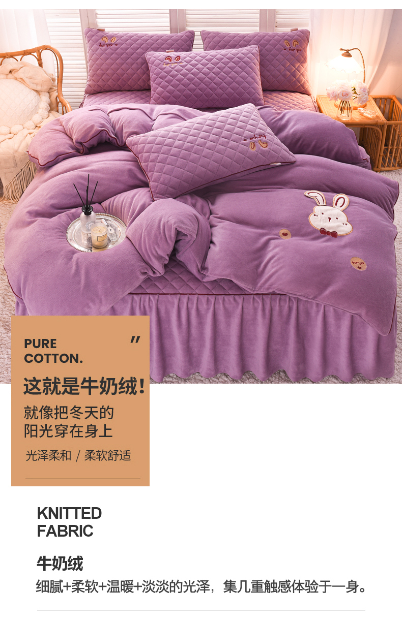 当前位置: 91家纺网 > 商品网购 > 床品套件 > 四件套 > 牛奶绒四件套 > 好眠好梦家纺 2024新款叮当兔牛奶绒绣花床裙款四件套 丁香紫