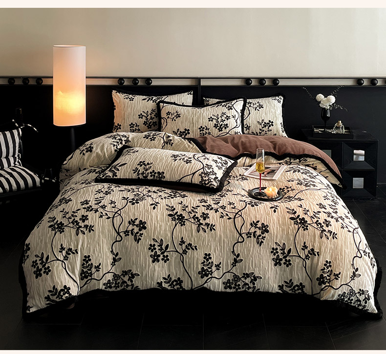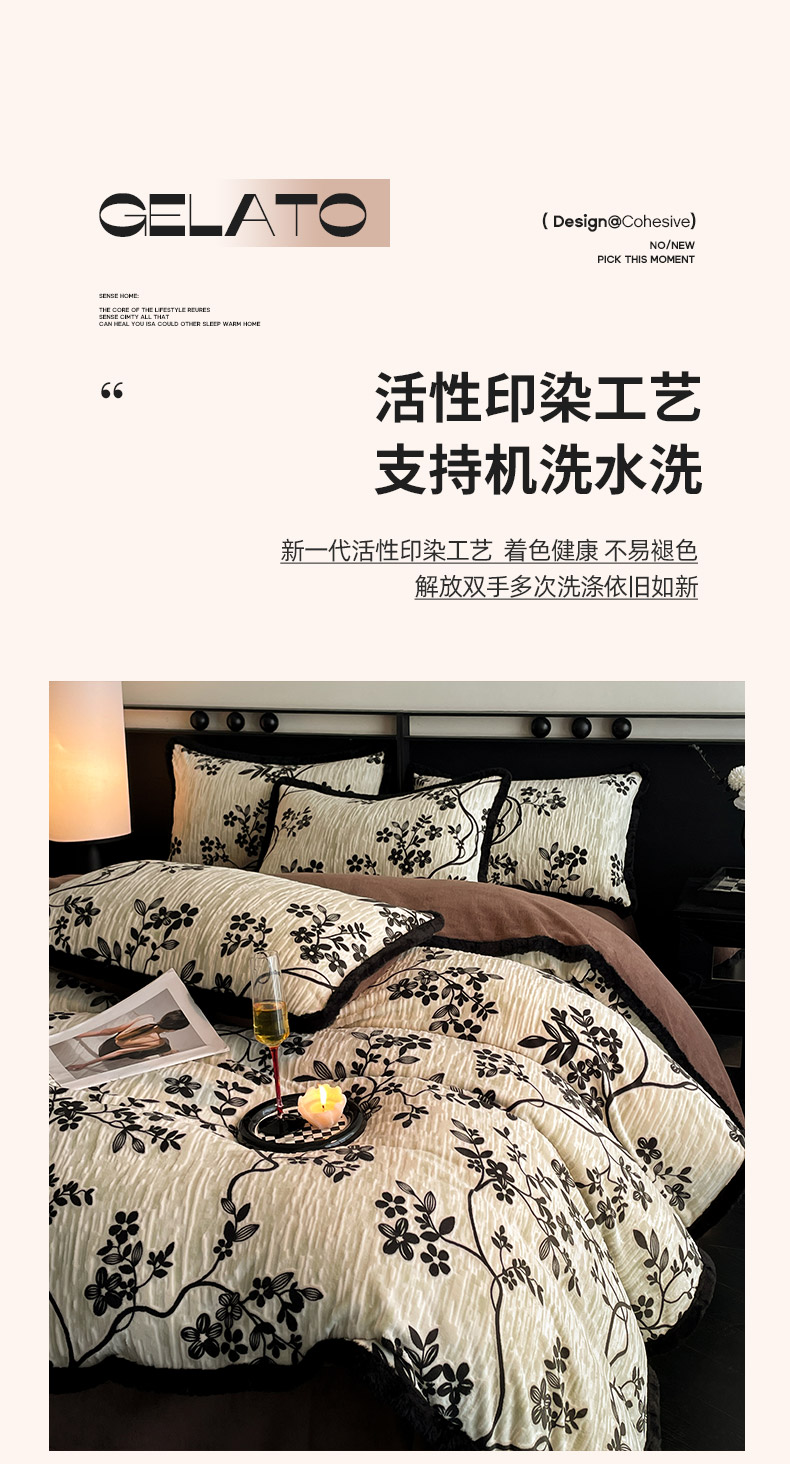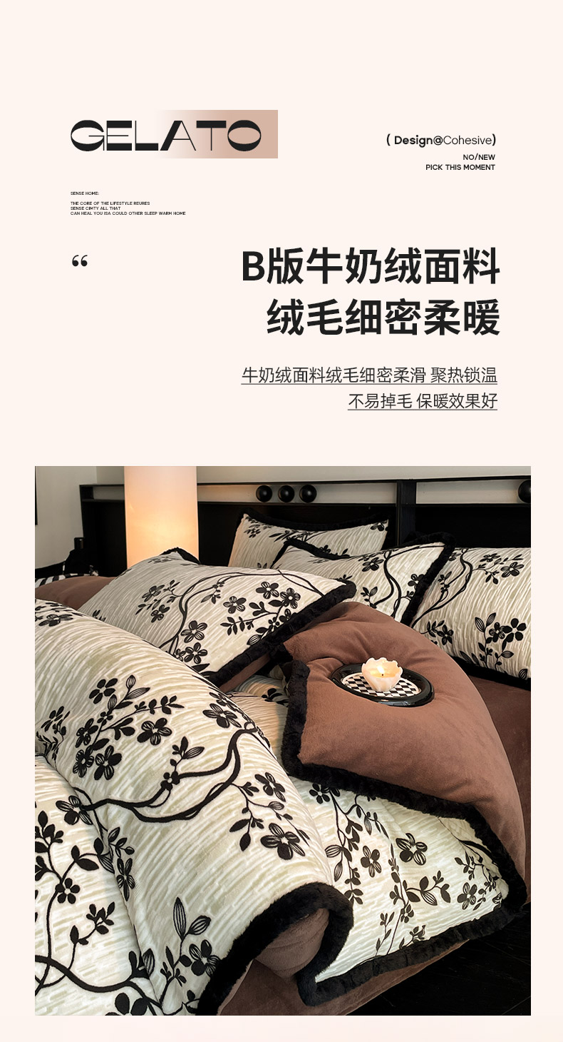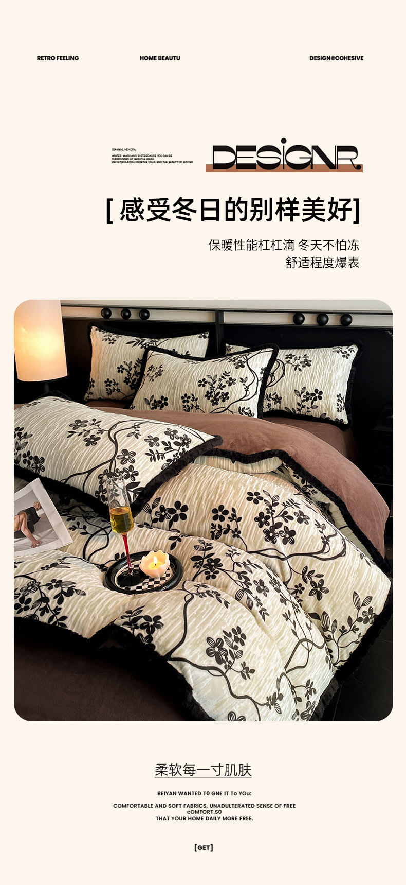 商品名称:吾秀家居 绒城 230克美拉德雕花绒四件套兔毛边牛奶绒四件套 - 黑金系列 法式情书-咖