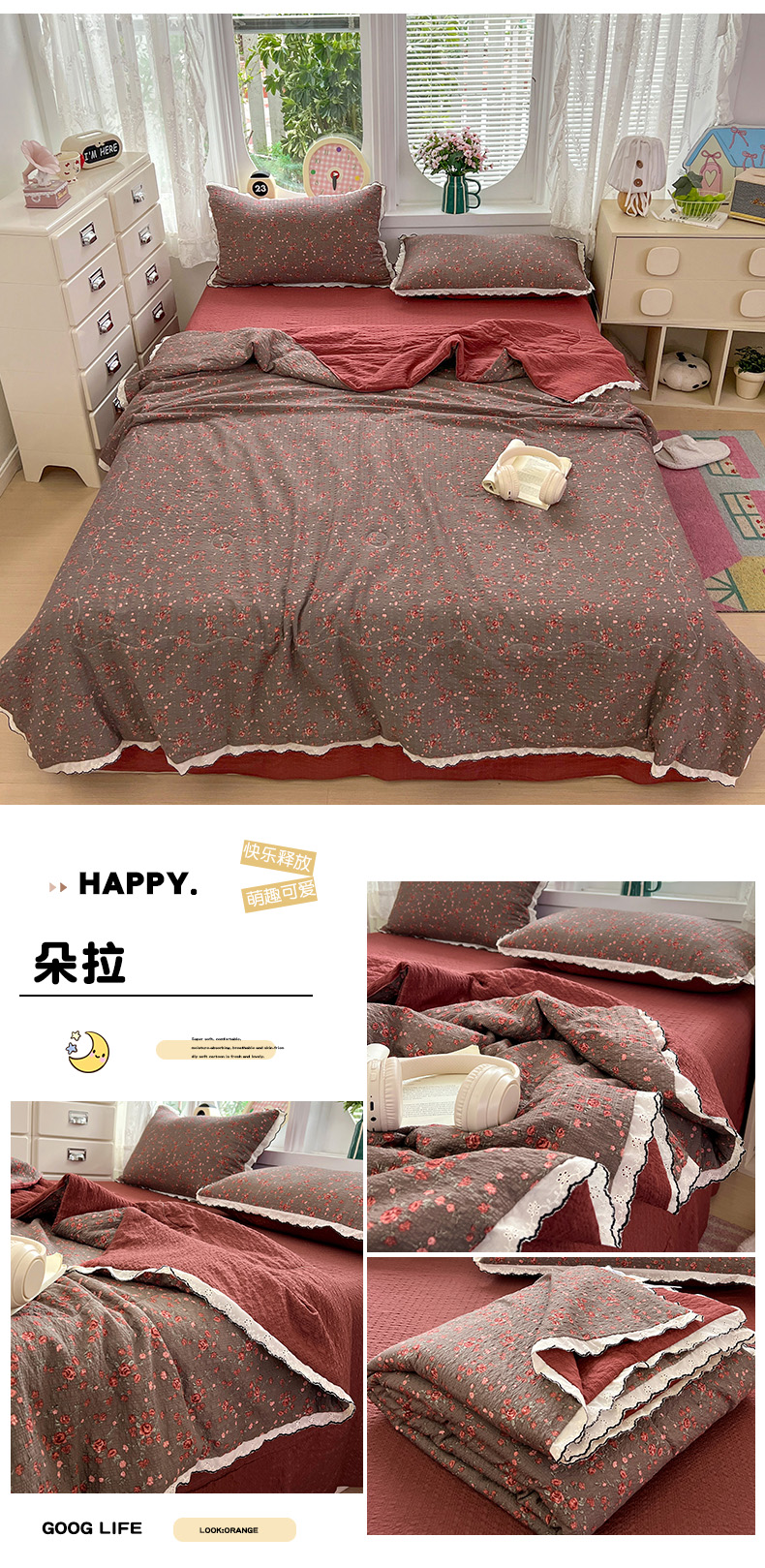 金梦拉家纺 2026新款泡芙纱全棉小黑花边夏被四件套 春日小花朵