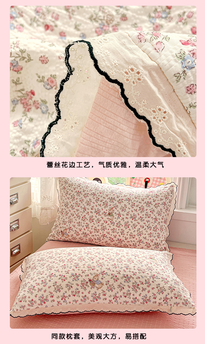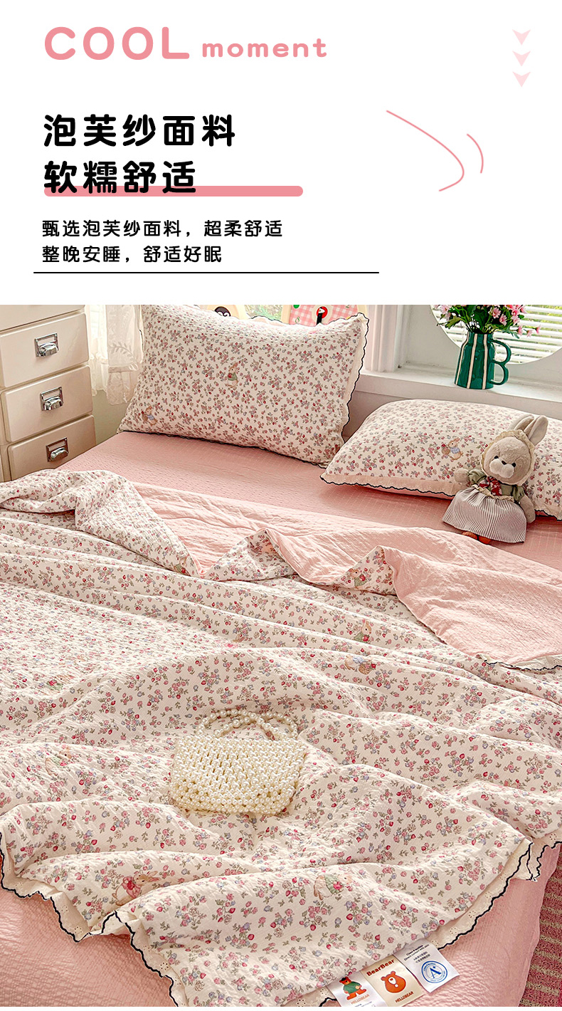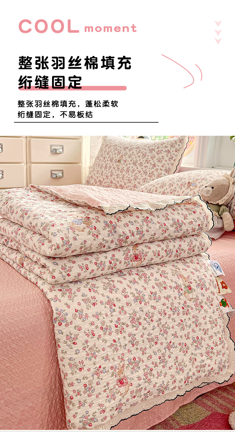 商品名称:金梦拉家纺 2026新款泡芙纱全棉小黑花边夏被四件套 甜果小兔
