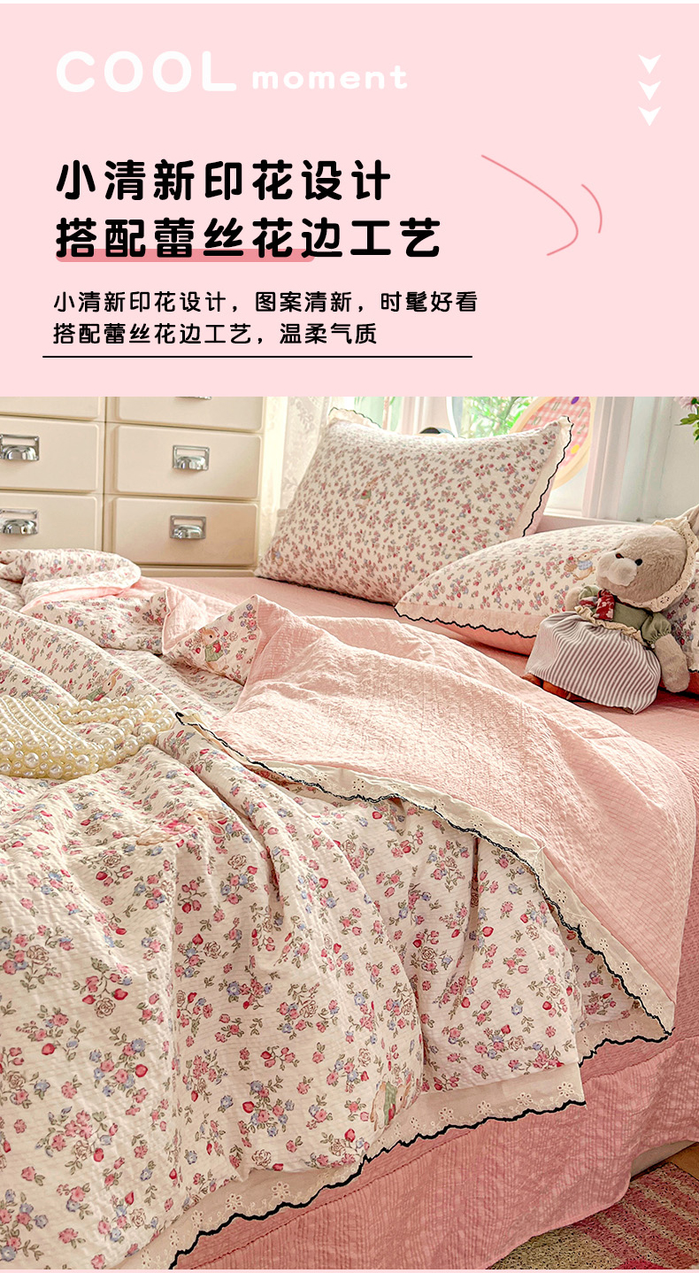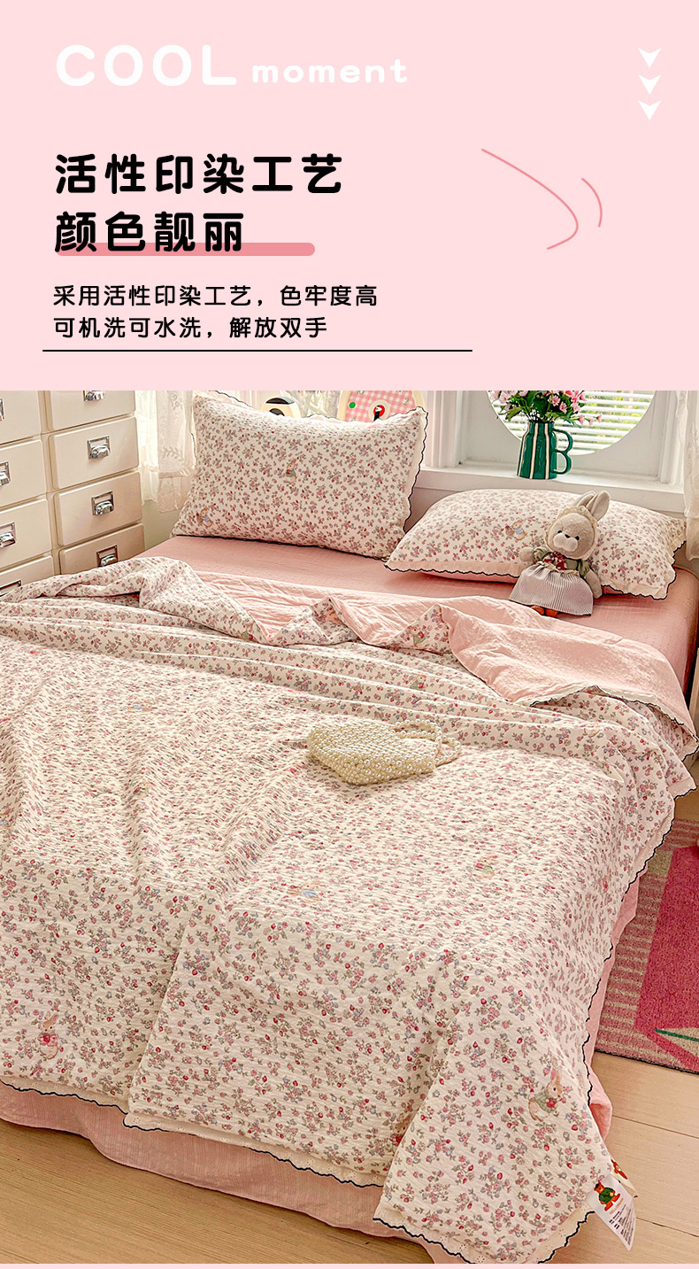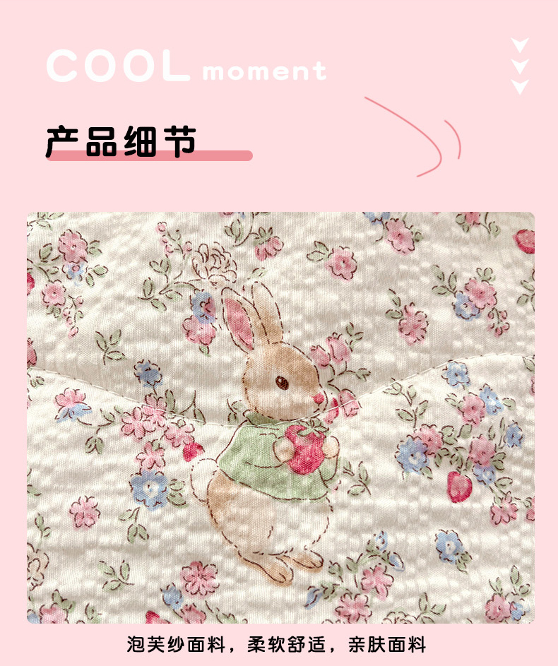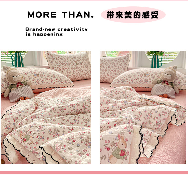 商品名称:金梦拉家纺 2026新款泡芙纱全棉小黑花边夏被四件套 甜果小兔