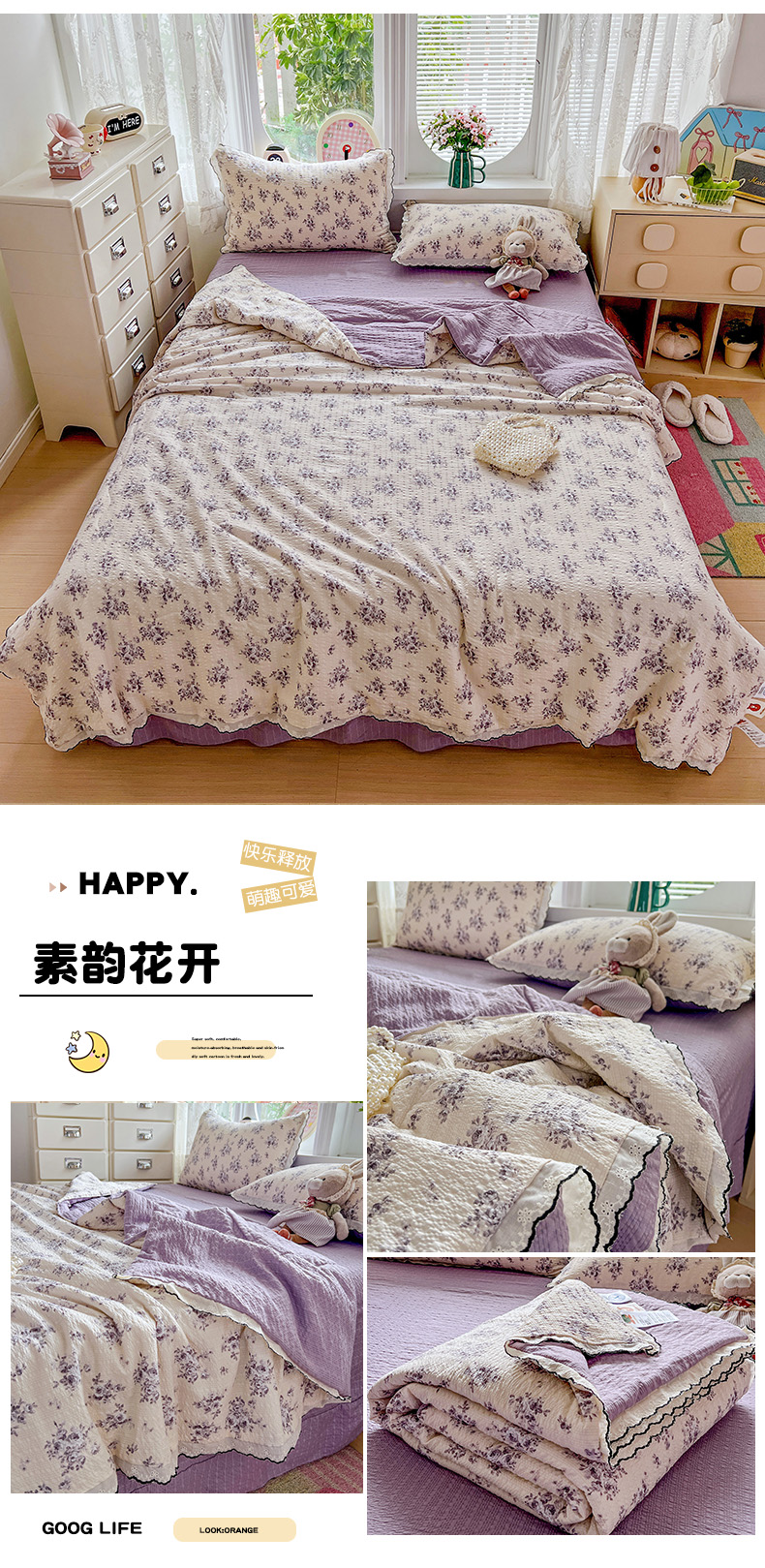 (总)2025新款A类云感提花纱布棉皱皱纱四件套(贴布风),风信子,可可栗子,快乐兔,玫瑰小能,美娜滋,蘑菇森林,淘气奶兔,紫色梦境,汪汪乐园