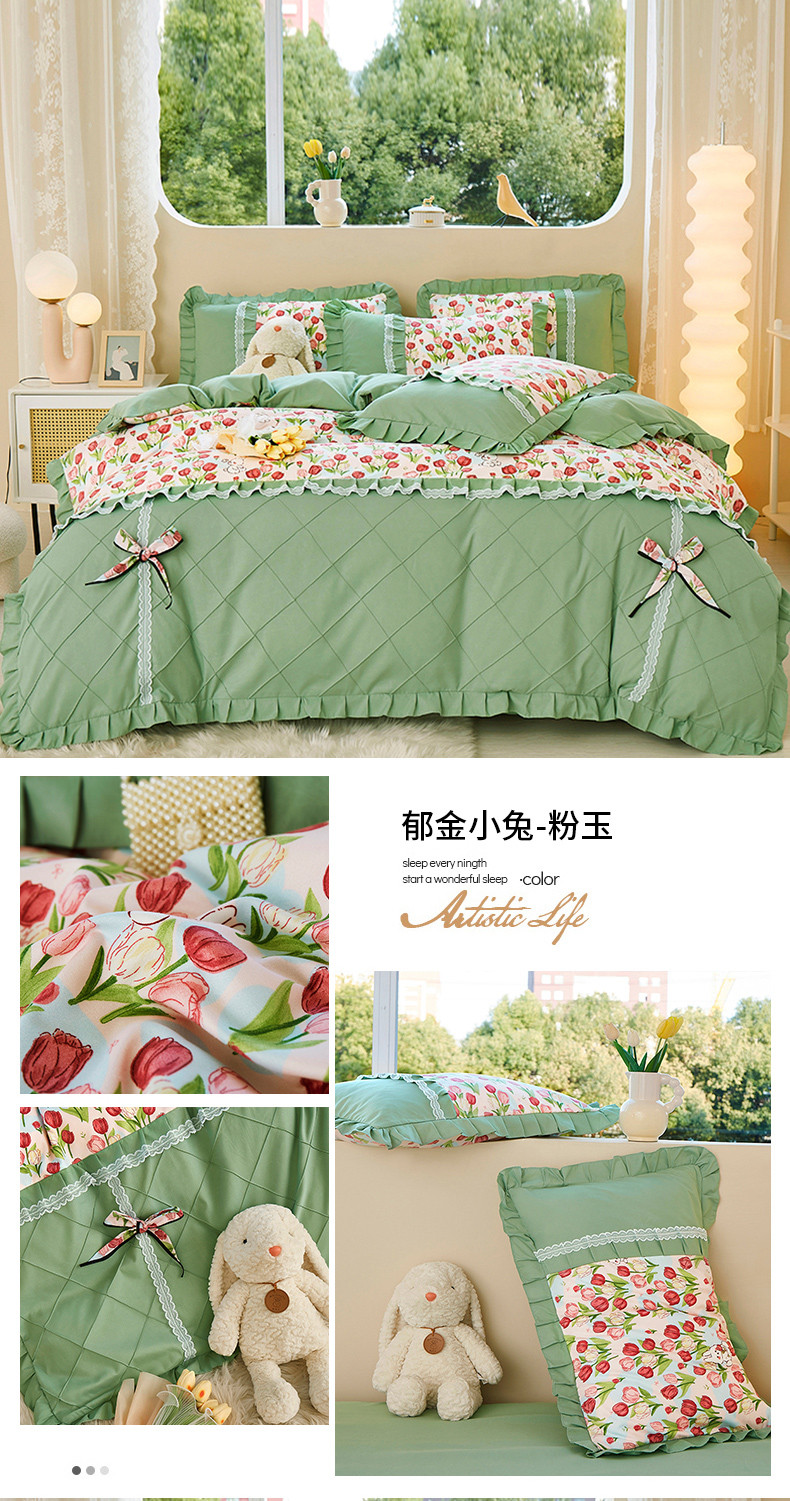 商品名称:靓生活 2023新款贡棉浪漫花边印花四件套 郁金小兔-粉玉