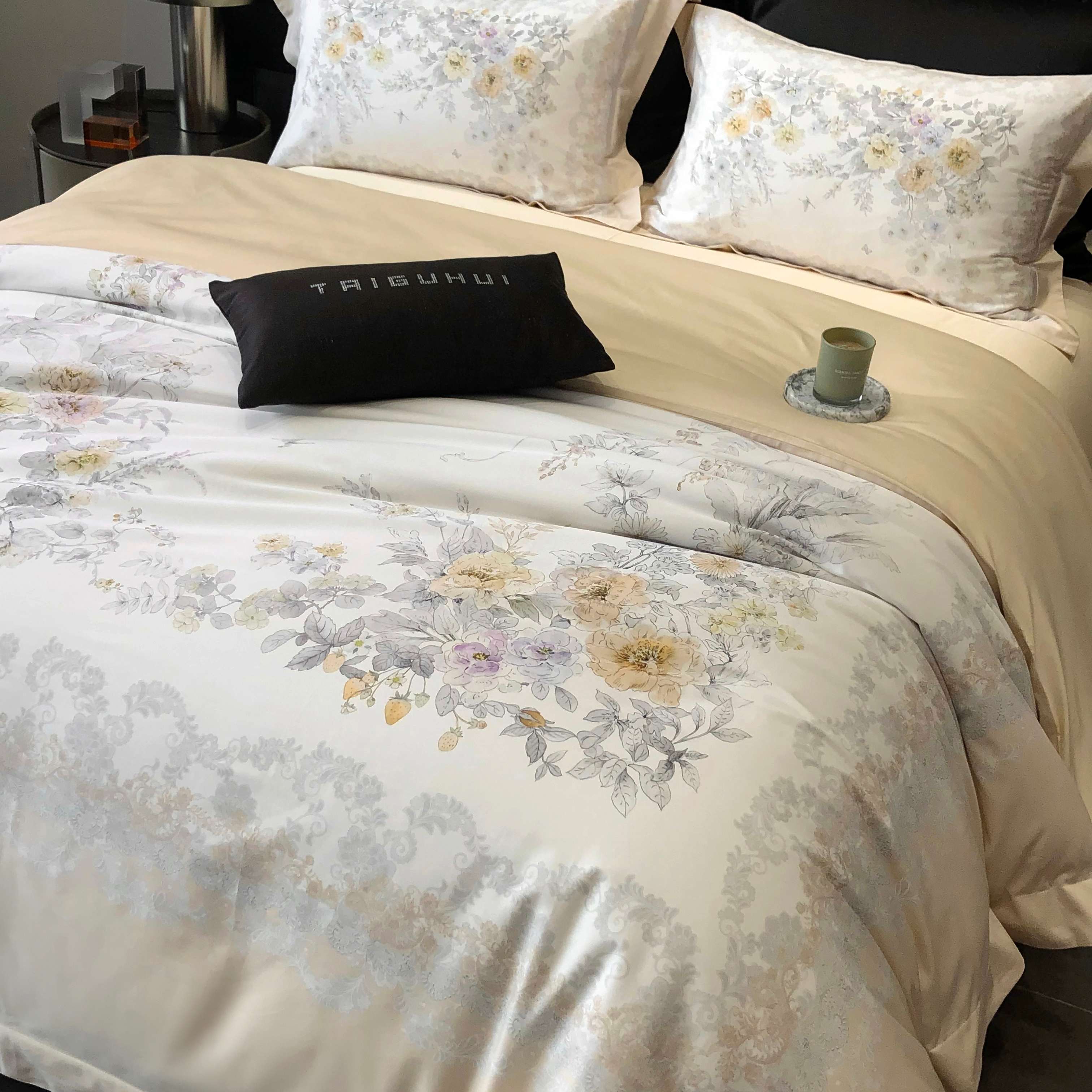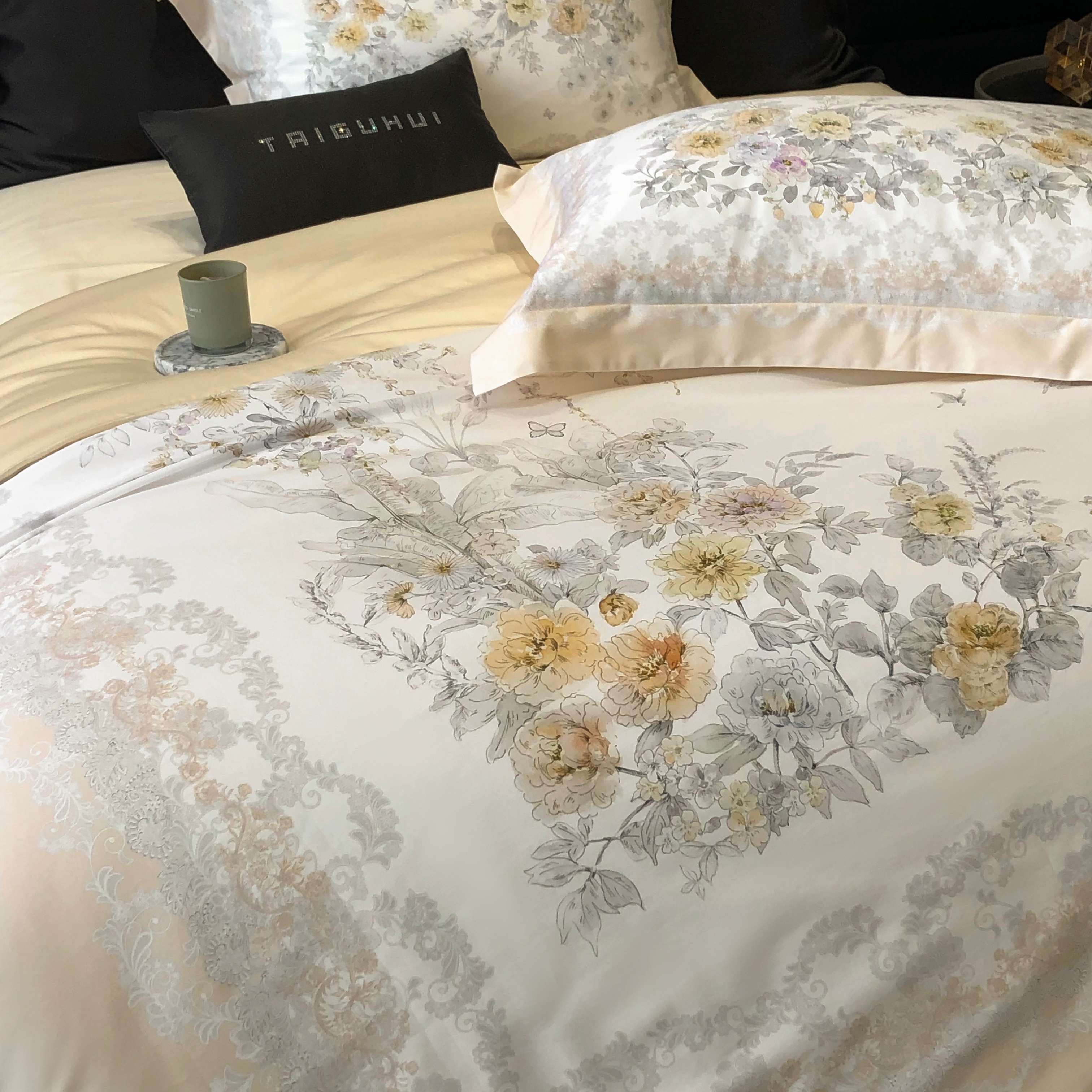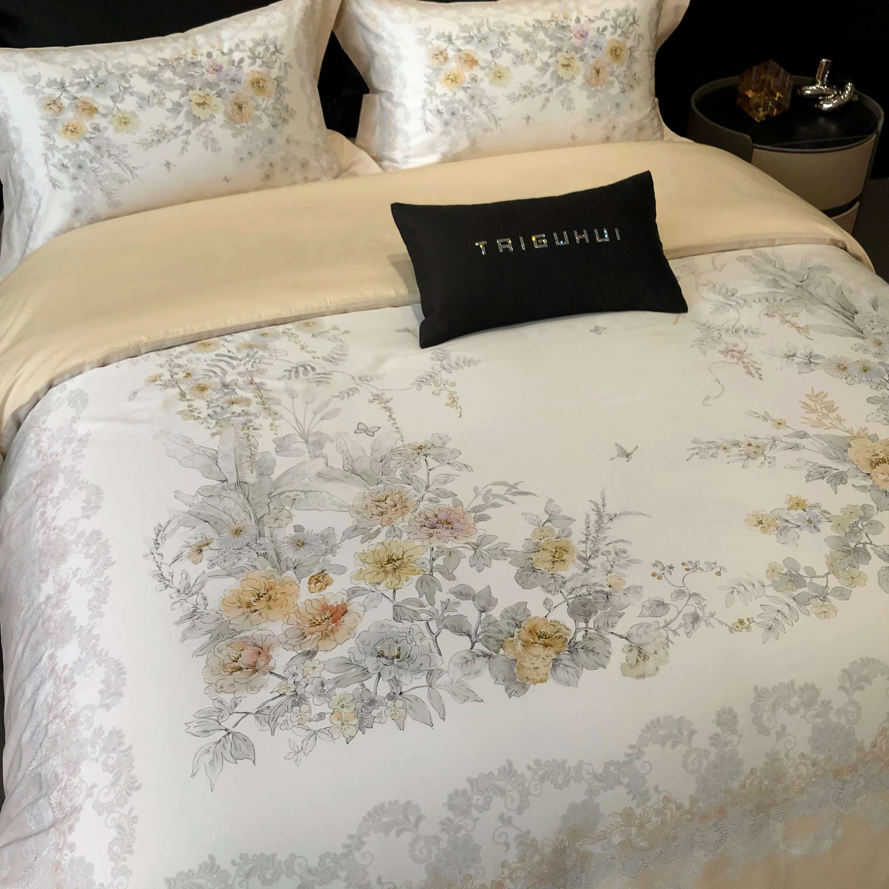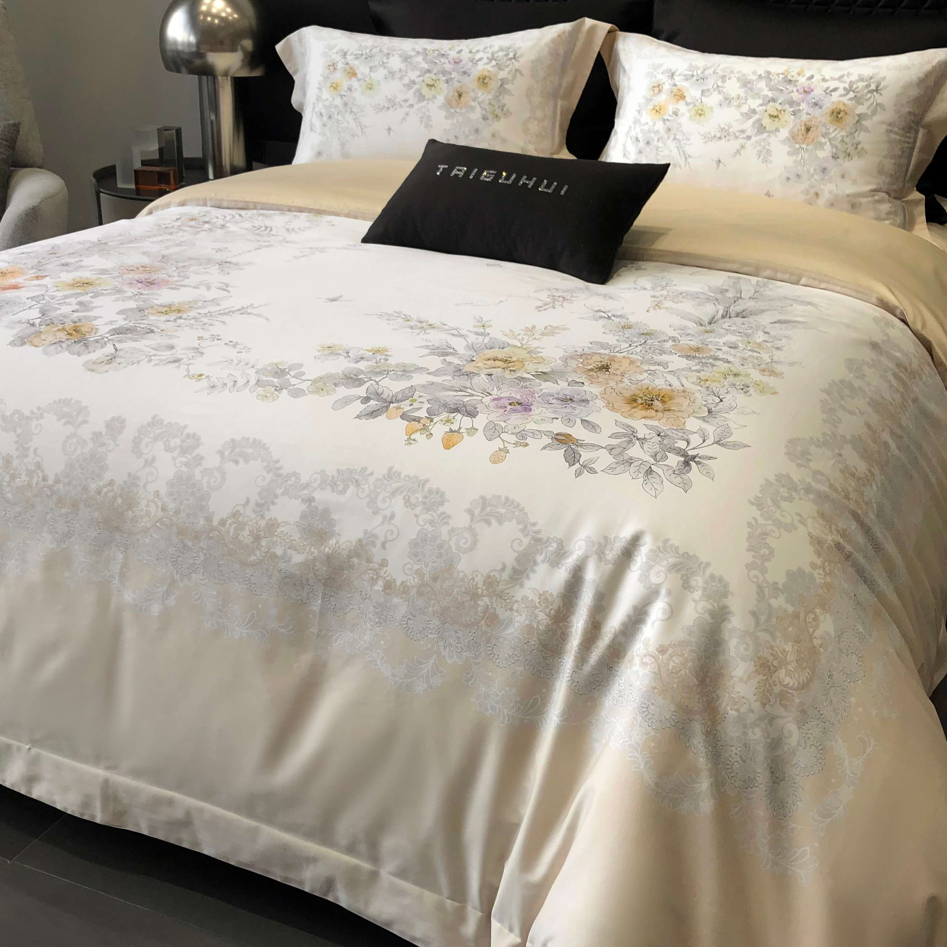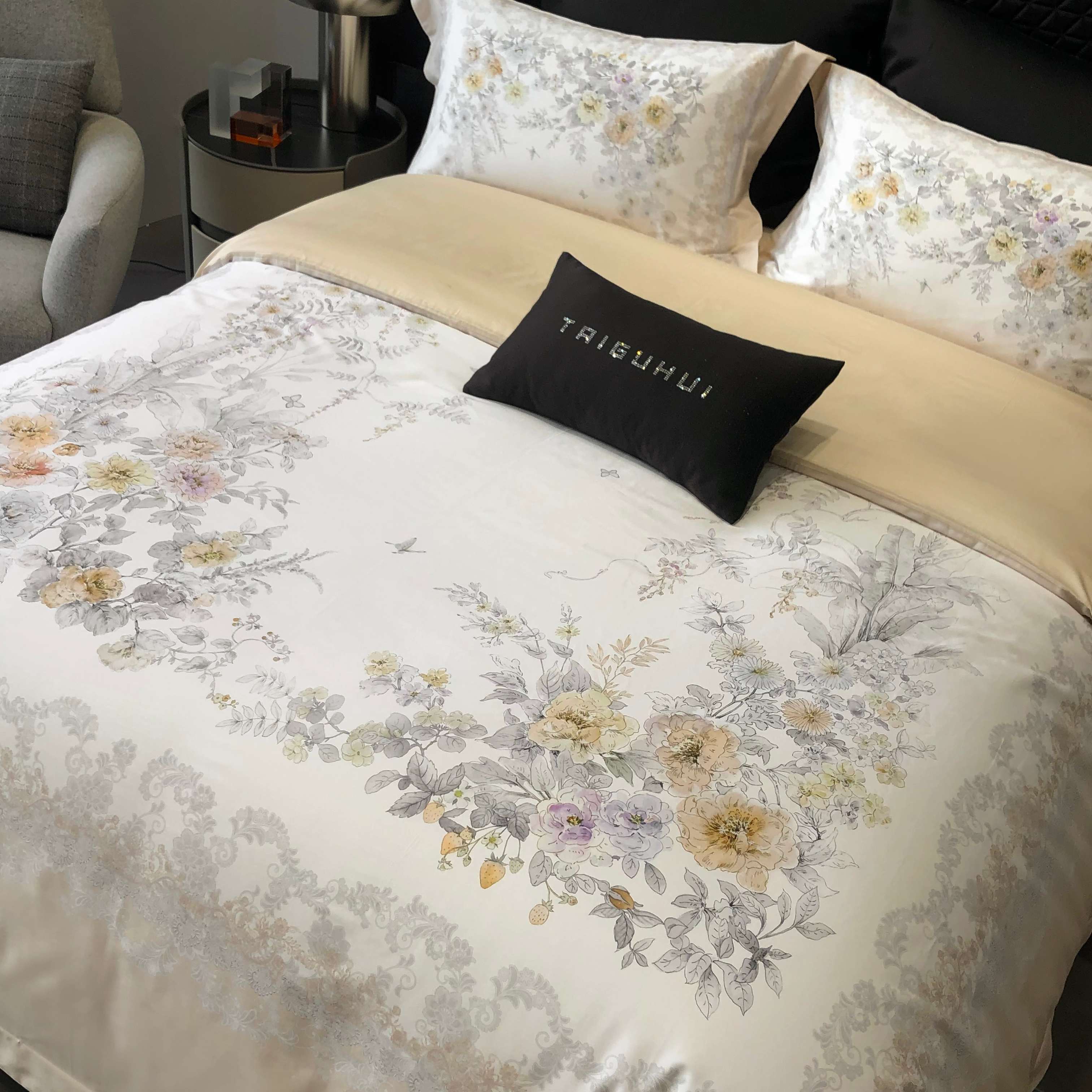 商品名称:2025新款高支高密长绒棉大版数码印花双拼系列四件套【券后不低于388】 一路繁花-米黄