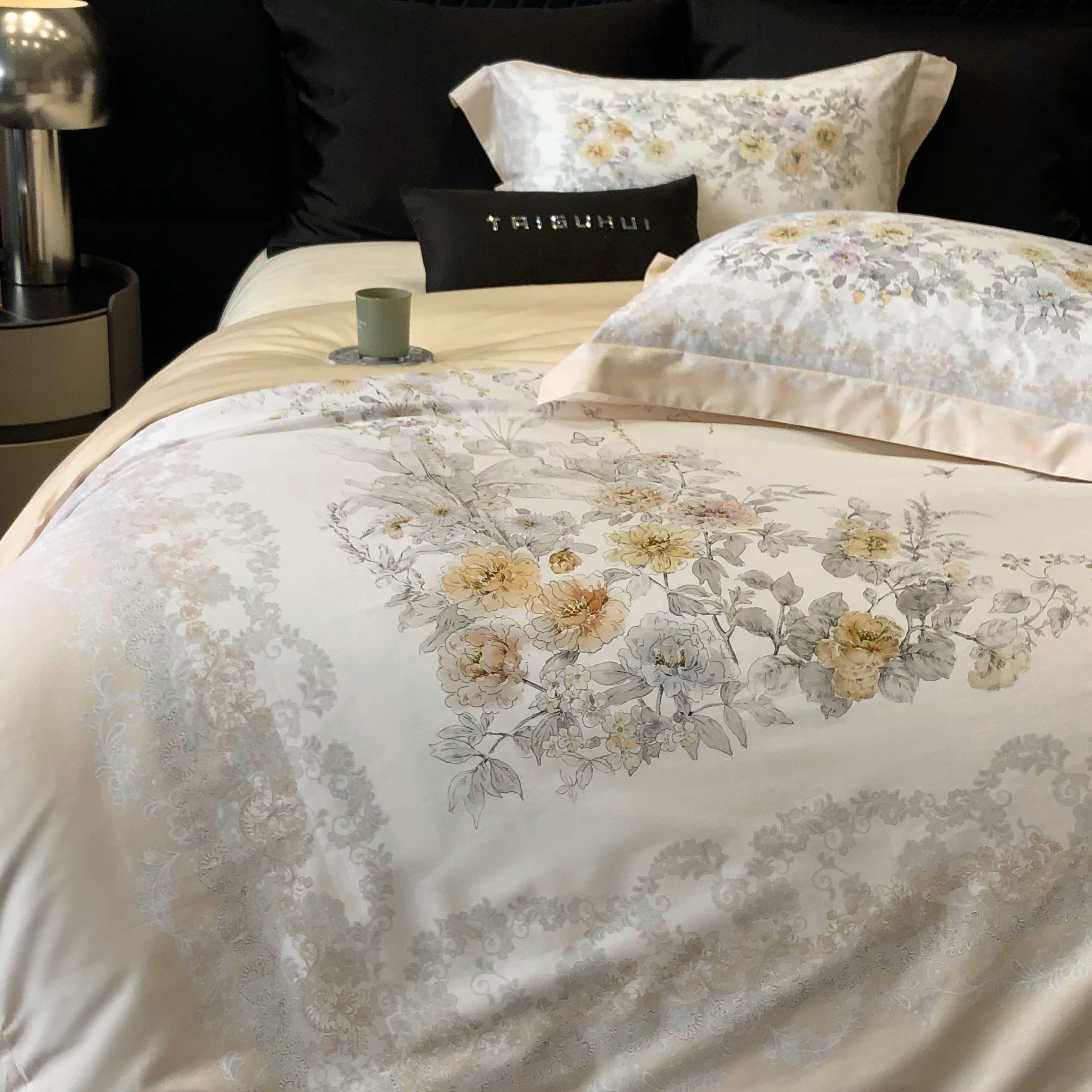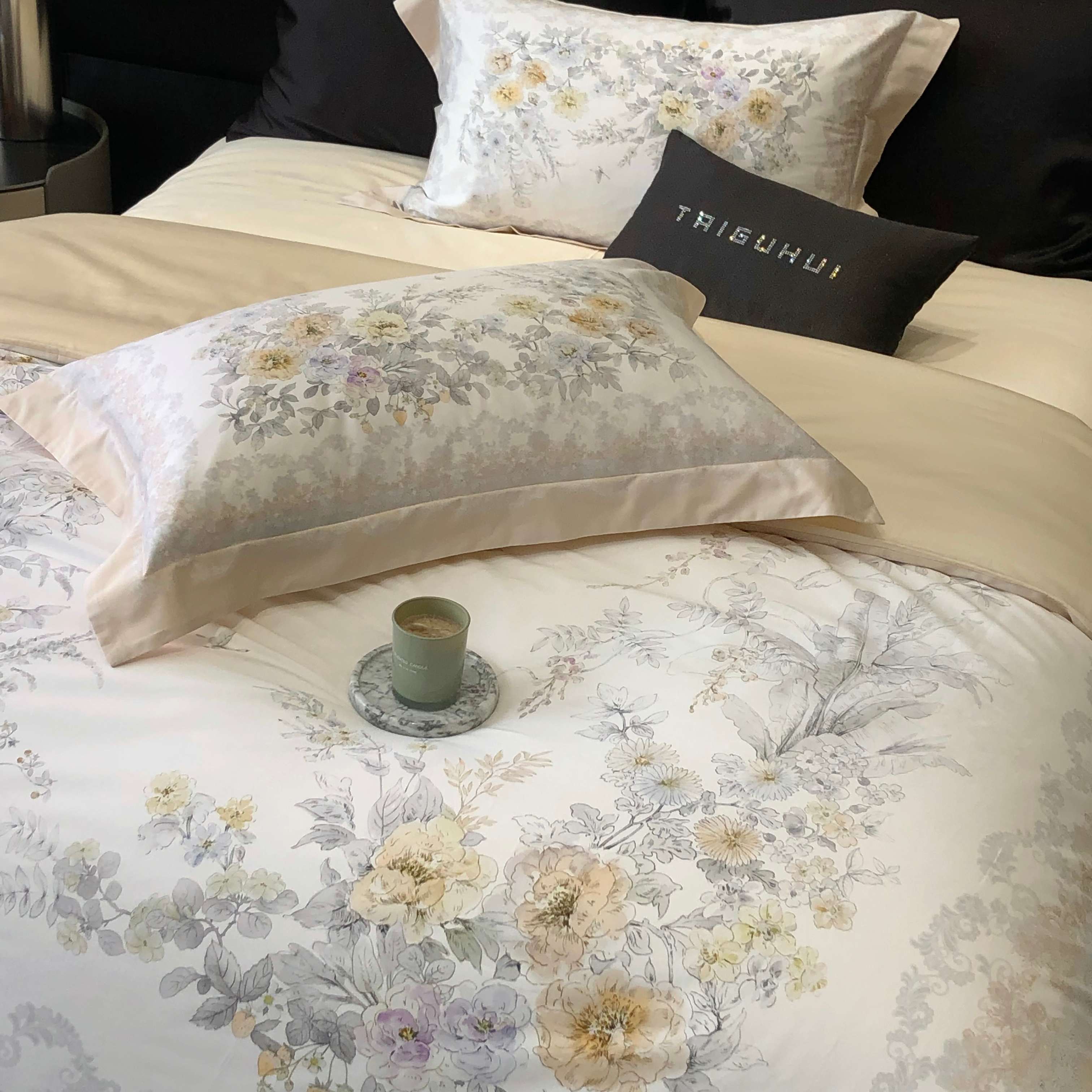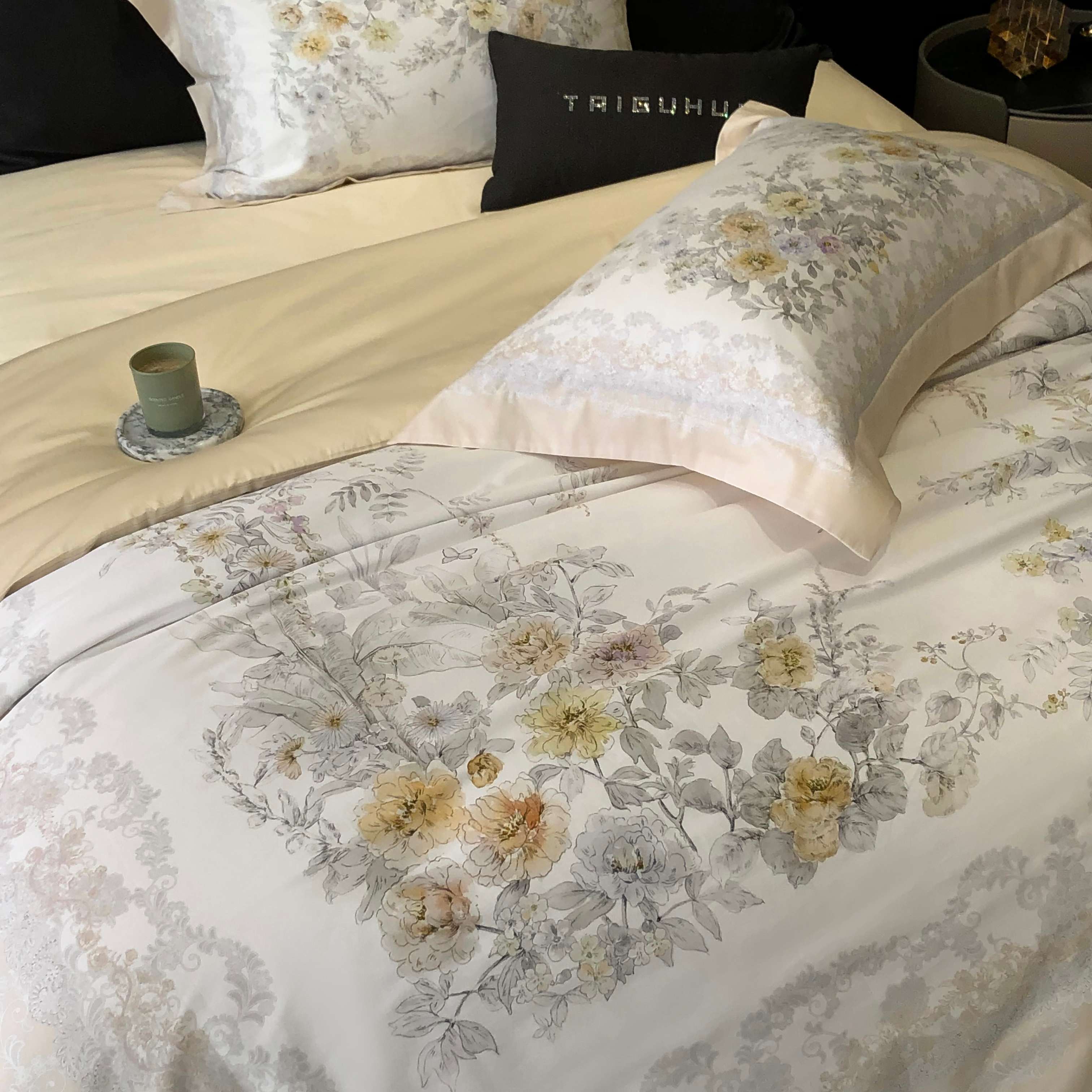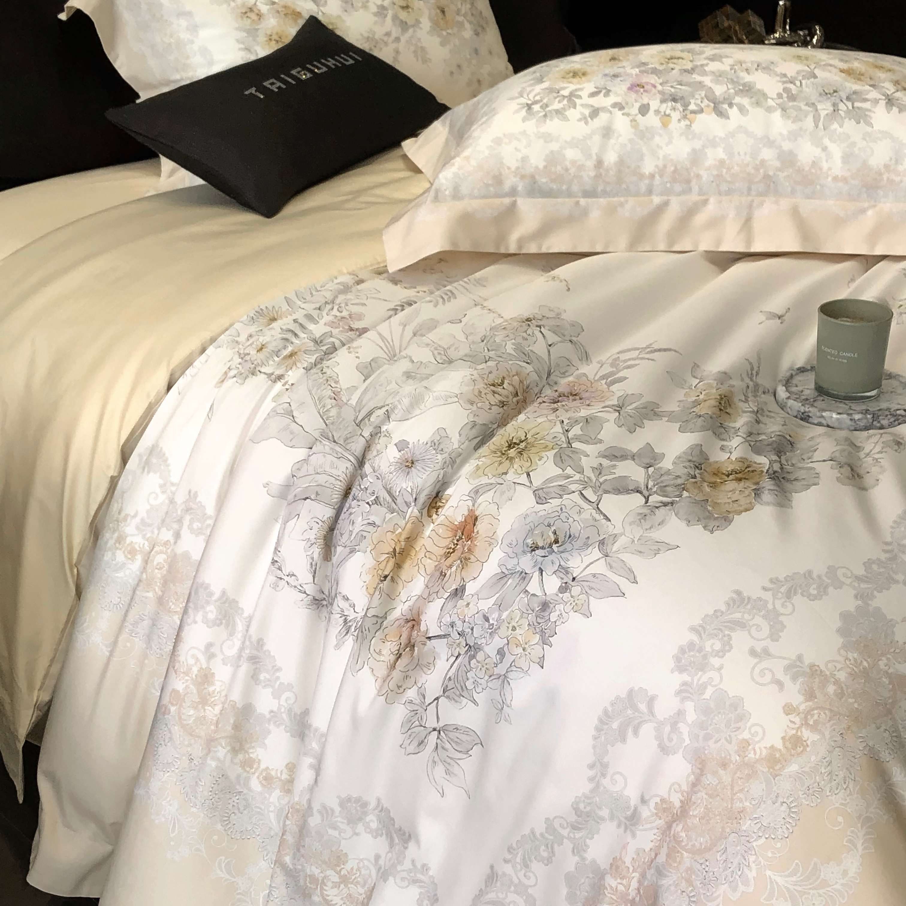 商品名称:2025新款高支高密长绒棉大版数码印花双拼系列四件套【券后不低于388】 一路繁花-米黄