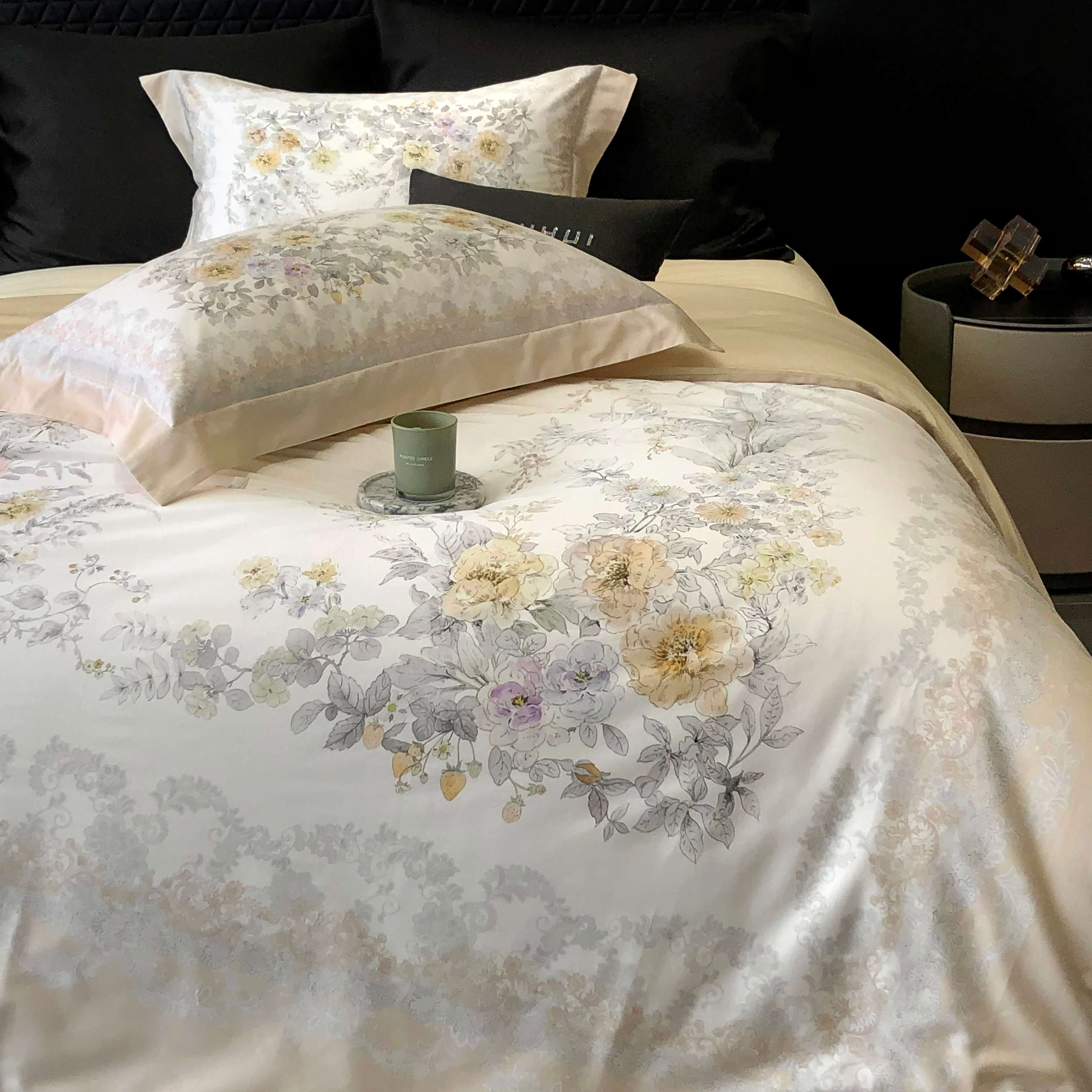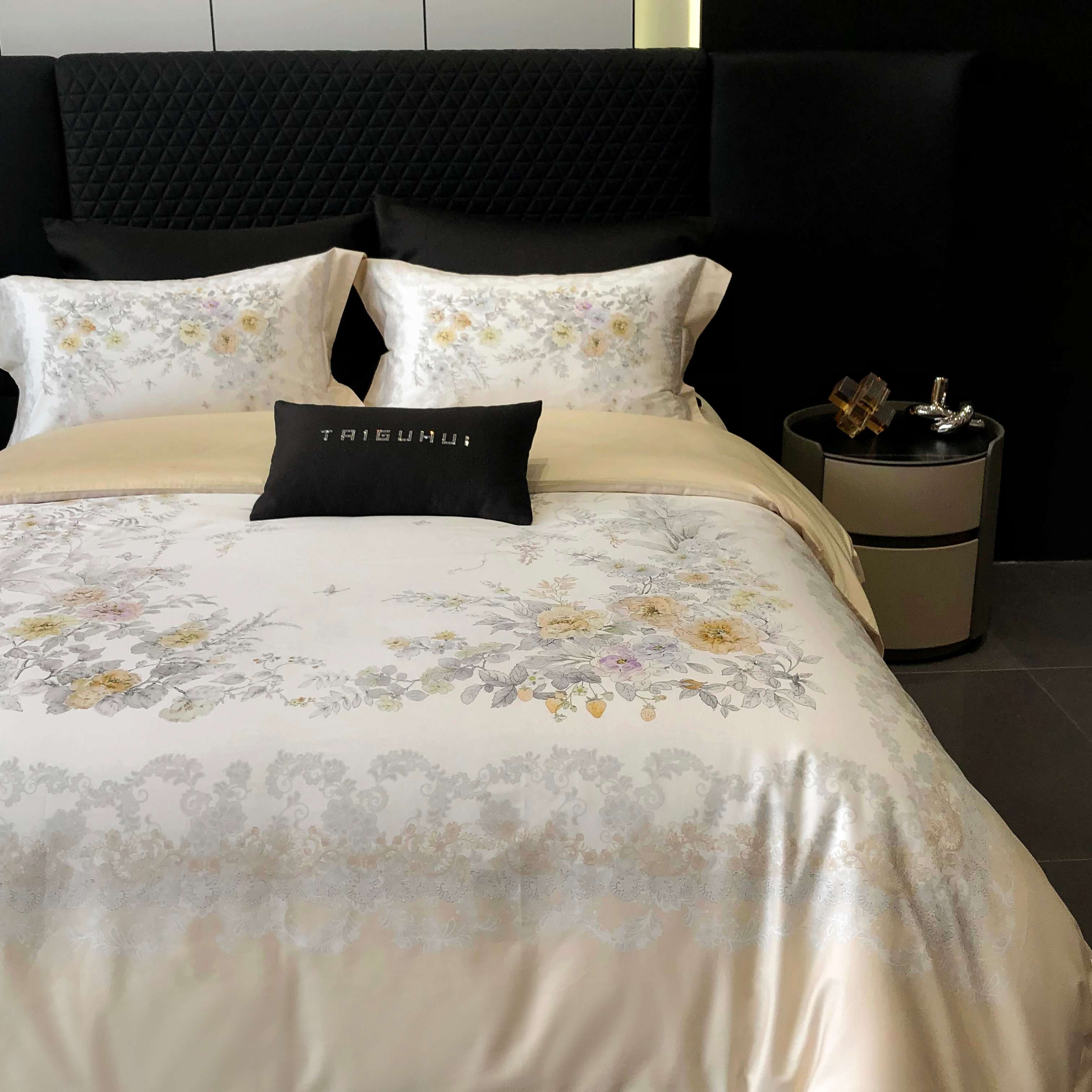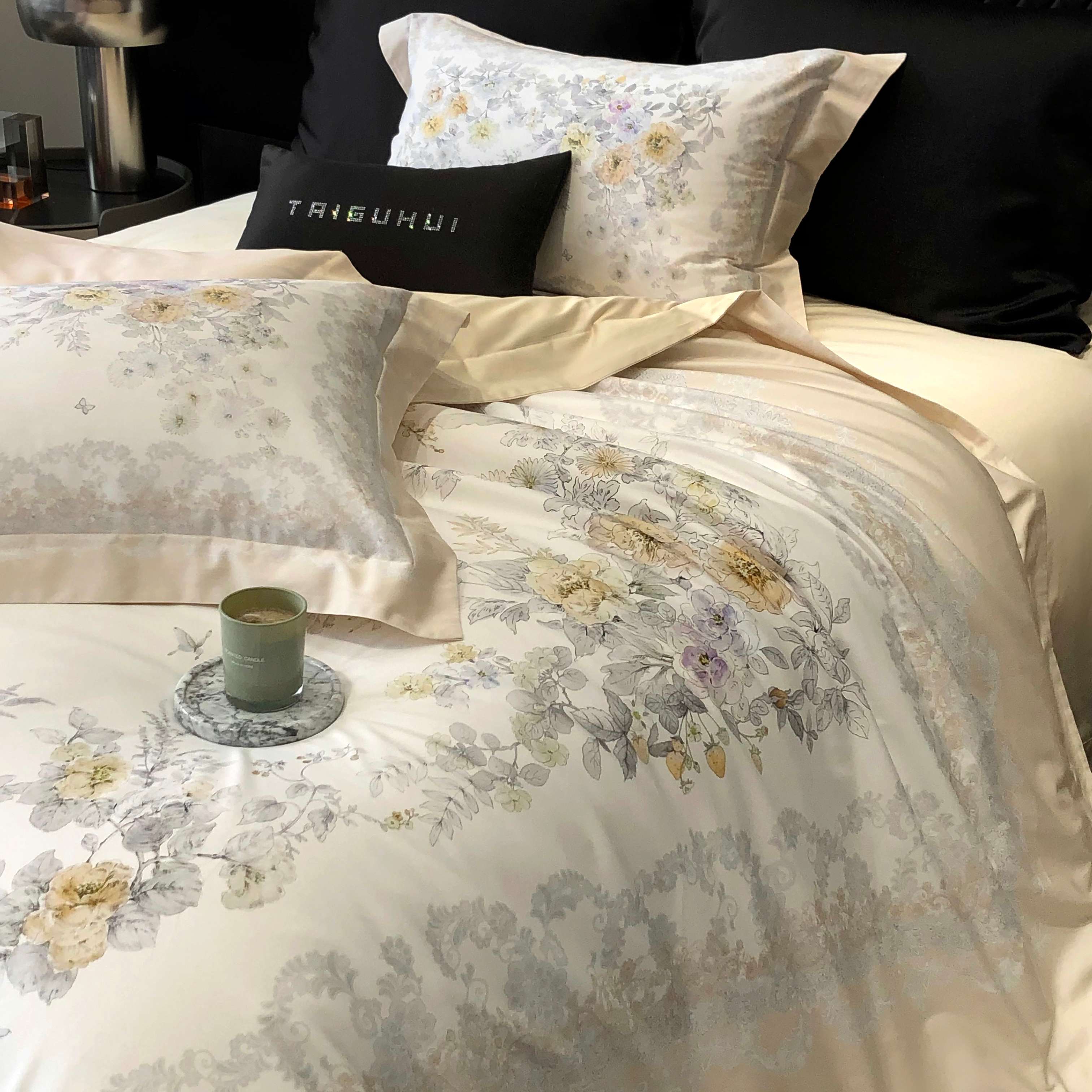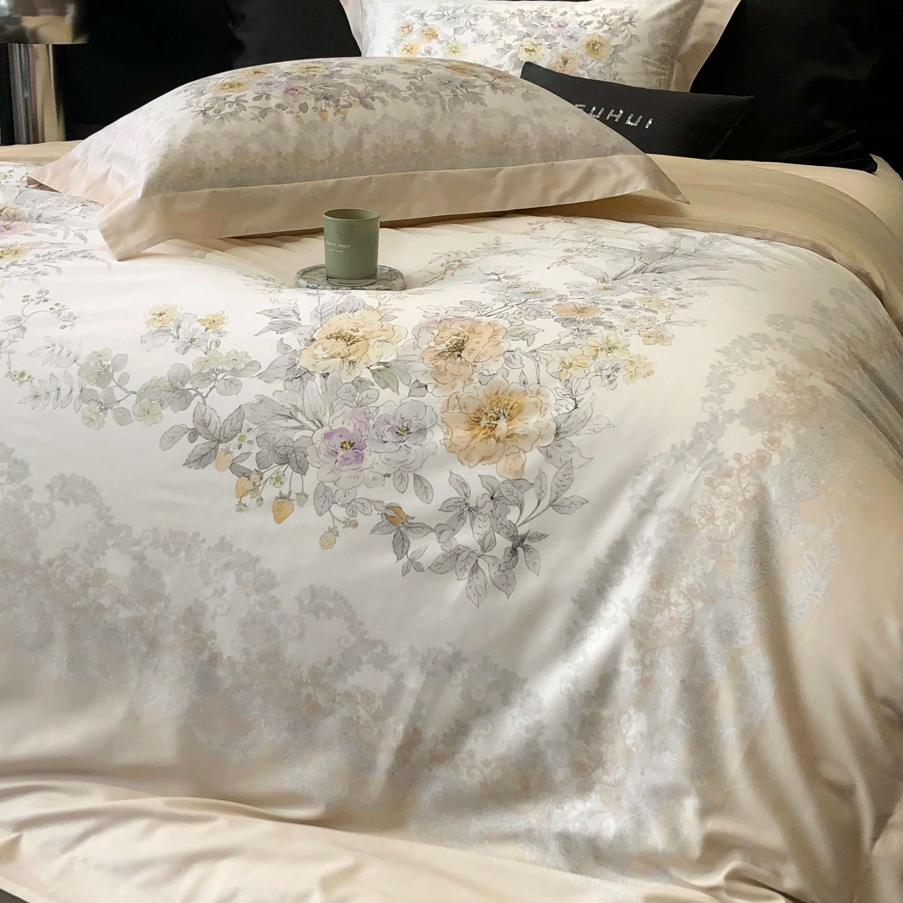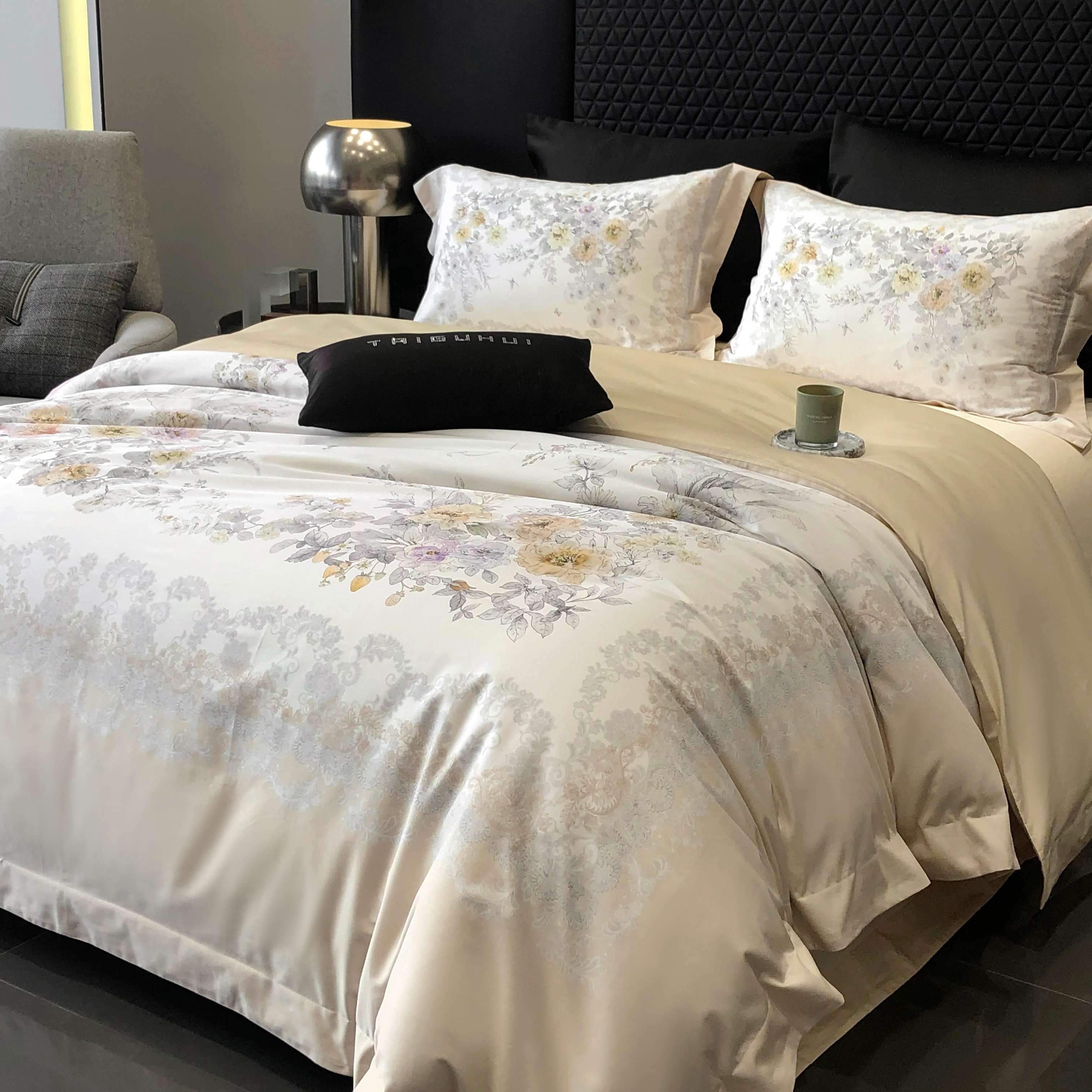 商品名称:2025新款高支高密长绒棉大版数码印花双拼系列四件套【券后不低于388】 一路繁花-米黄