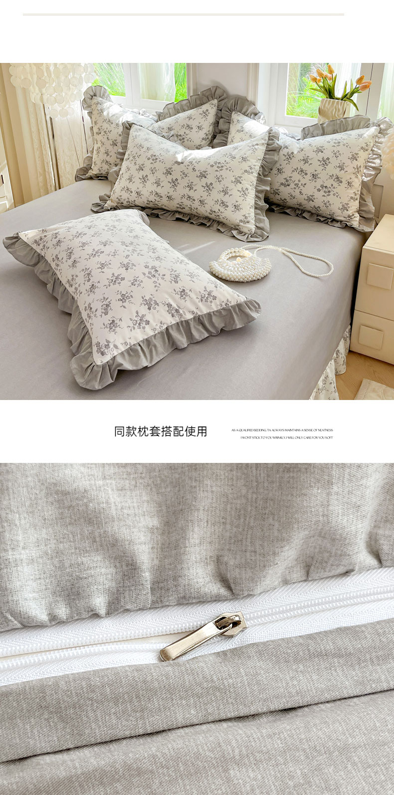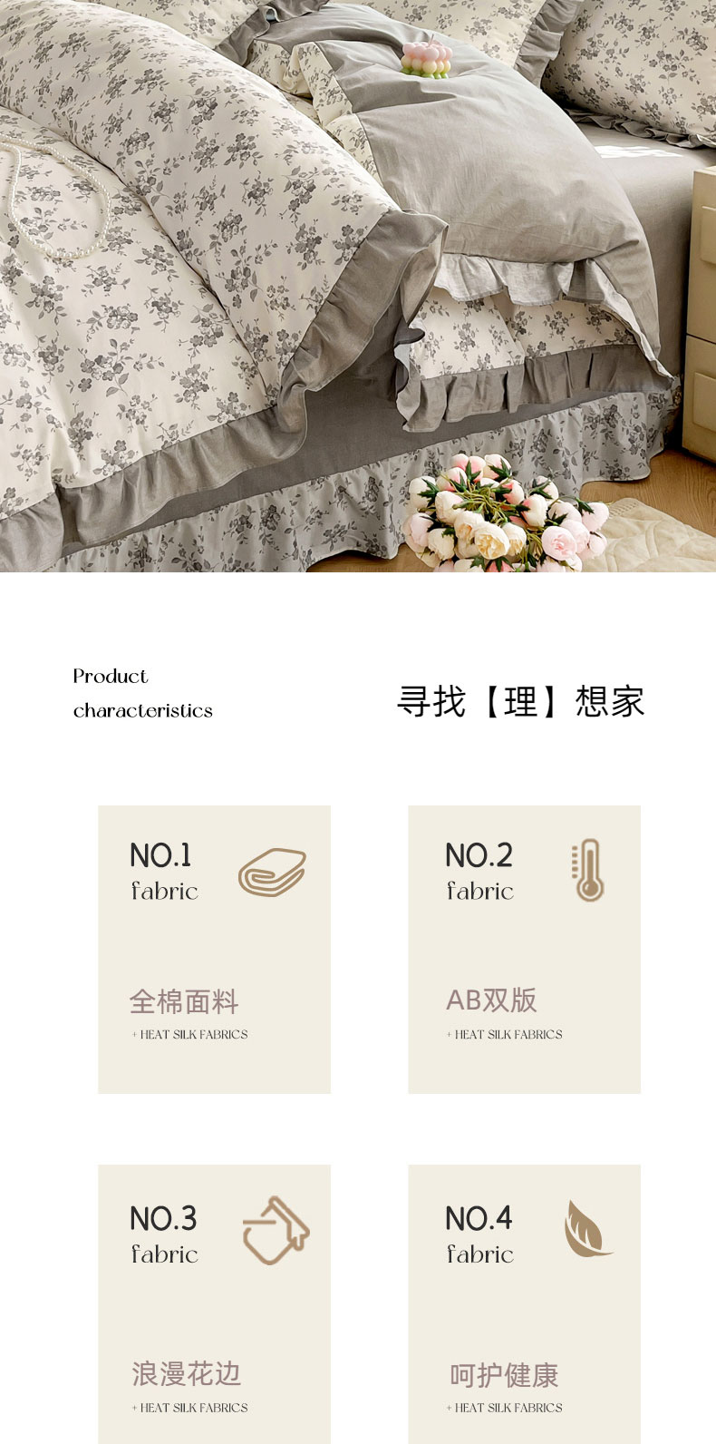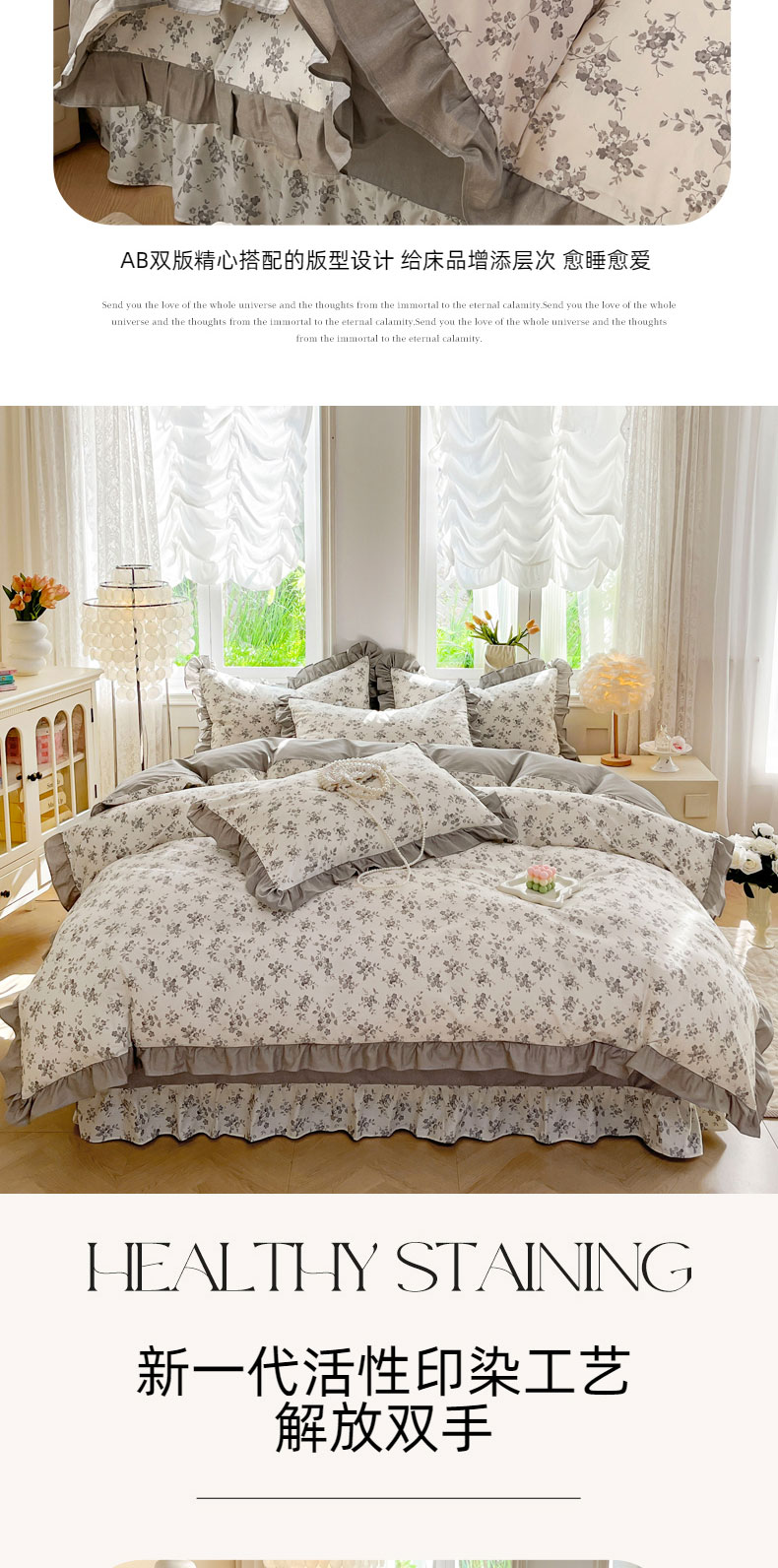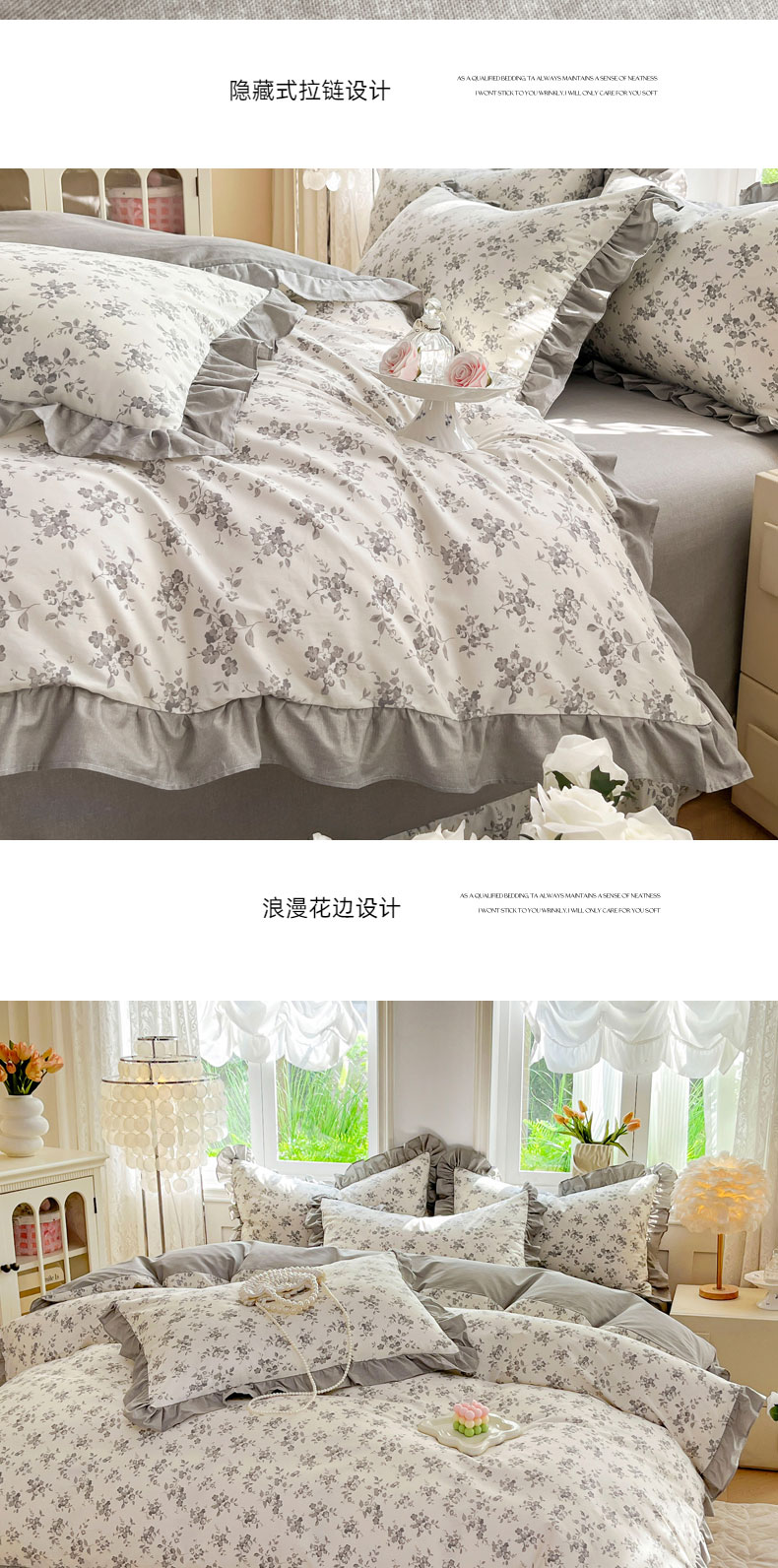 当前位置: 91家纺网 > 商品网购 > 床品套件 > 四件套 > 全棉普通四件套 > 兴美佳家纺 2026新款全棉印花韩版花边床裙款四件套 花开半夏-灰