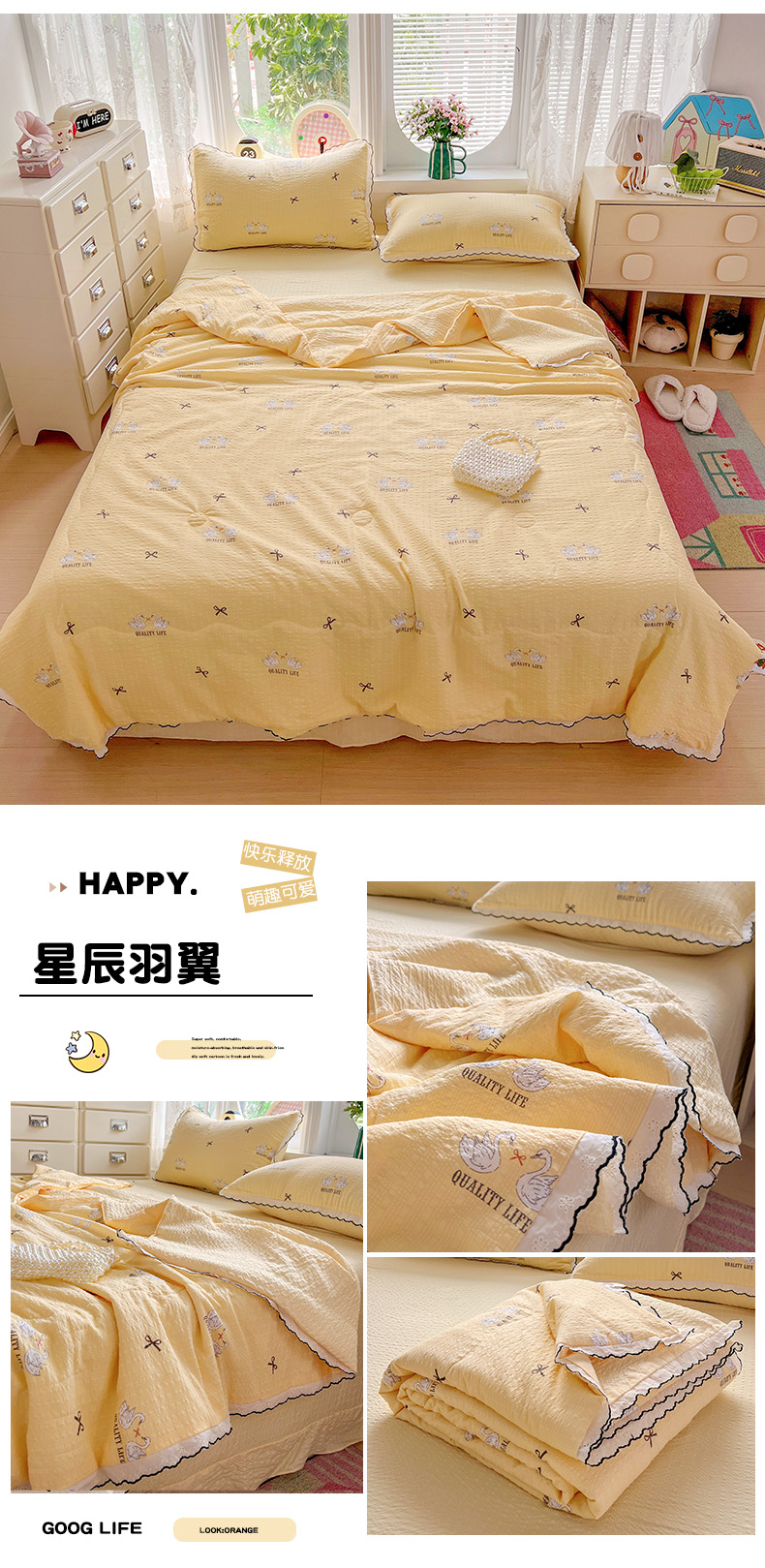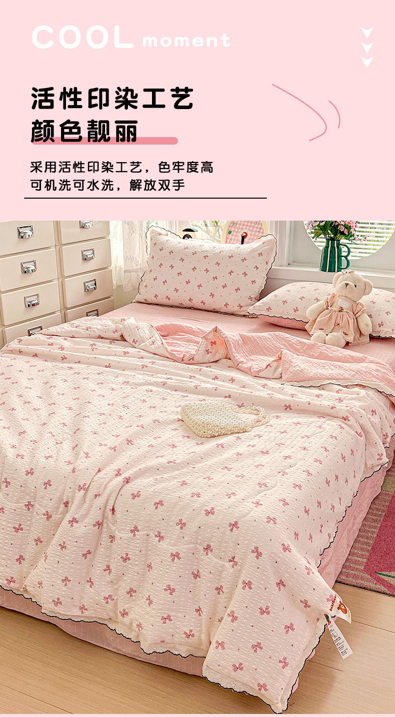 商品名称:金梦拉家纺 2026新款泡芙纱全棉小黑花边夏被四件套 心动信号