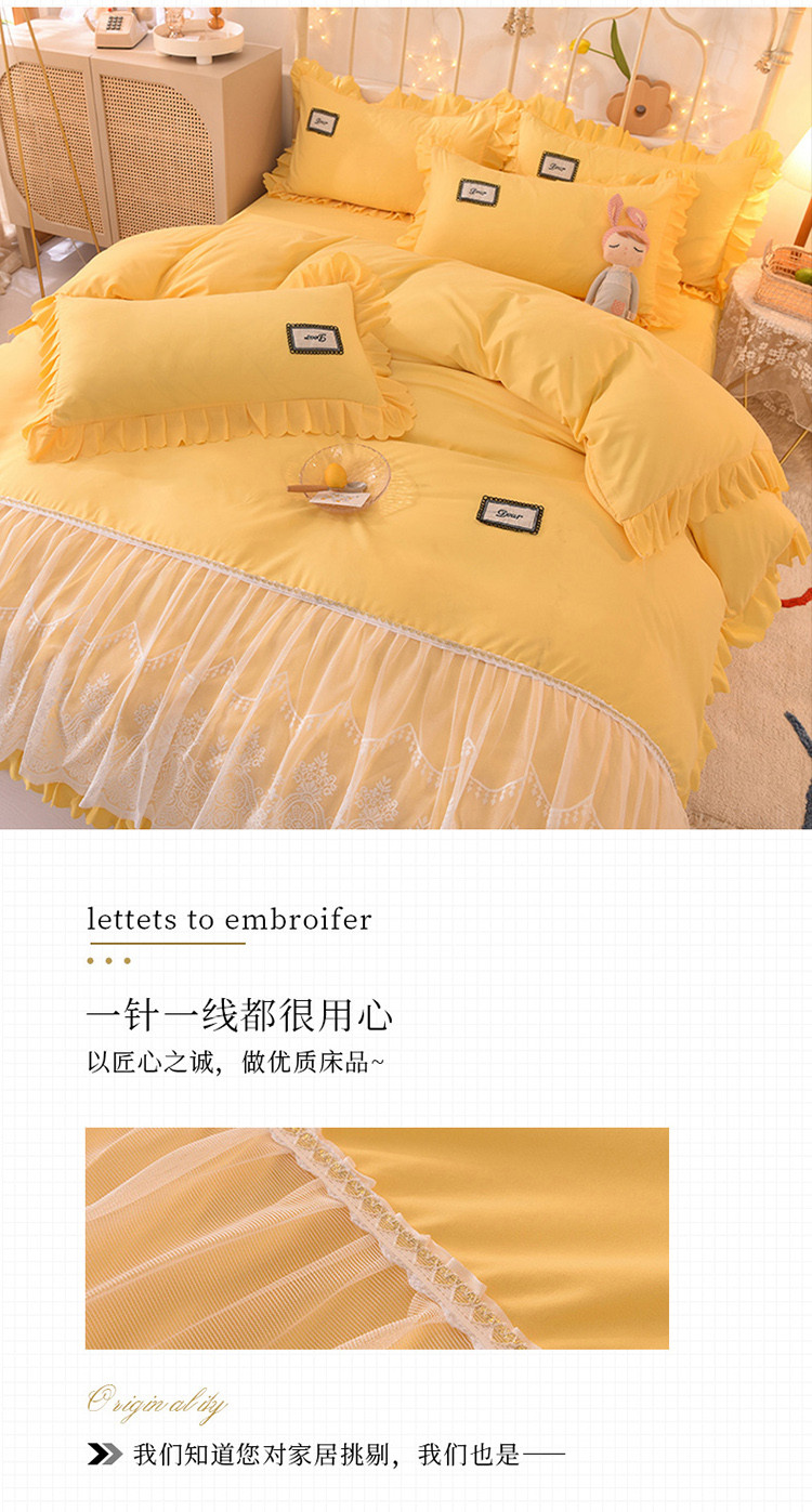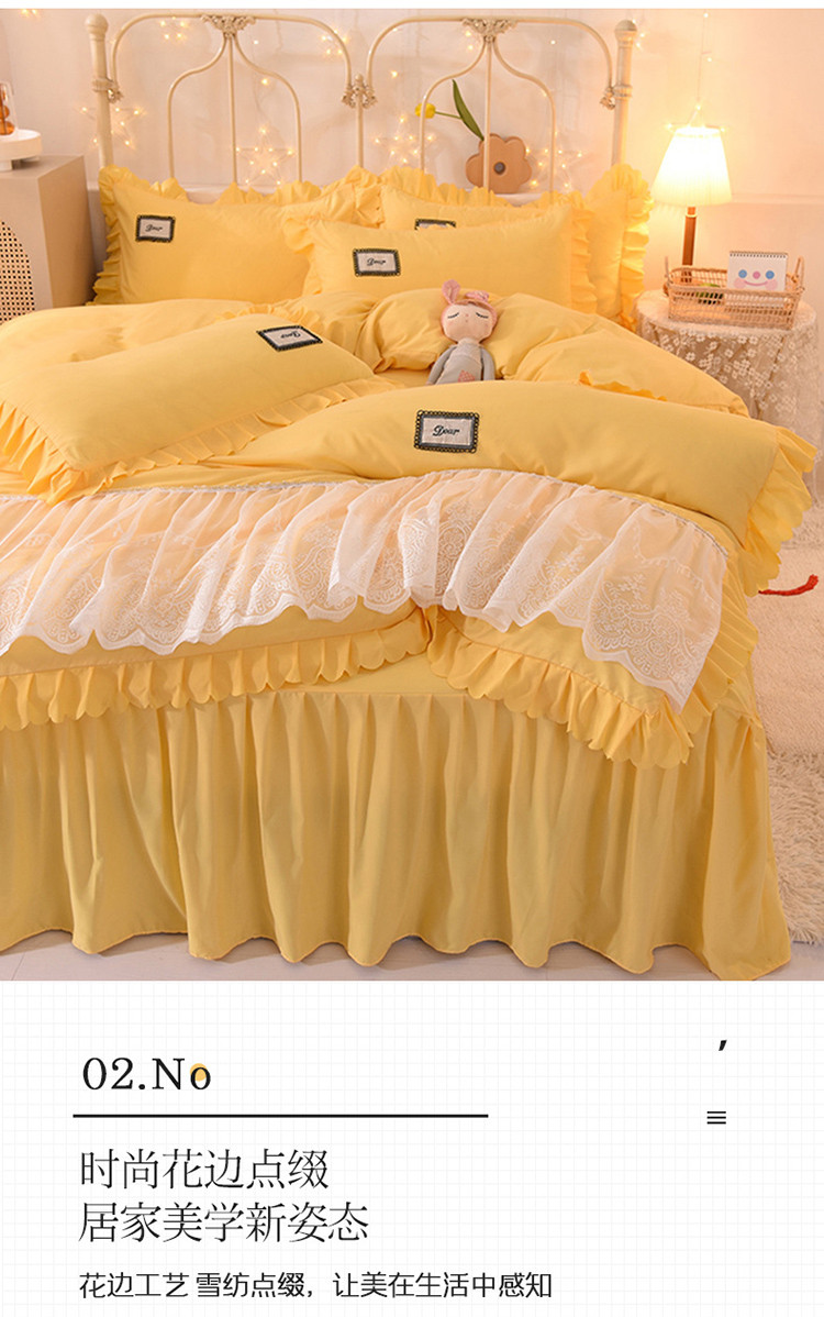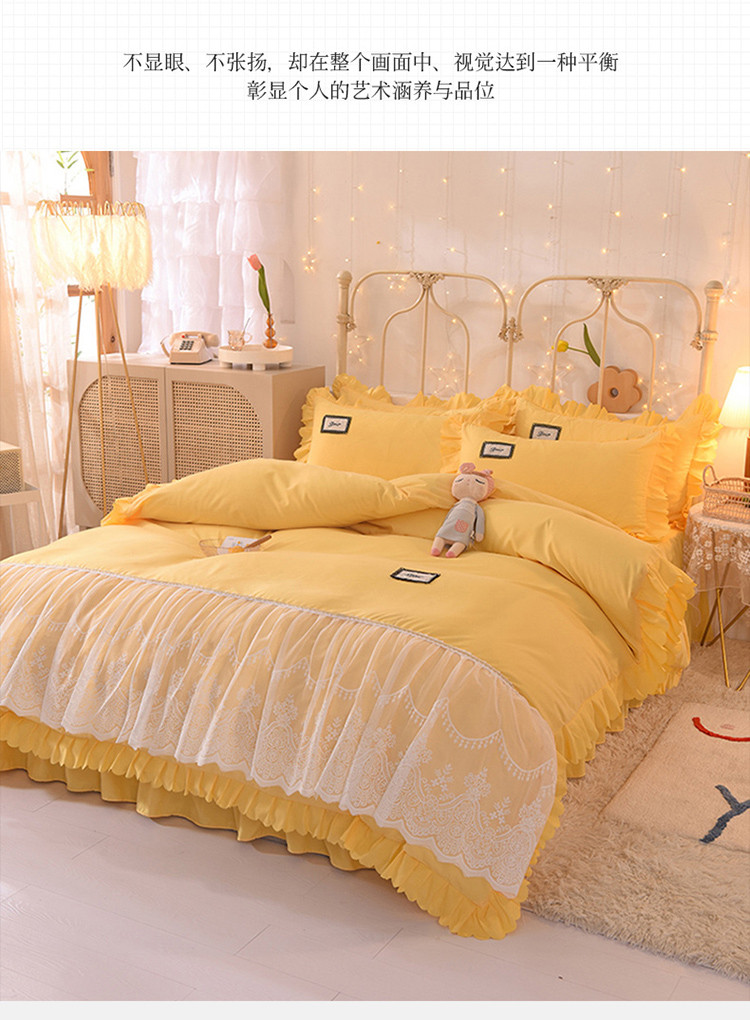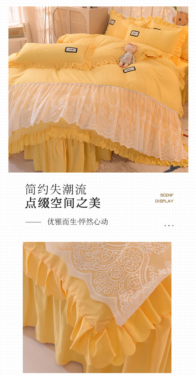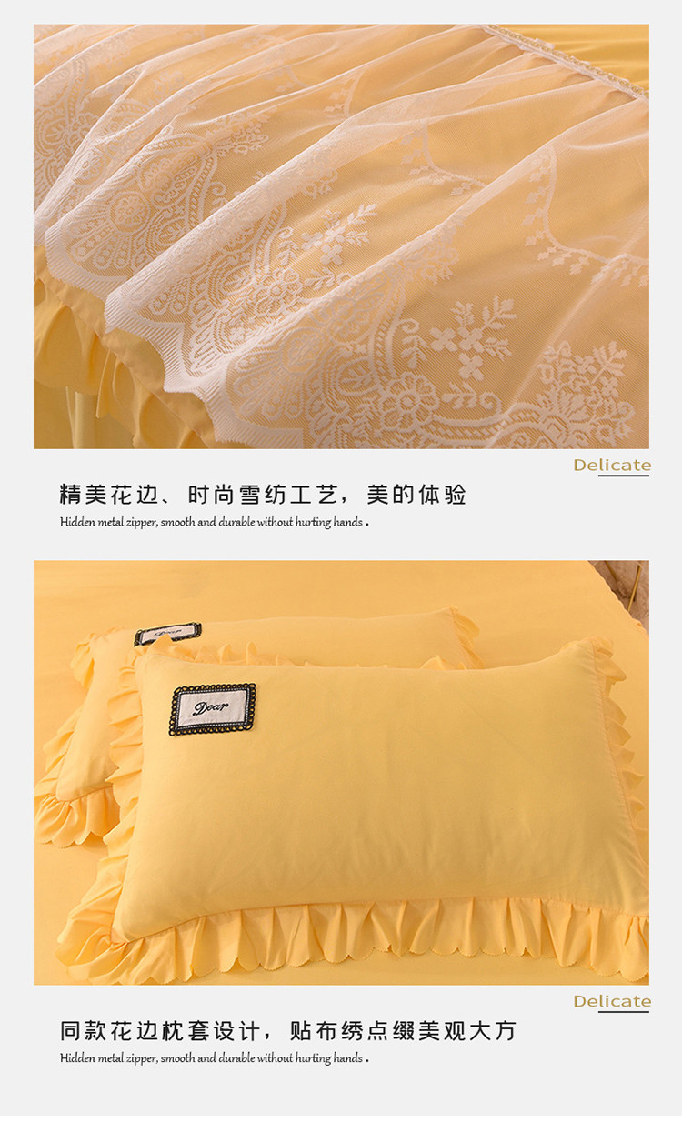 当前位置: 91家纺网 > 商品网购 > 床品套件 > 四件套 > 普通磨毛四件套 > 梦之岛2021新款倾心韩版磨毛蕾丝床单款床裙款四件套 倾心-路易黄