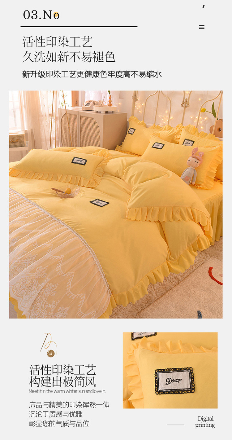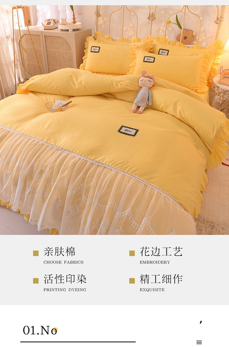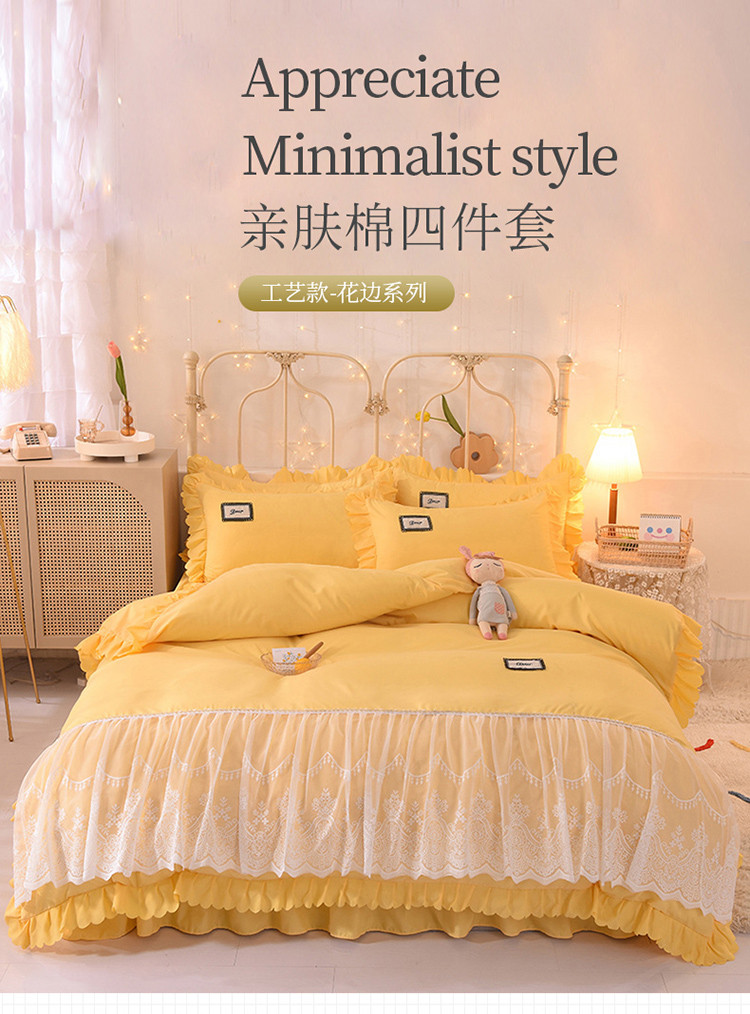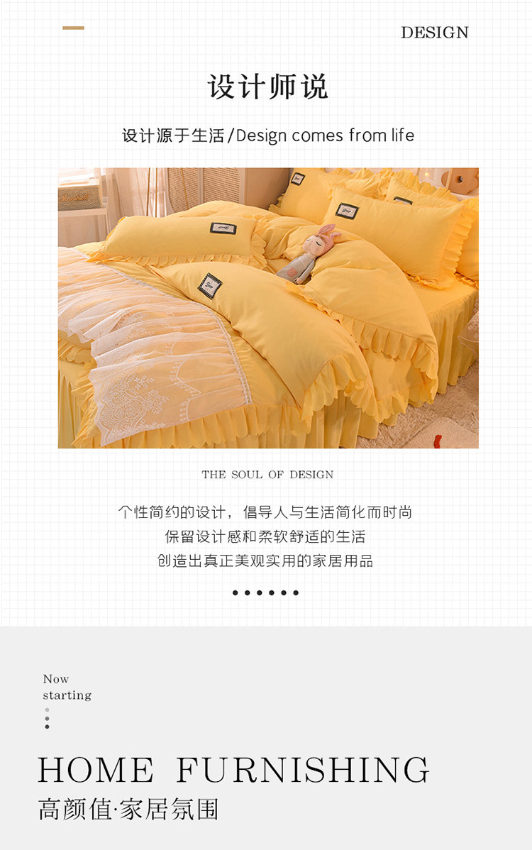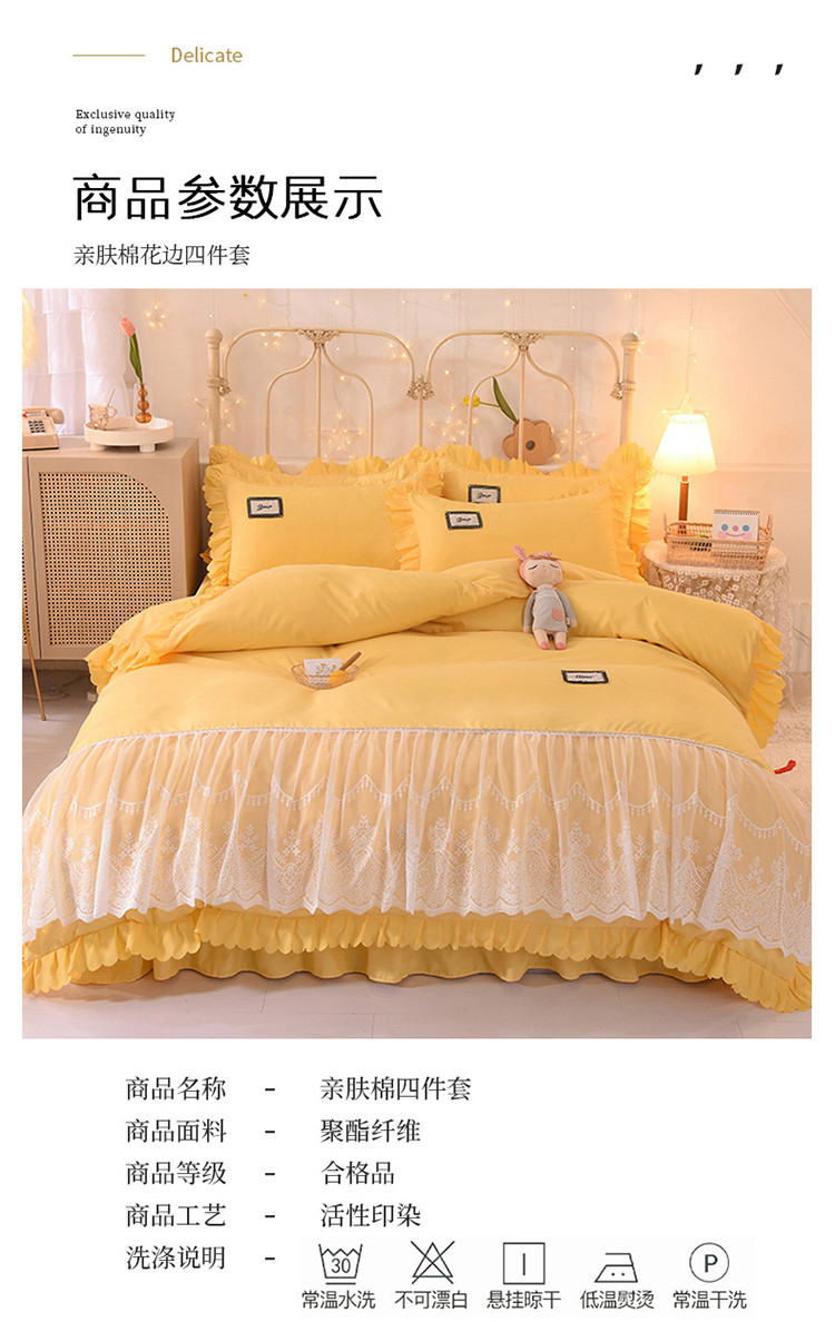 当前位置: 91家纺网 > 商品网购 > 床品套件 > 四件套 > 普通磨毛四件套 > 梦之岛2021新款倾心韩版磨毛蕾丝床单款床裙款四件套 倾心-路易黄