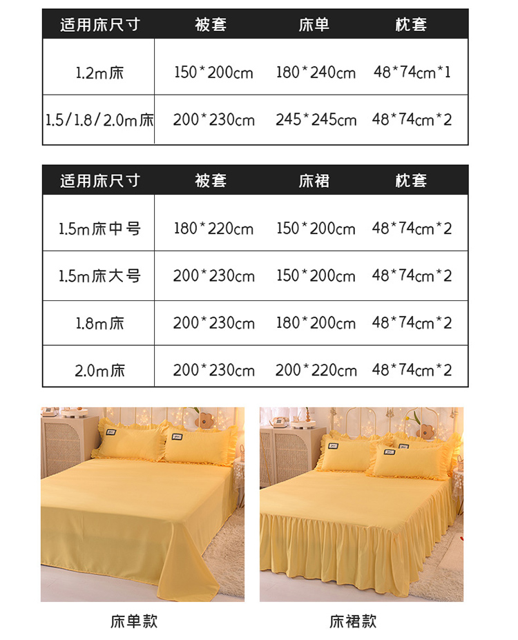 1.5m床裙款四件套(被套180x220cm床裙150x200cm枕套48*74cm*2) | ¥80.00 |
