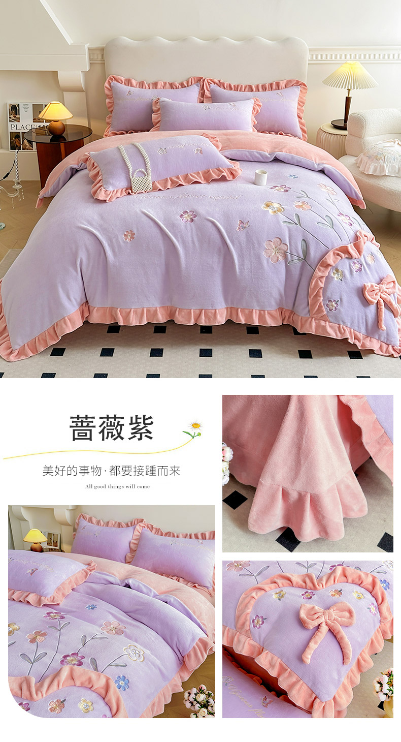 可以家居 2023新款牛奶绒绣花花边款四件套心花怒放 蔷薇紫
