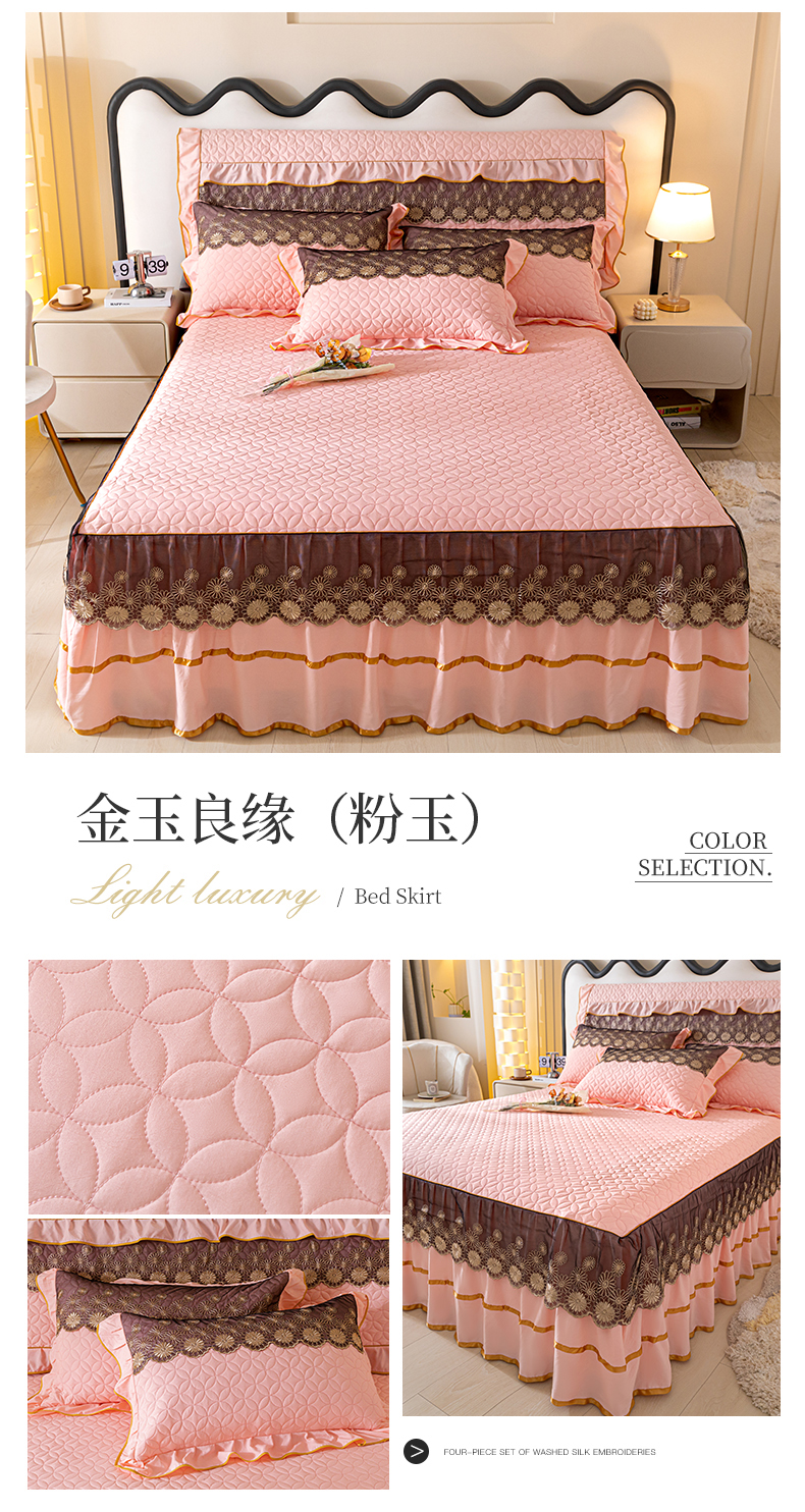 当前位置: 91家纺网 > 商品网购 > 床品套件 > 三件套 > 靓生活 2023新款夹棉绗缝床裙三件套-金玉良缘 粉玉
