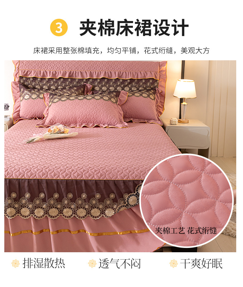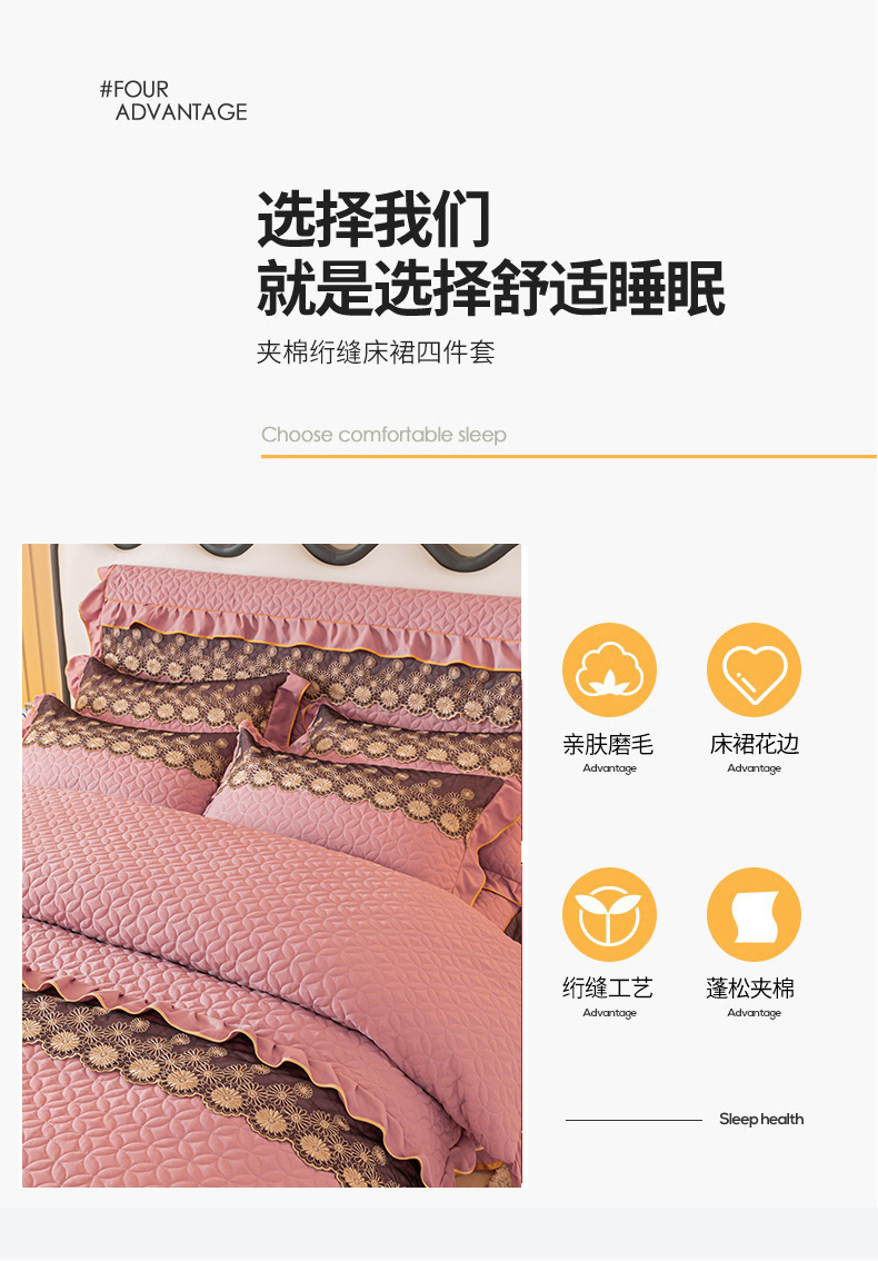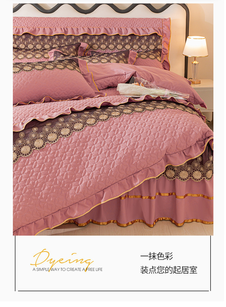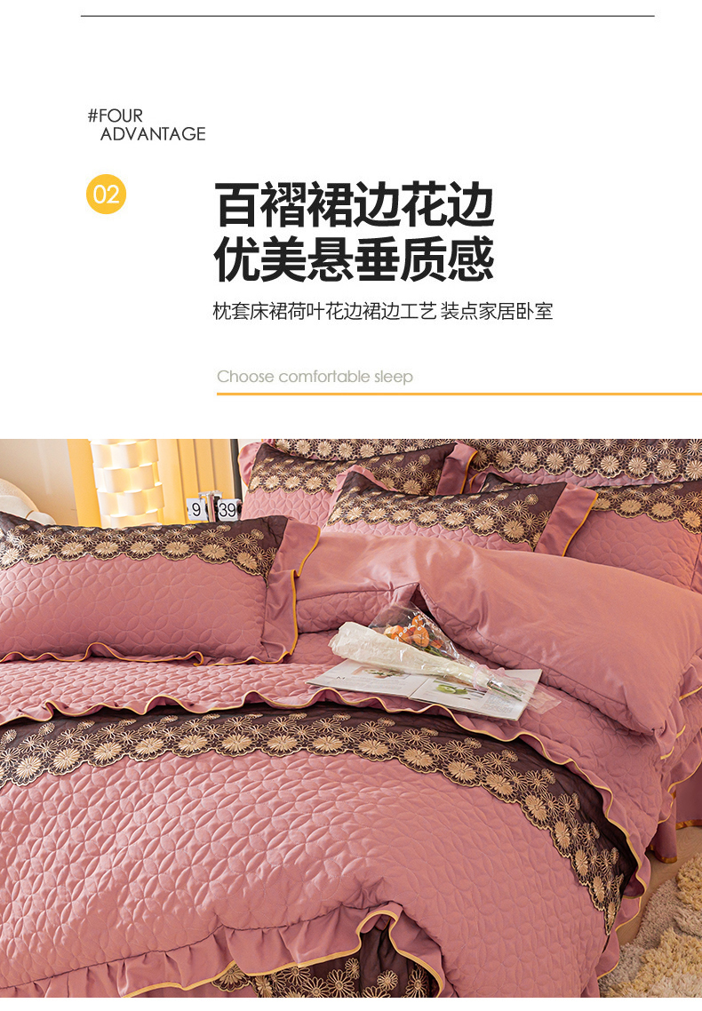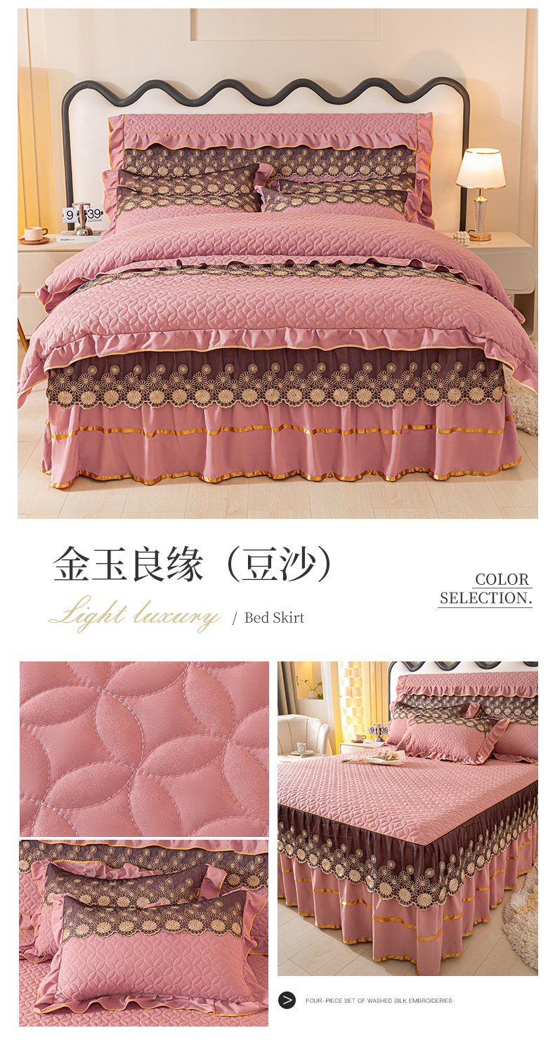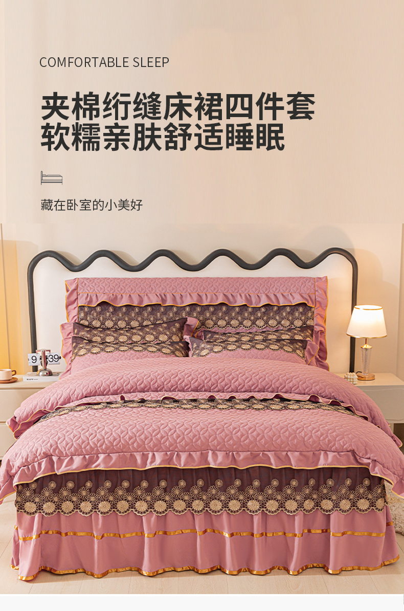 当前位置: 91家纺网 > 商品网购 > 床品套件 > 四件套 > 全棉普通四件套 > 靓生活 2023新款夹棉绗缝床裙四件套-金玉良缘 豆沙