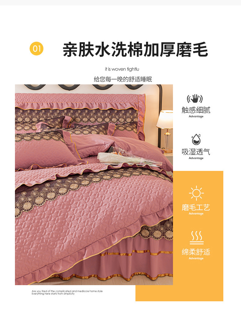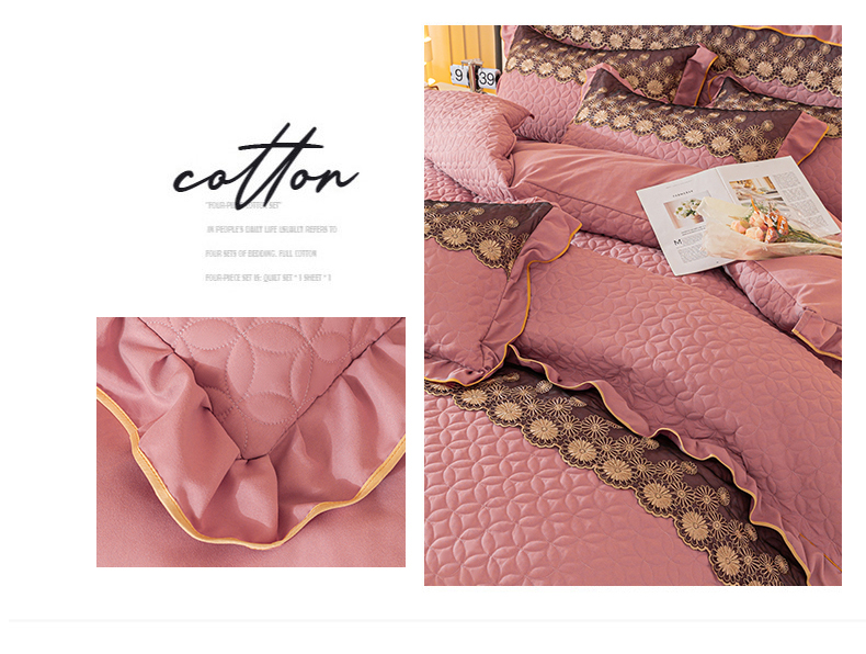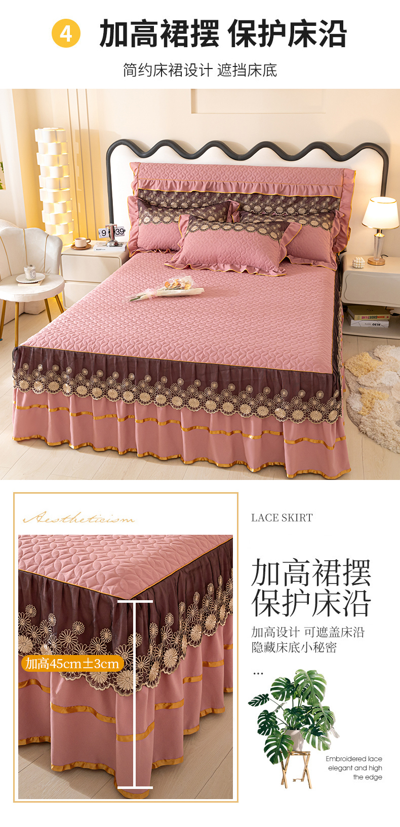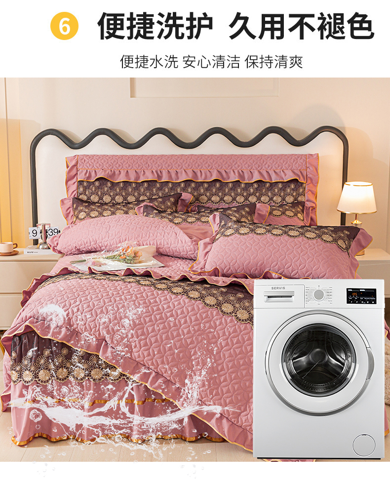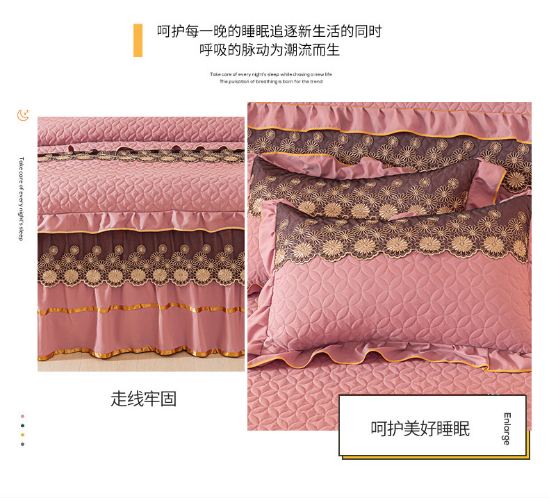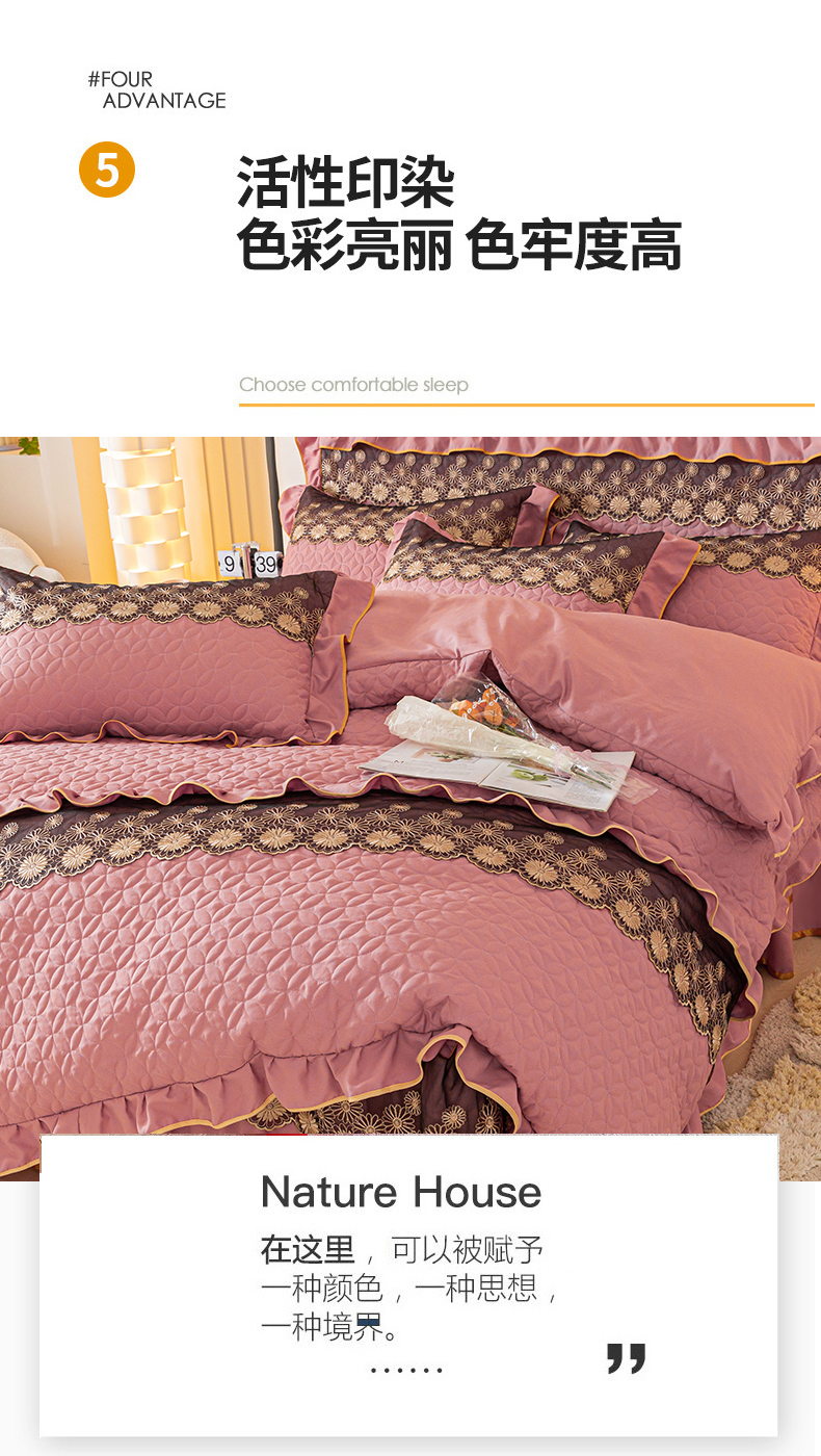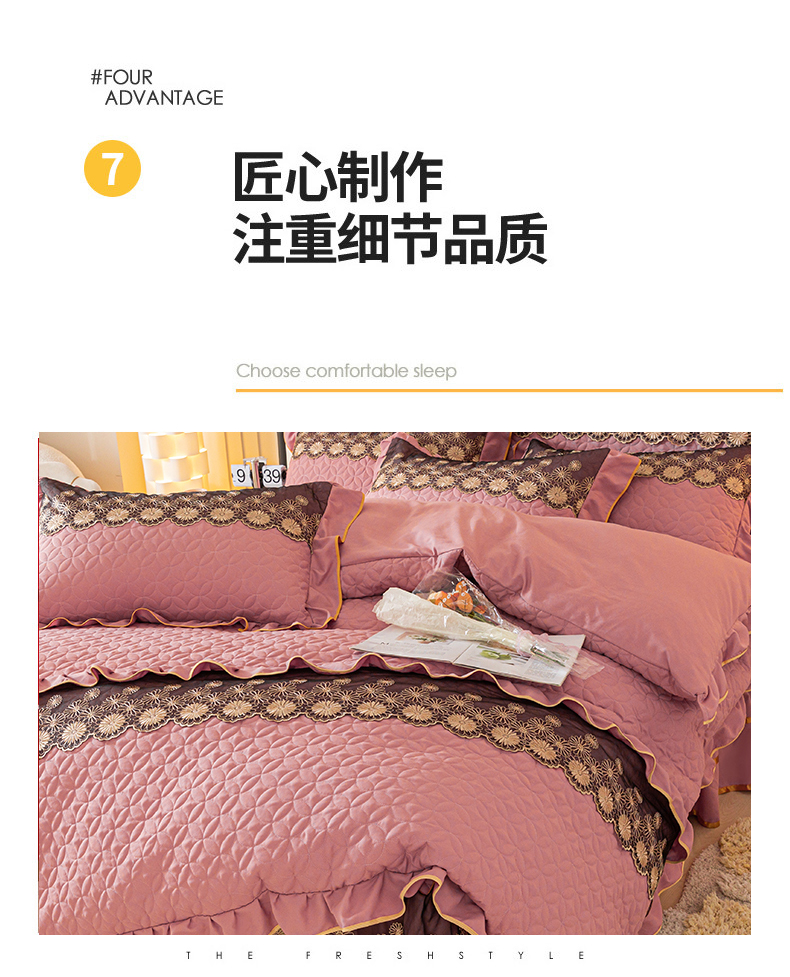 当前位置: 91家纺网 > 商品网购 > 床品套件 > 四件套 > 全棉普通四件套 > 靓生活 2023新款夹棉绗缝床裙四件套-金玉良缘 豆沙