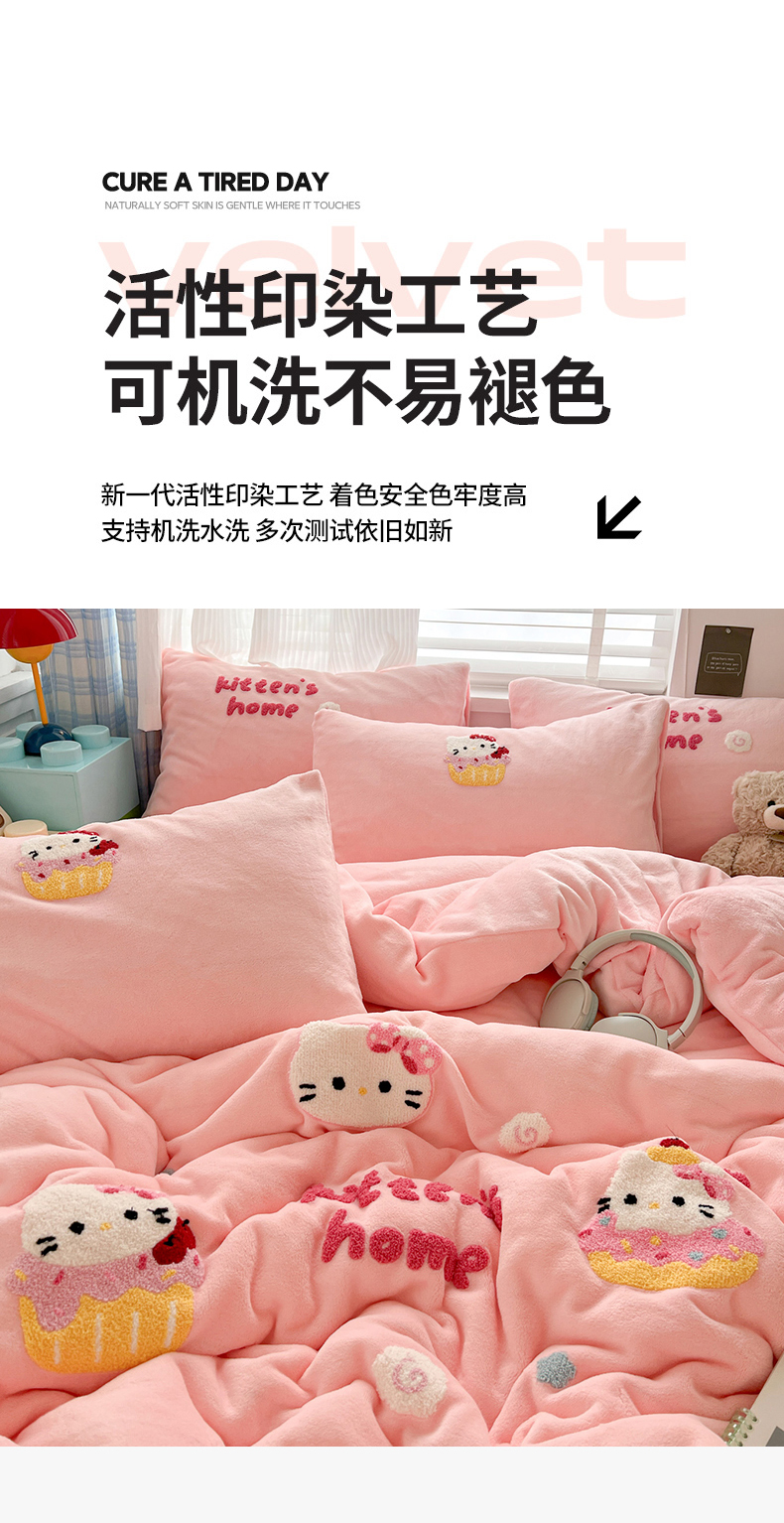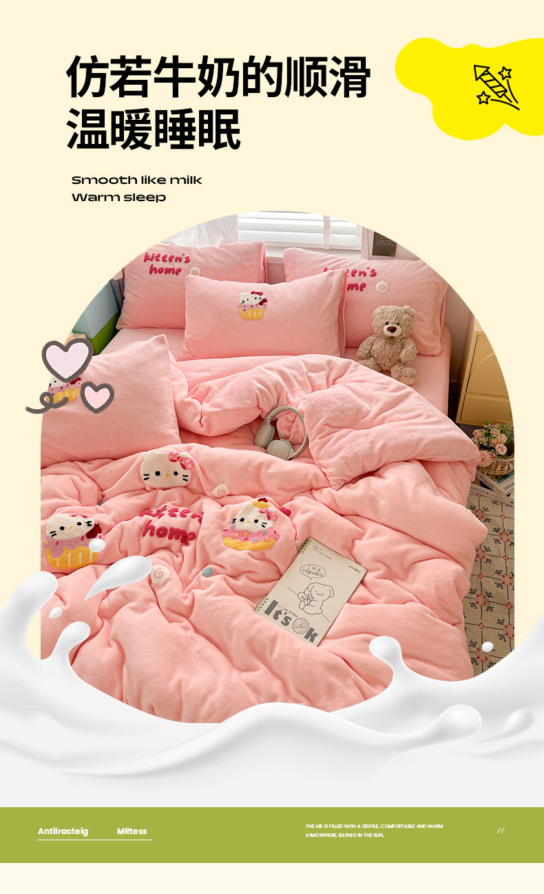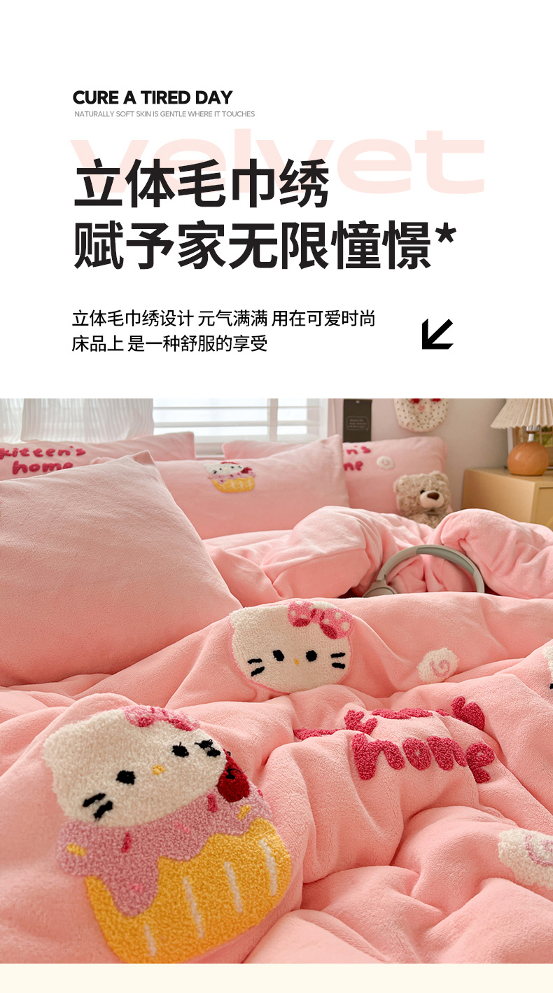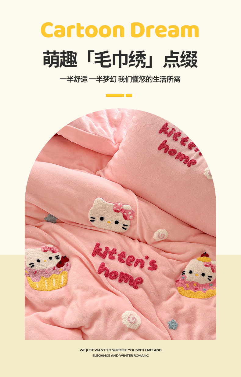 (总)一比一家纺 2025新款卡通毛巾绣牛奶绒四件套,KT粉,KT蓝,蛋糕熊,花田女孩,咖啡狗,腊肠狗,胖胖熊灰,胖胖熊绿,甜心奶酪