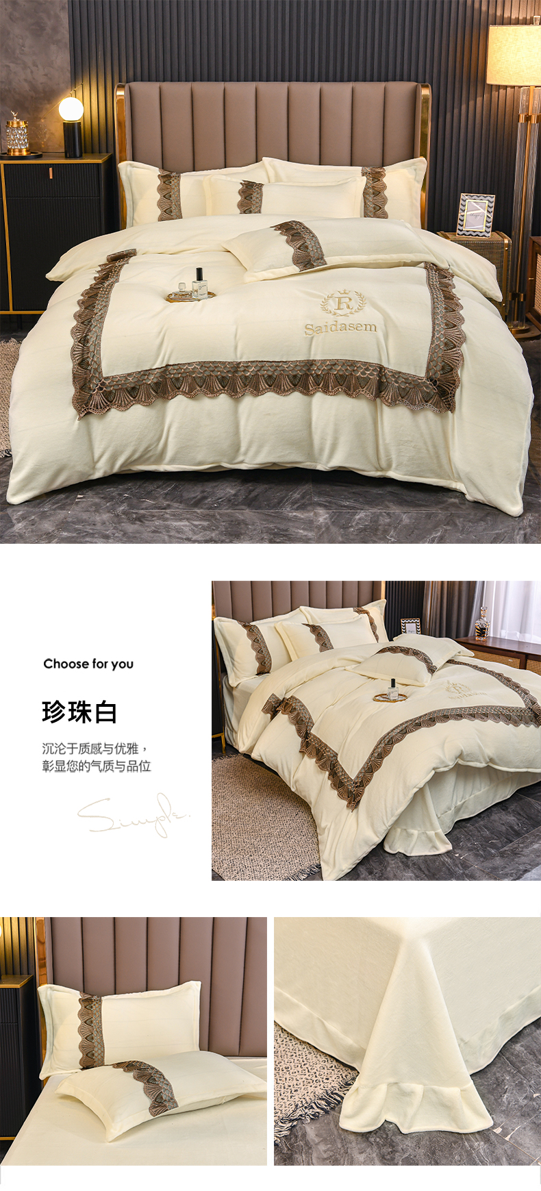 仟网汇 2024爆款轻奢贵族风蕾丝立体刺绣高克重牛奶绒四件套金貂绒法莱绒 奶白