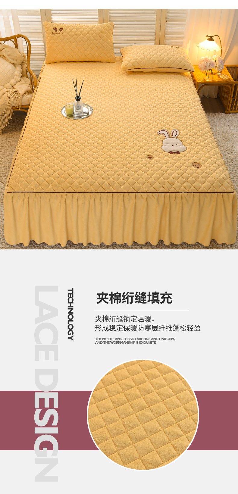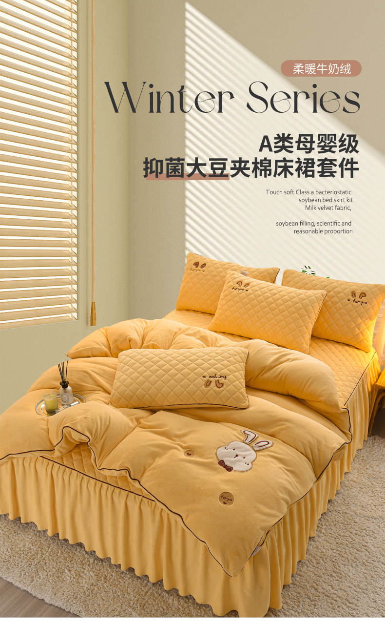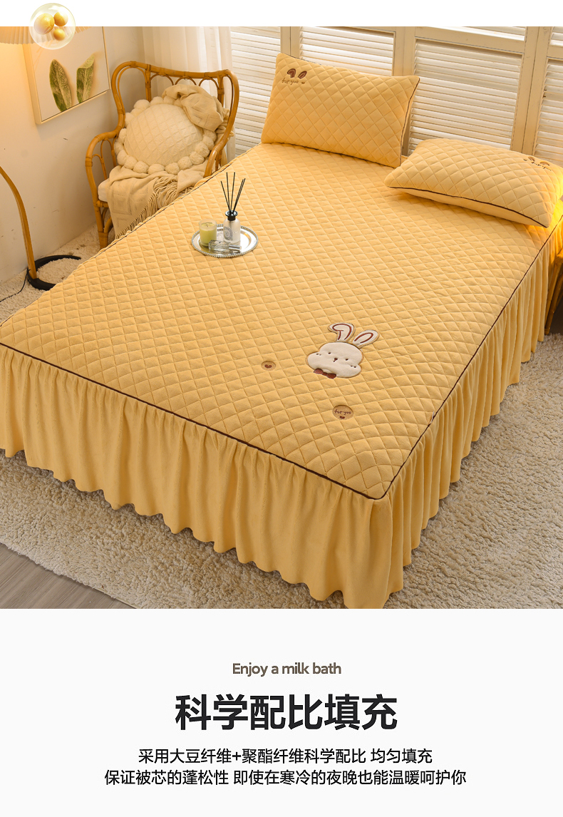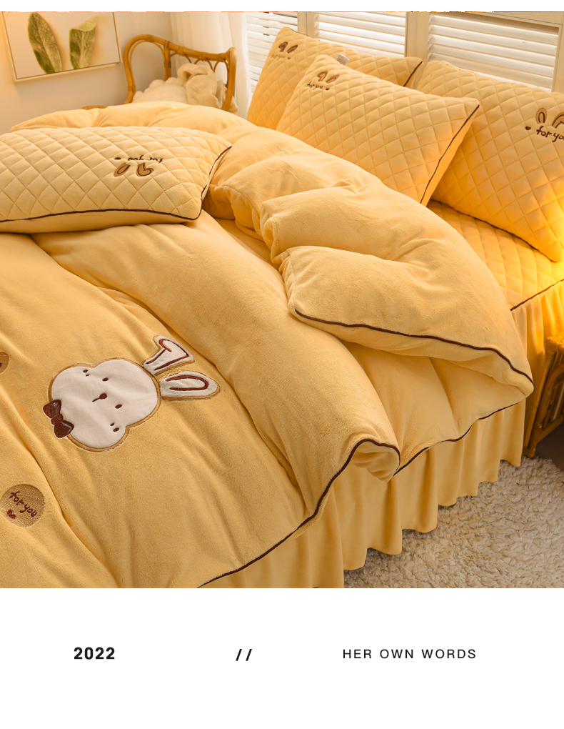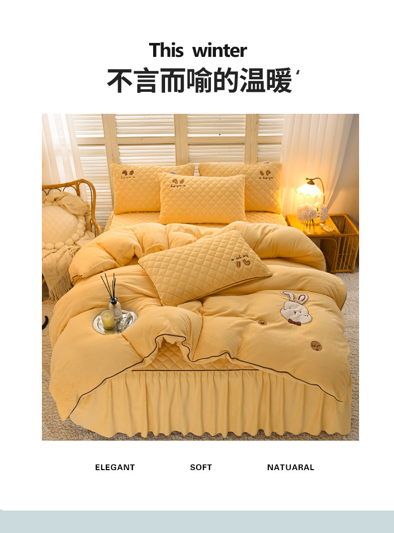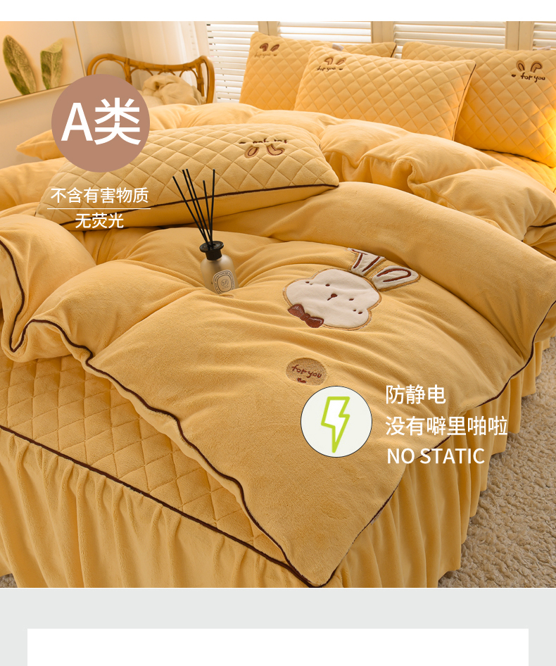 当前位置: 91家纺网 > 商品网购 > 床品套件 > 四件套 > 牛奶绒四件套 > 好眠好梦家纺 2024新款叮当兔牛奶绒绣花床裙款四件套 鹅黄