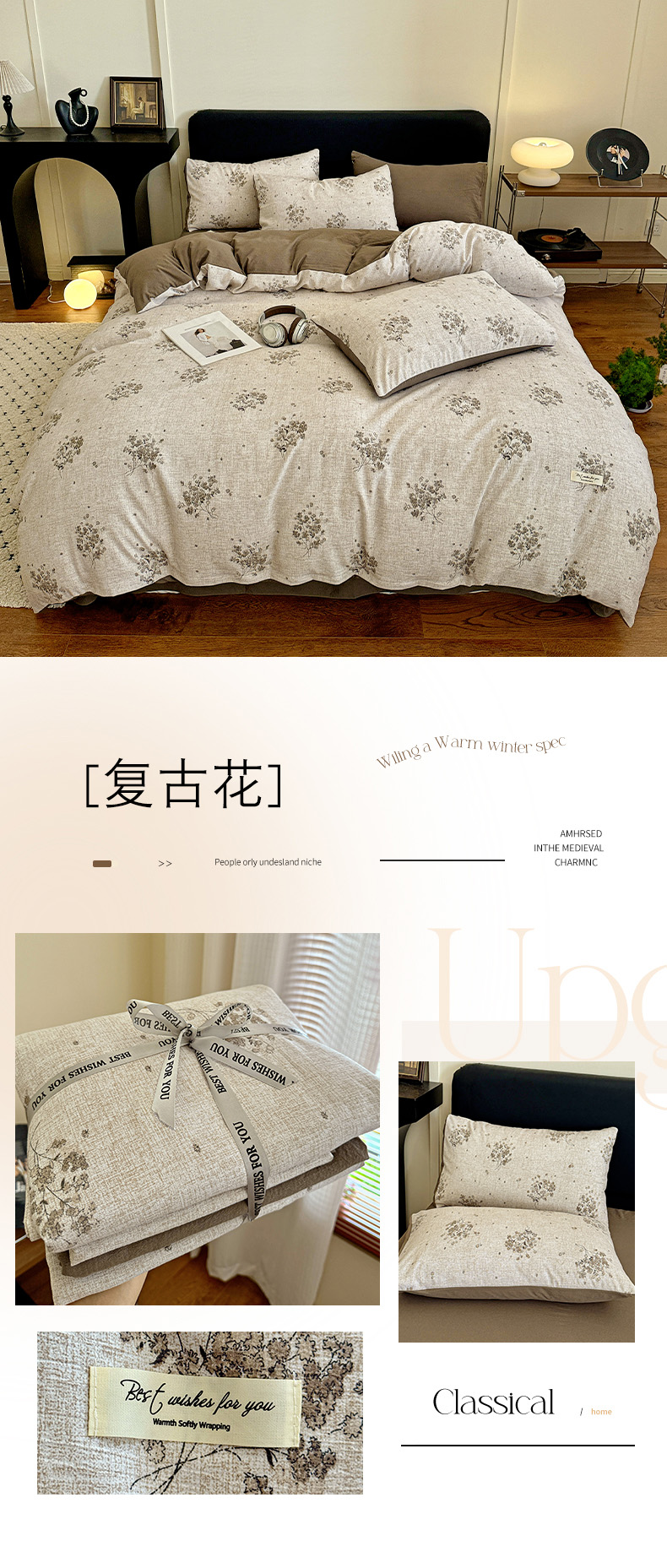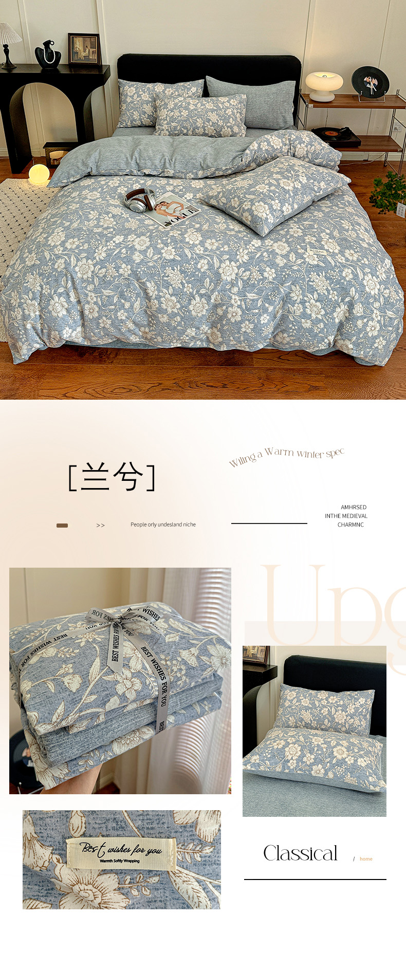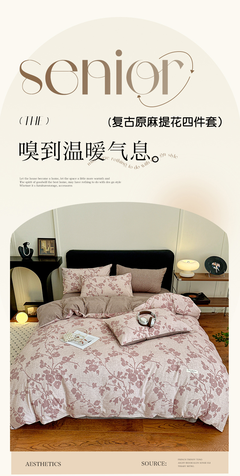 金梦拉家纺 2025秋冬爆款新品高克重加厚原麻亚麻皱皱纱印花四件套 花颜
