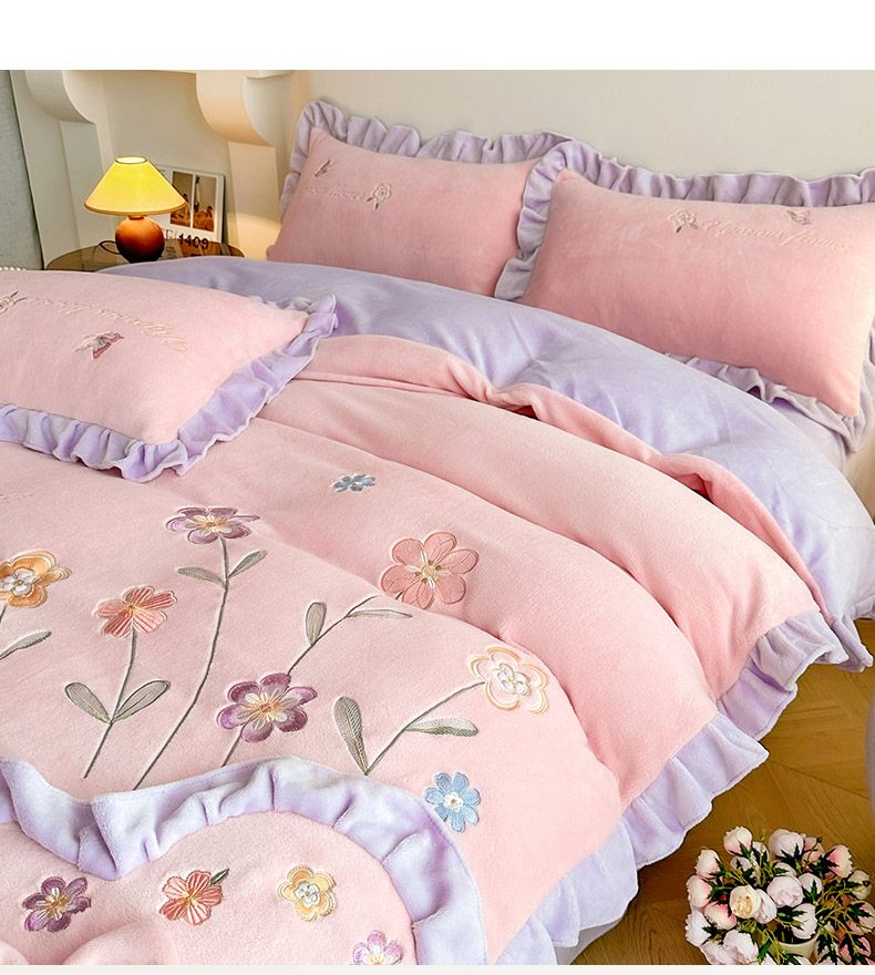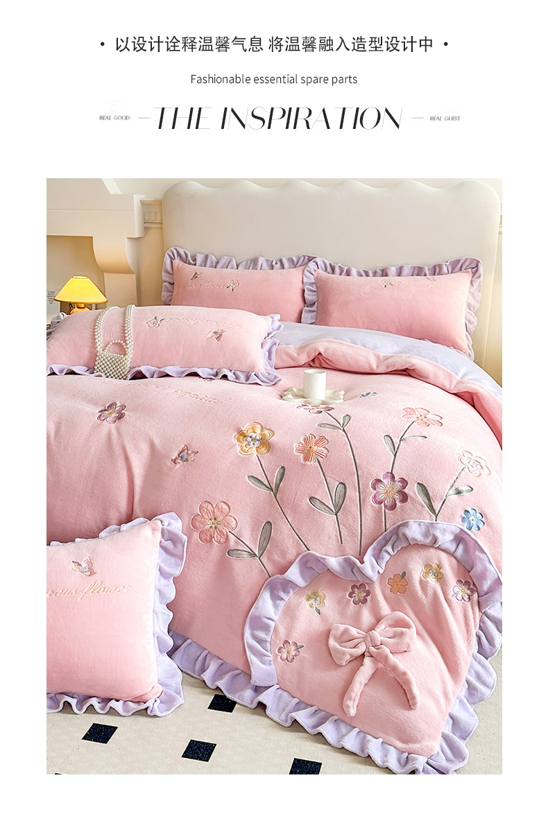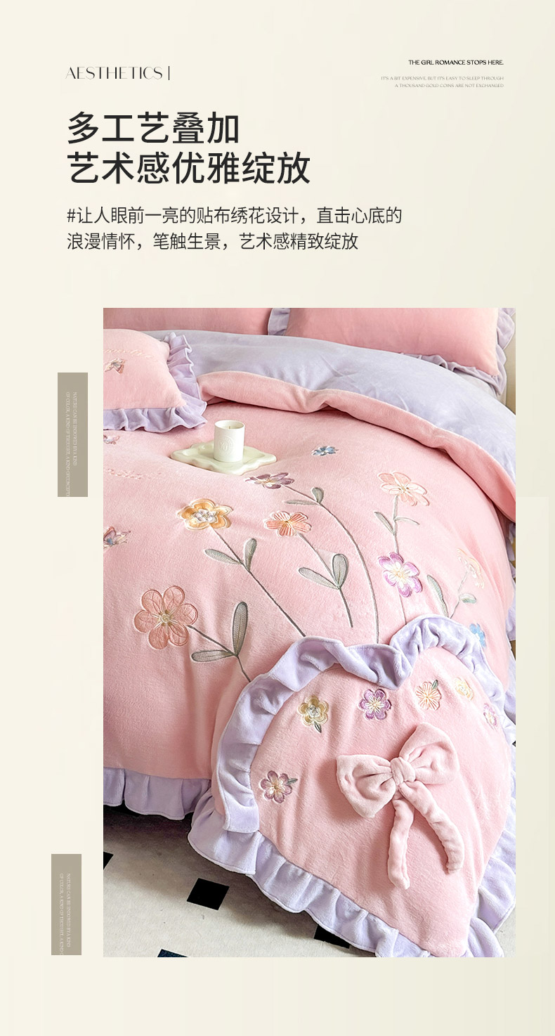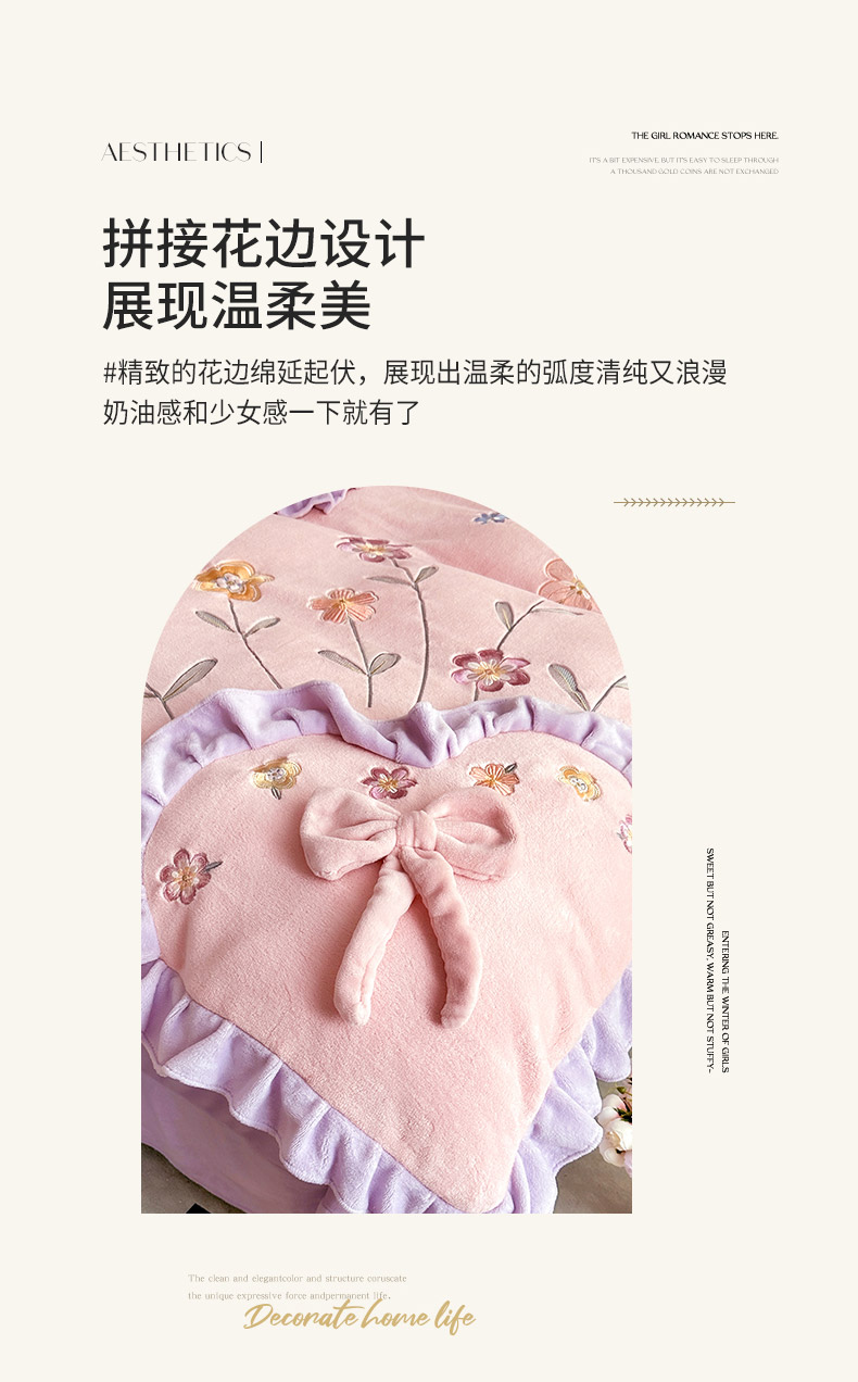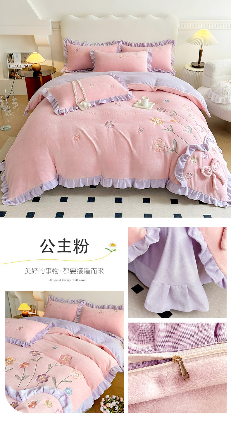 商品名称:可以家居 2023新款牛奶绒绣花花边款四件套心花怒放 公主粉