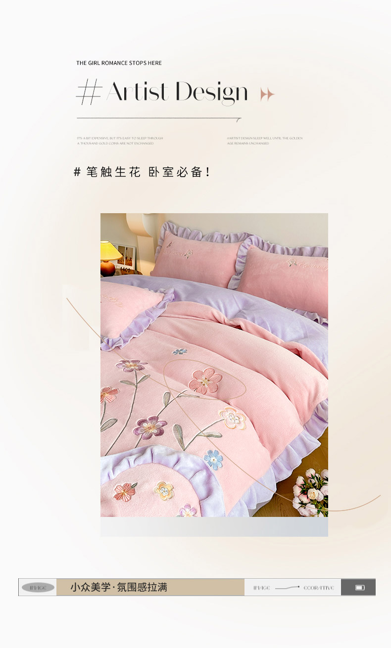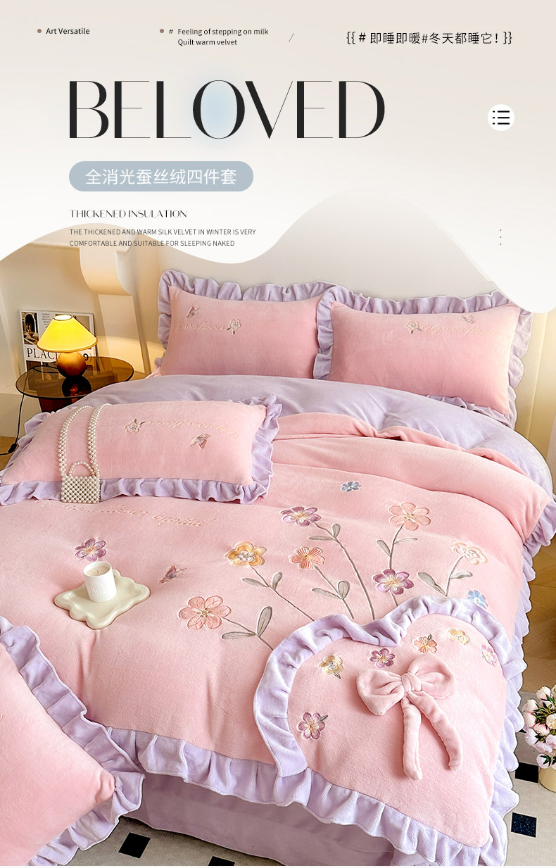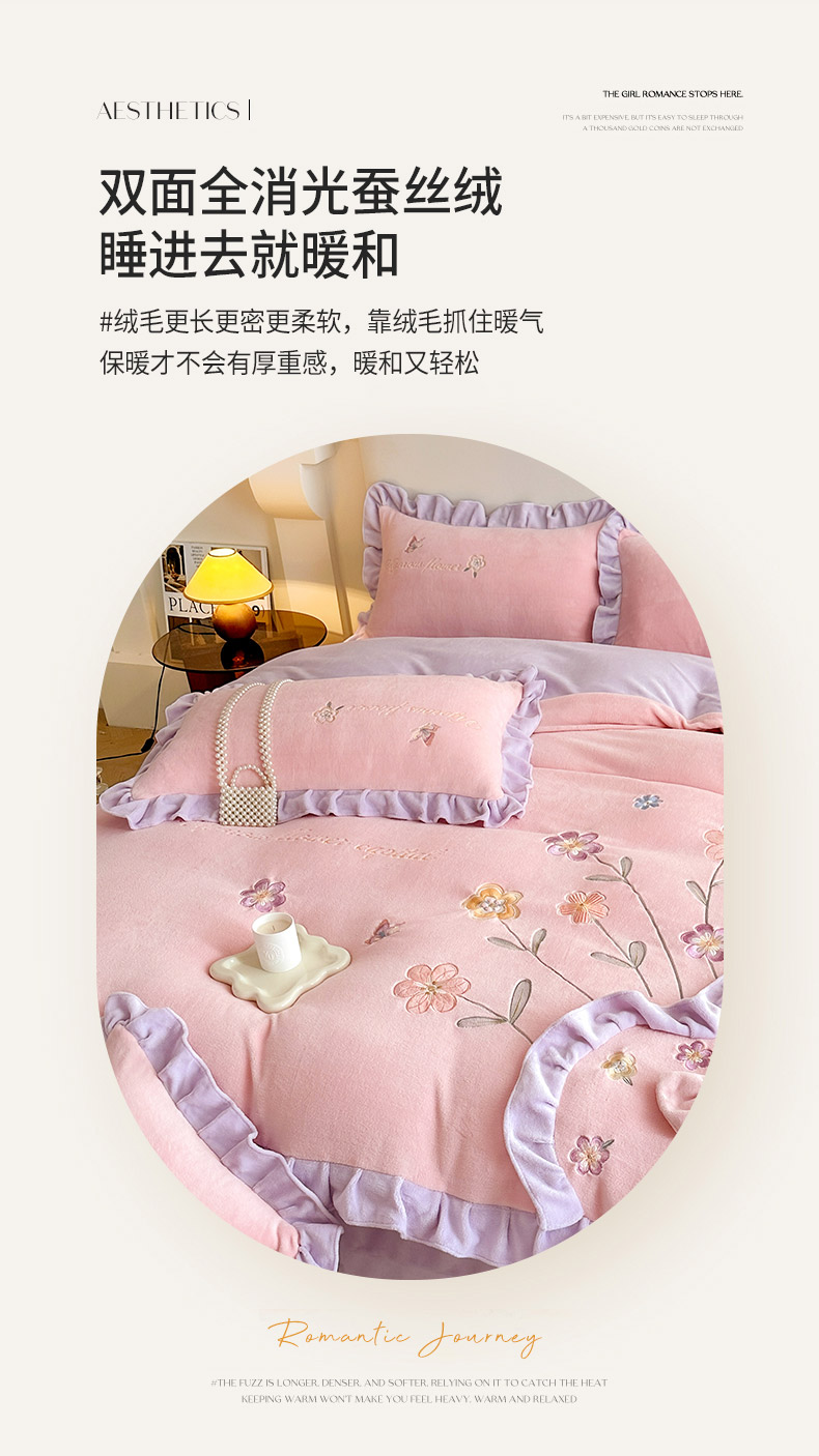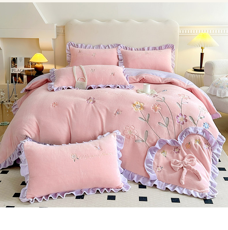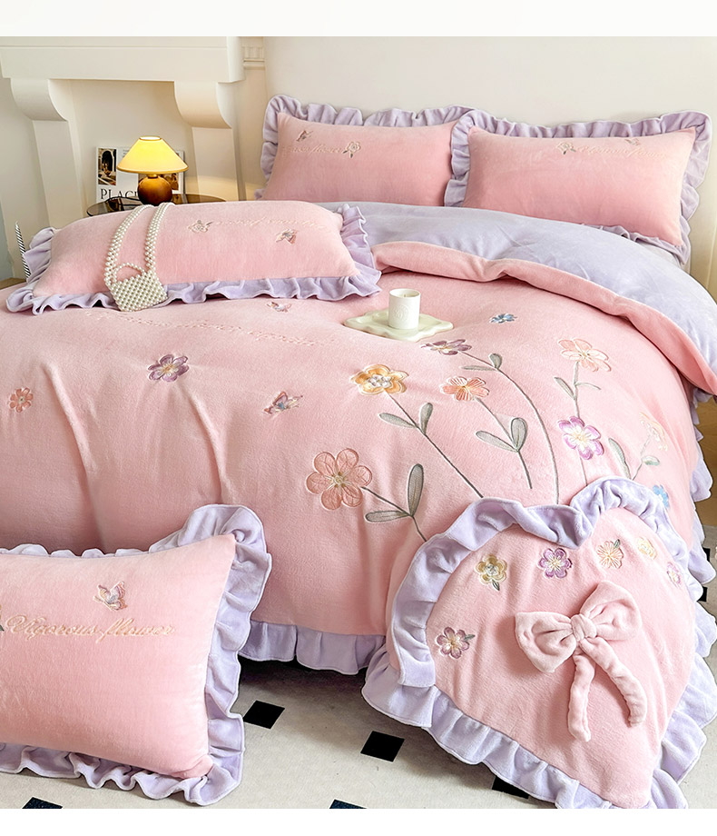 商品名称:可以家居 2023新款牛奶绒绣花花边款四件套心花怒放 公主粉