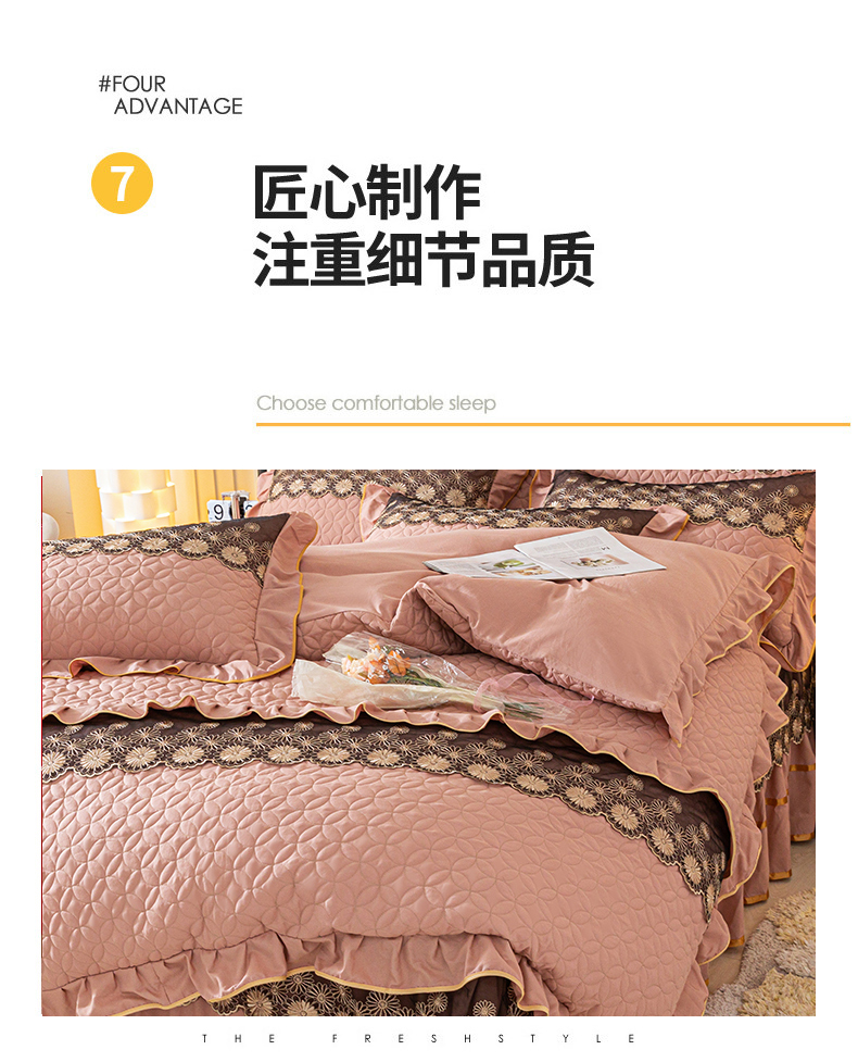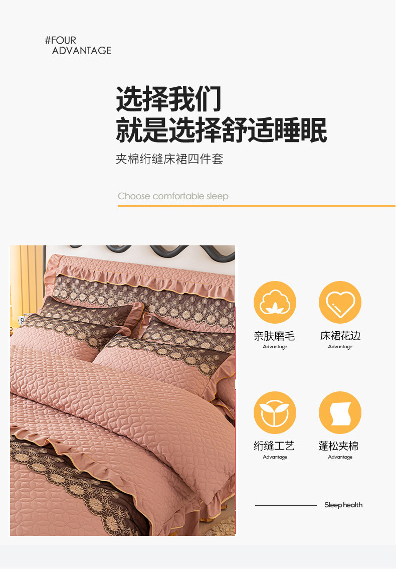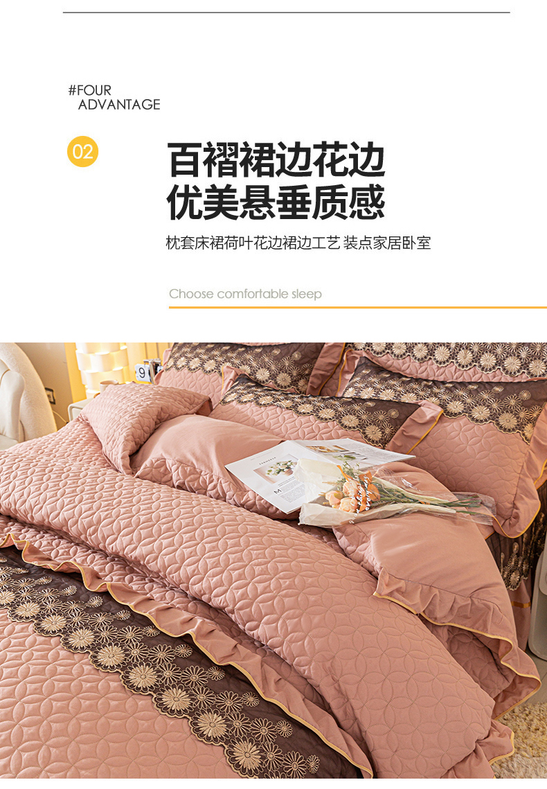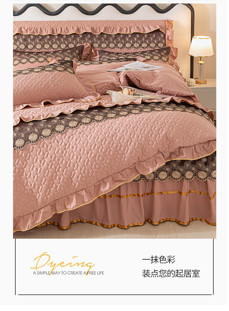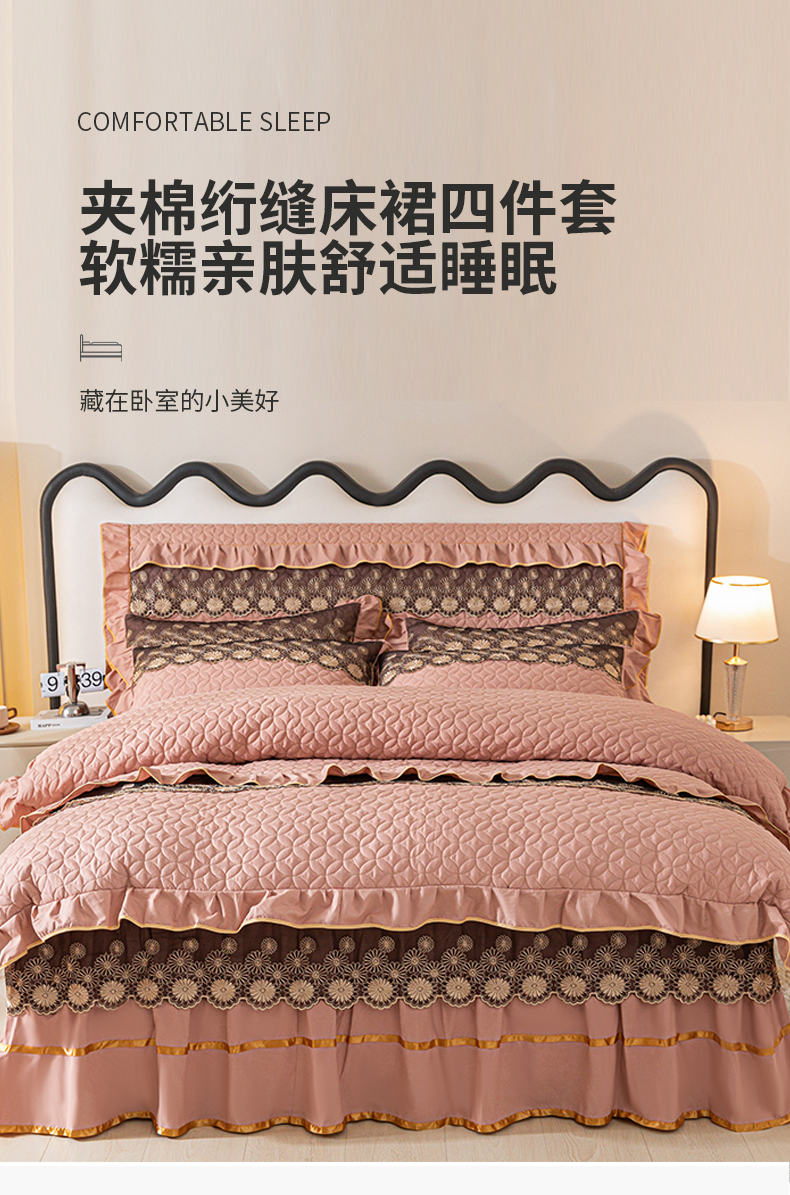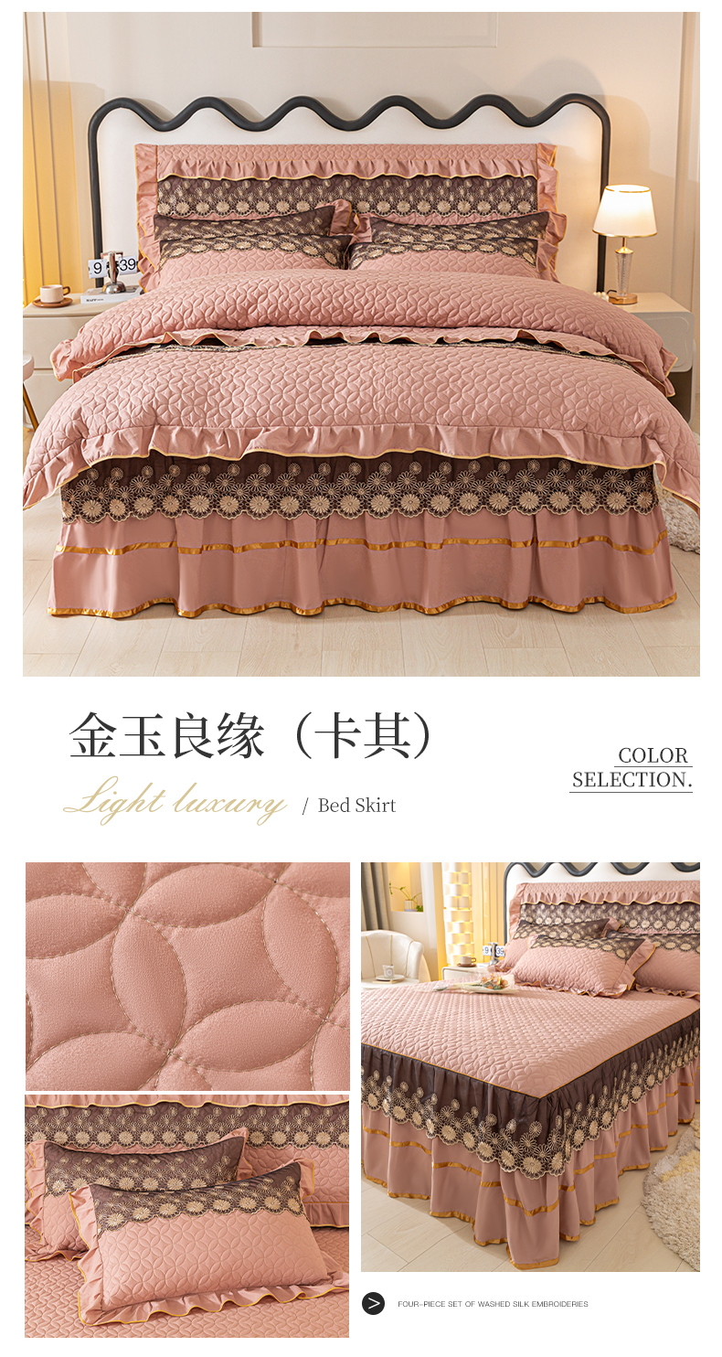 当前位置: 91家纺网 > 商品网购 > 床品套件 > 四件套 > 全棉普通四件套 > 靓生活 2023新款夹棉绗缝床裙四件套-金玉良缘 卡其
