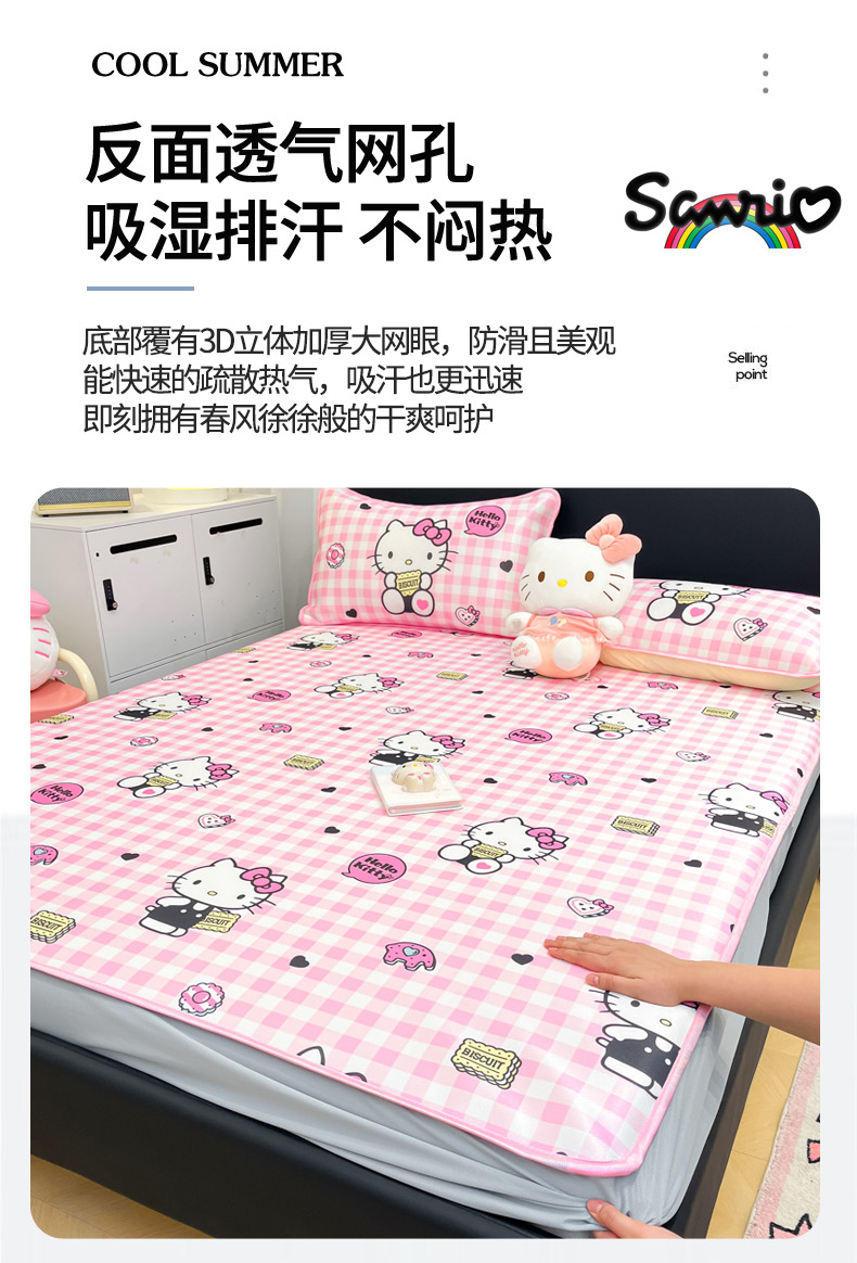 商品名称:暮思家居 2025新款三丽鸥正版授权数码印花A类可机洗1200D冰丝凉席三件套床笠款系列 床笠款-粉格KT
