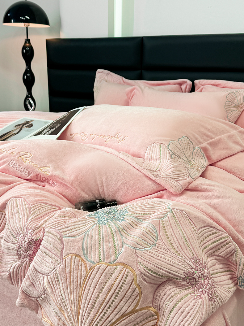 2025新款220克全消光牛奶绒线条花刺绣+宽边四件套-绮丽(会员-10元)控价:优惠券后最低228元 温柔粉