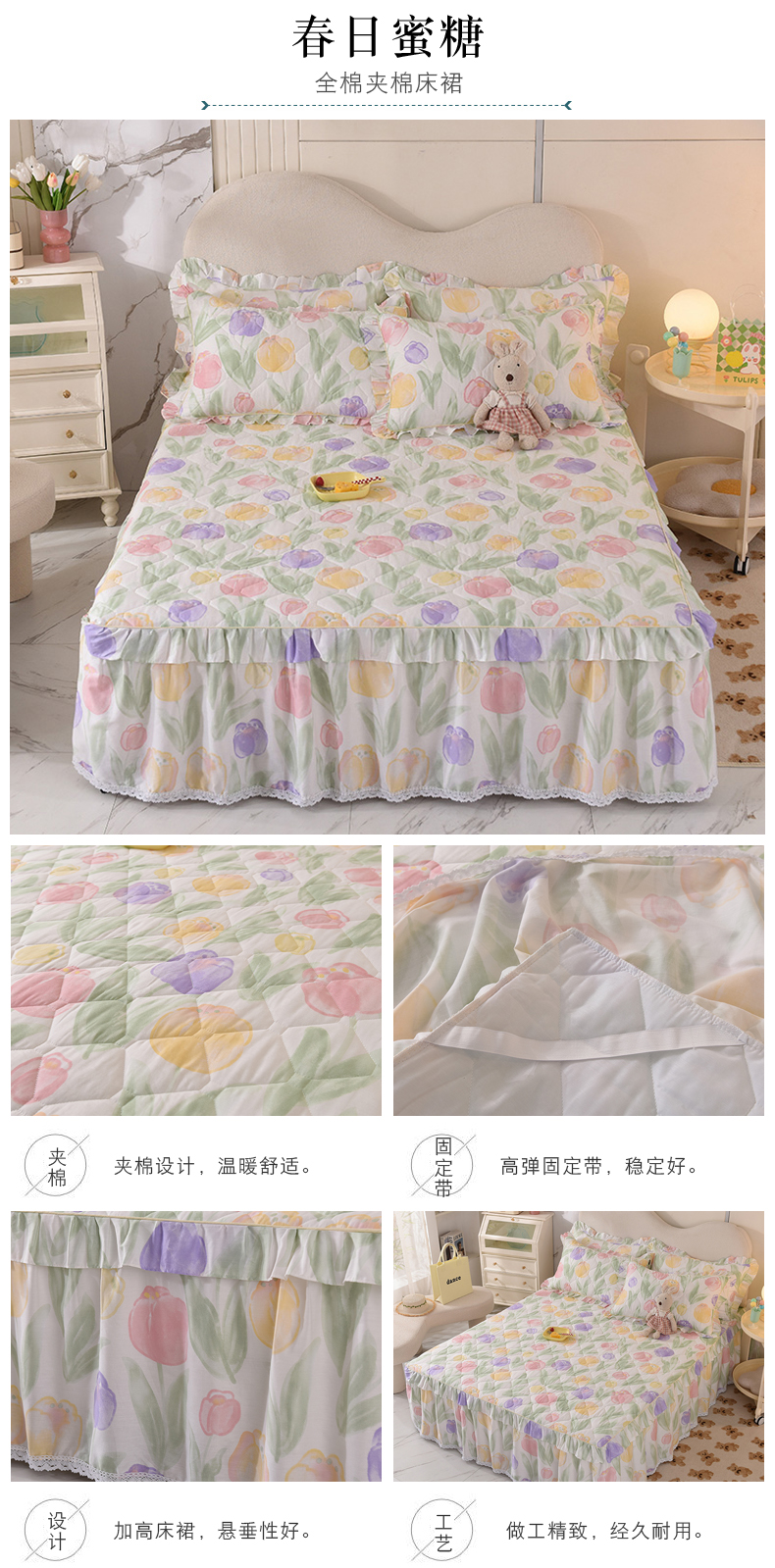 美达2025全棉蕾丝小花边夹棉单床裙 春日蜜糖
