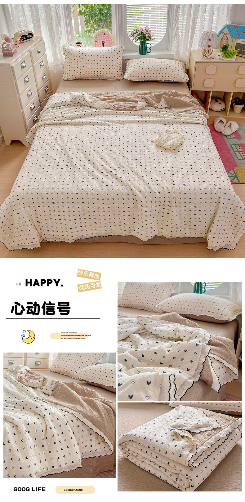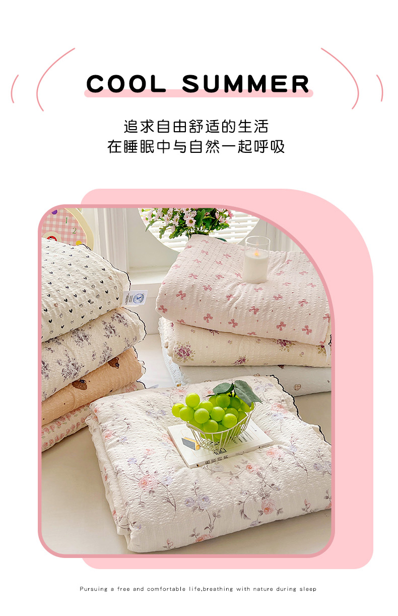 金梦拉家纺 2026新款泡芙纱全棉小黑花边夏被四件套 伊水芙蓉