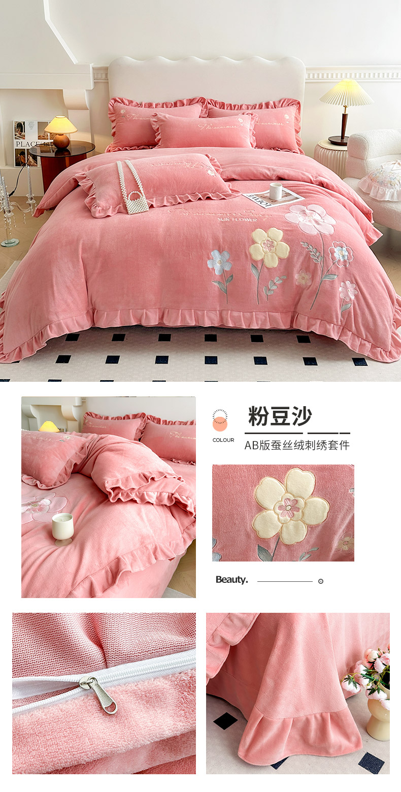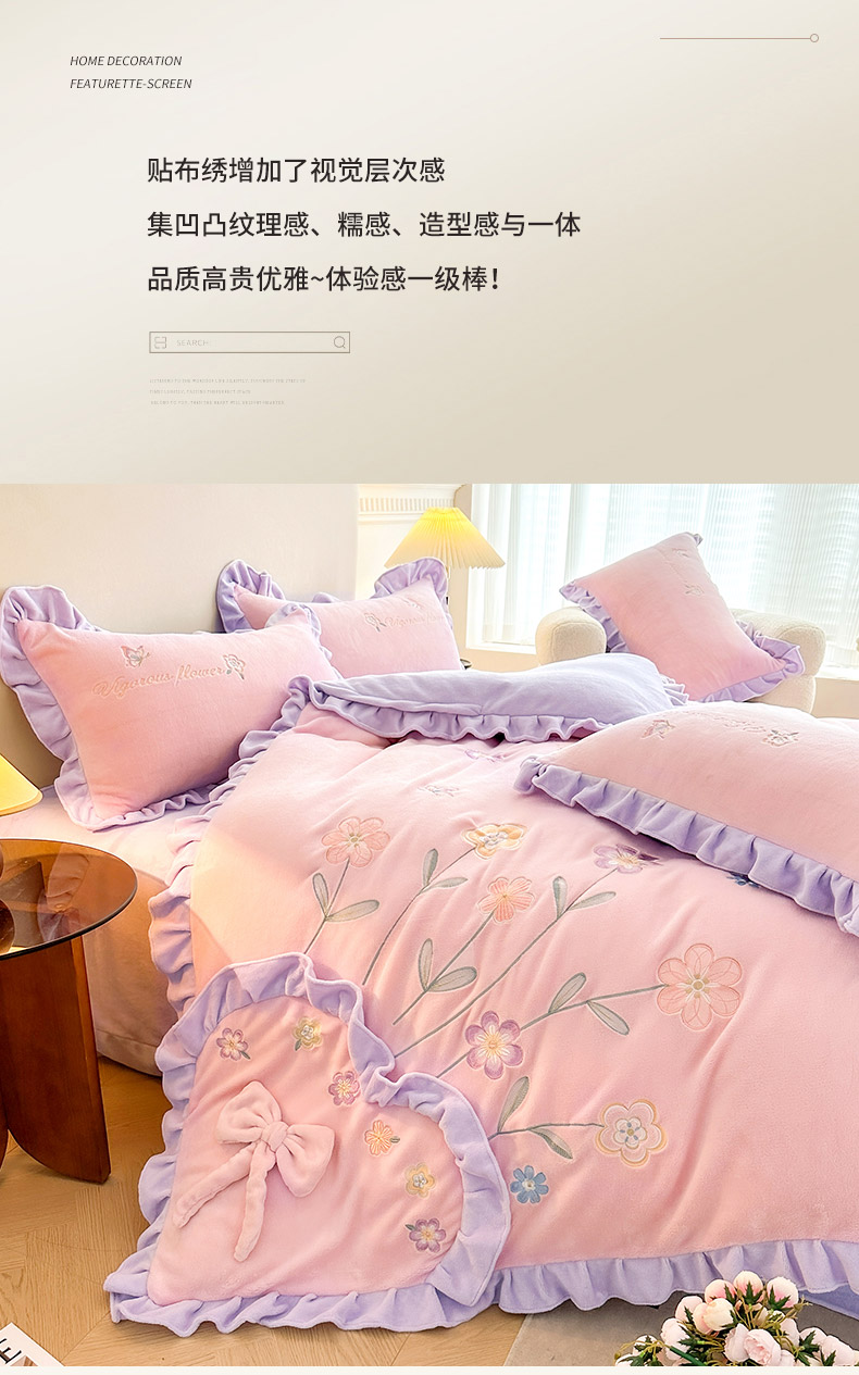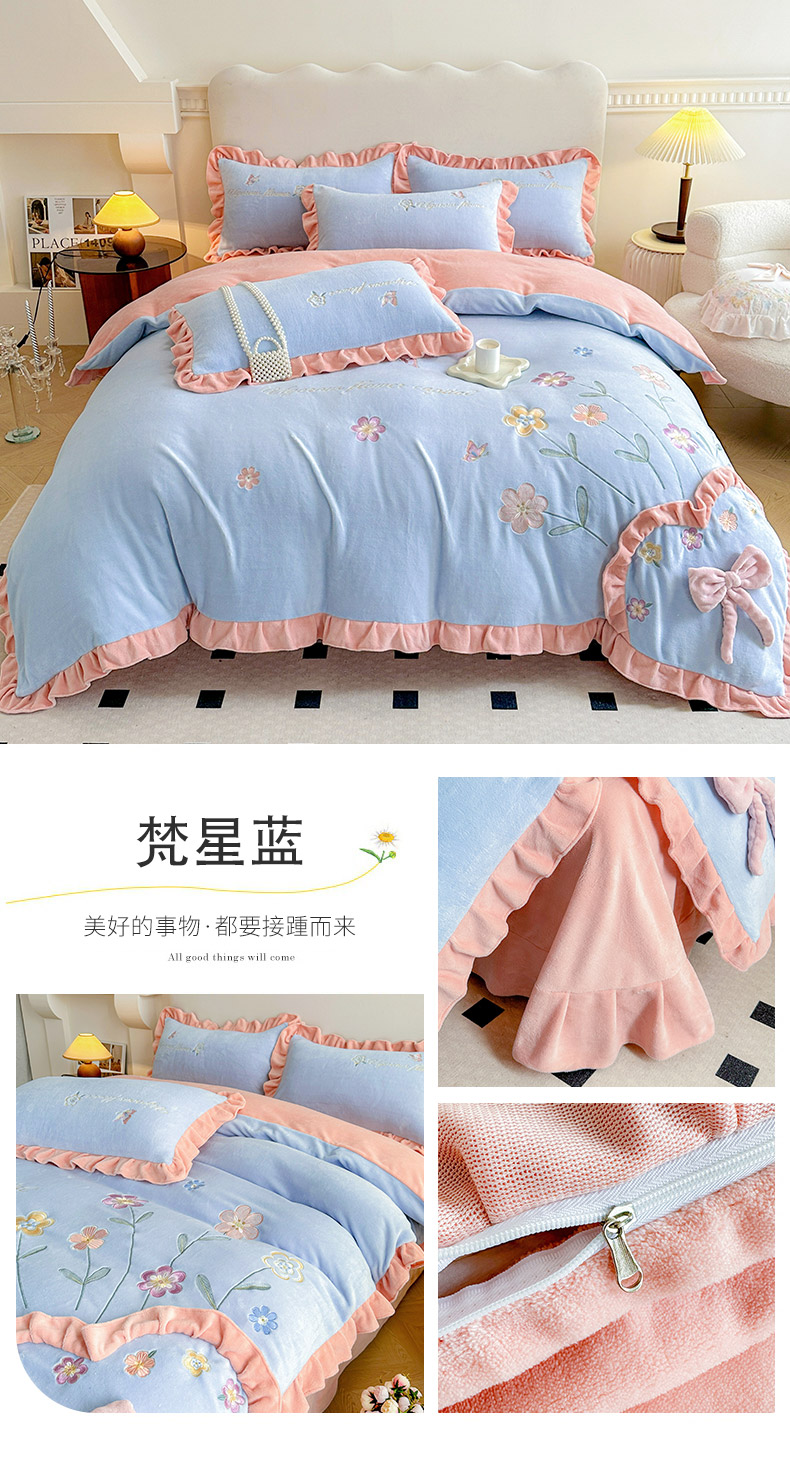 商品名称:(总)可以家居 2023新款高克重牛奶绒绣花花边款四件套汇总