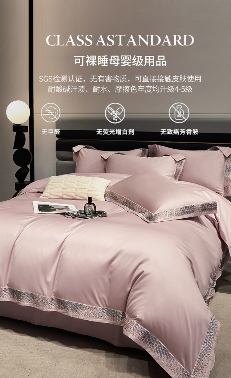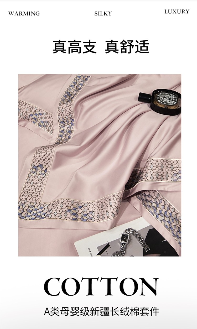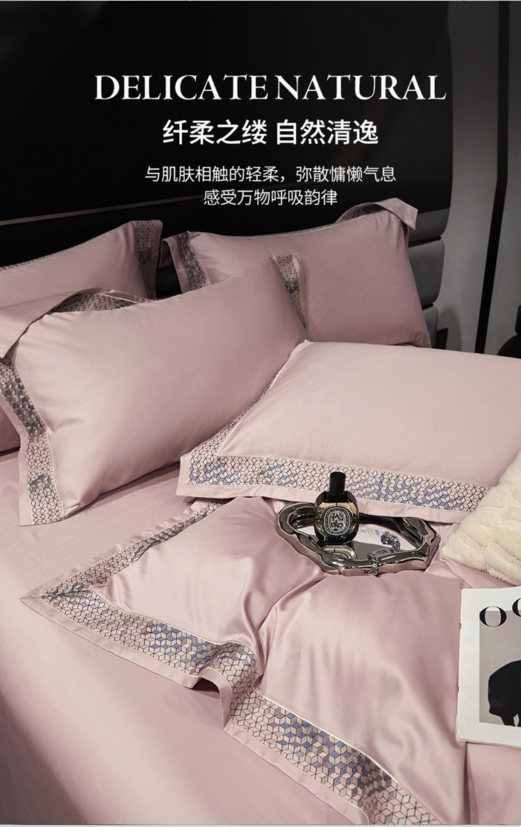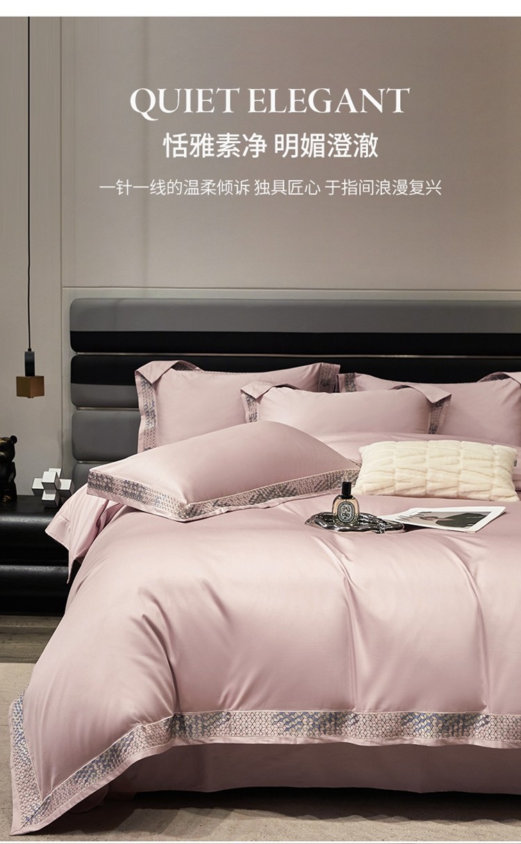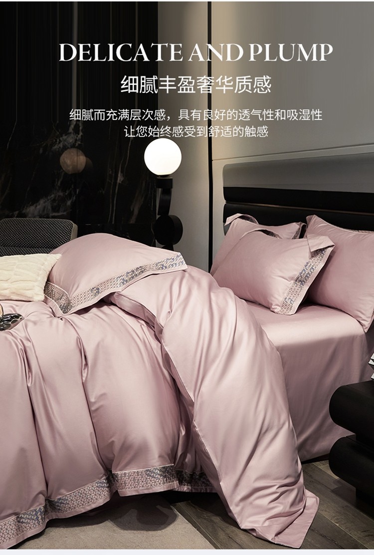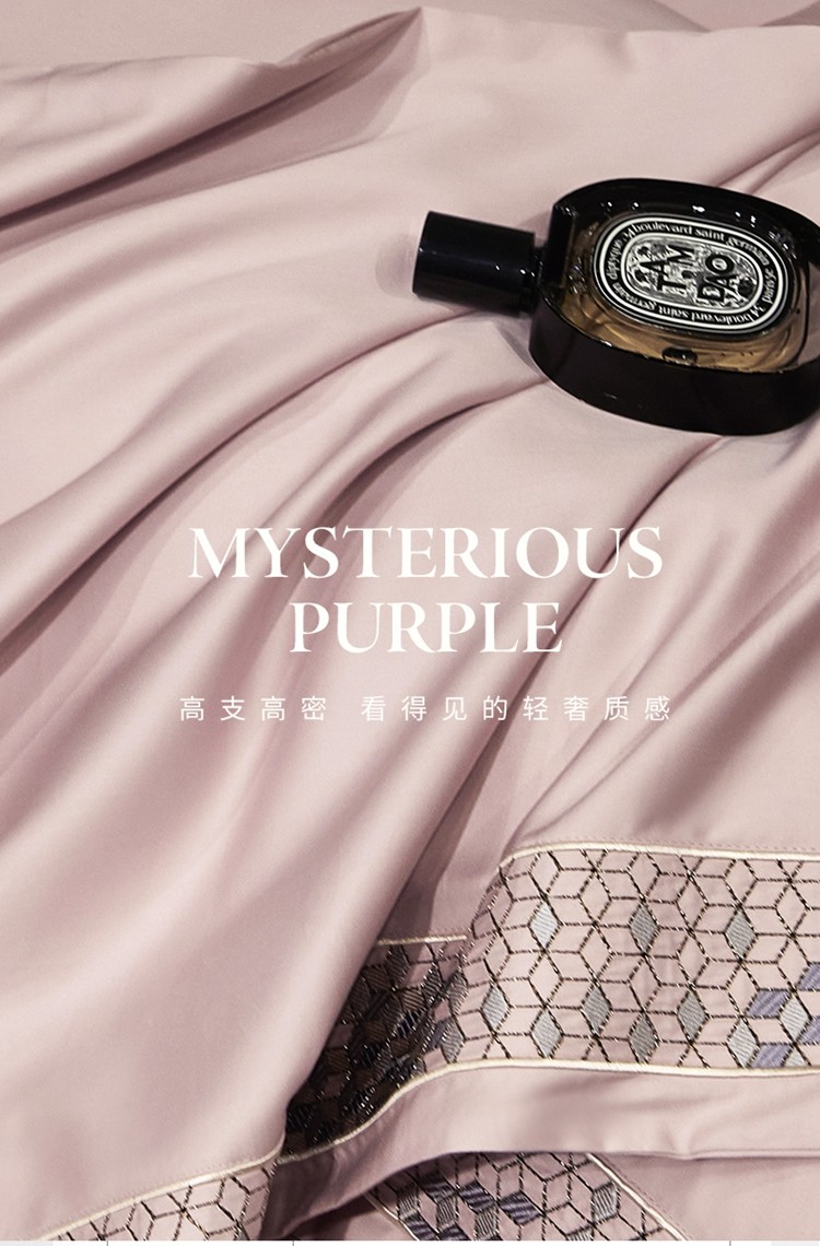 柔觉家纺 天丝刺绣贡缎提花全棉四件套,卡曼时尚-粉紫