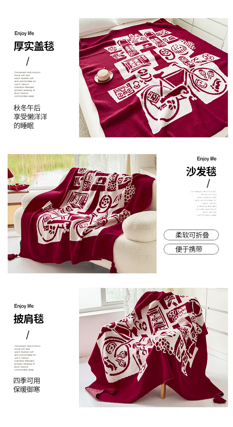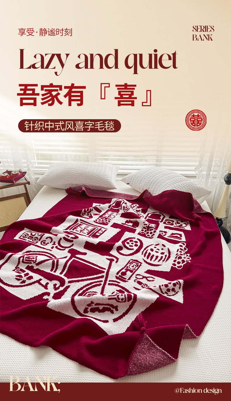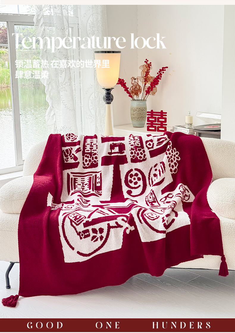 当前位置: 91家纺网 > 商品网购 > 毛毯休闲毯绒毯 > 毛毯 > 栩裕纺织 2024新款中式风高端婚礼喜字毛毯(可定制) 针织喜-复古喜字盖毯