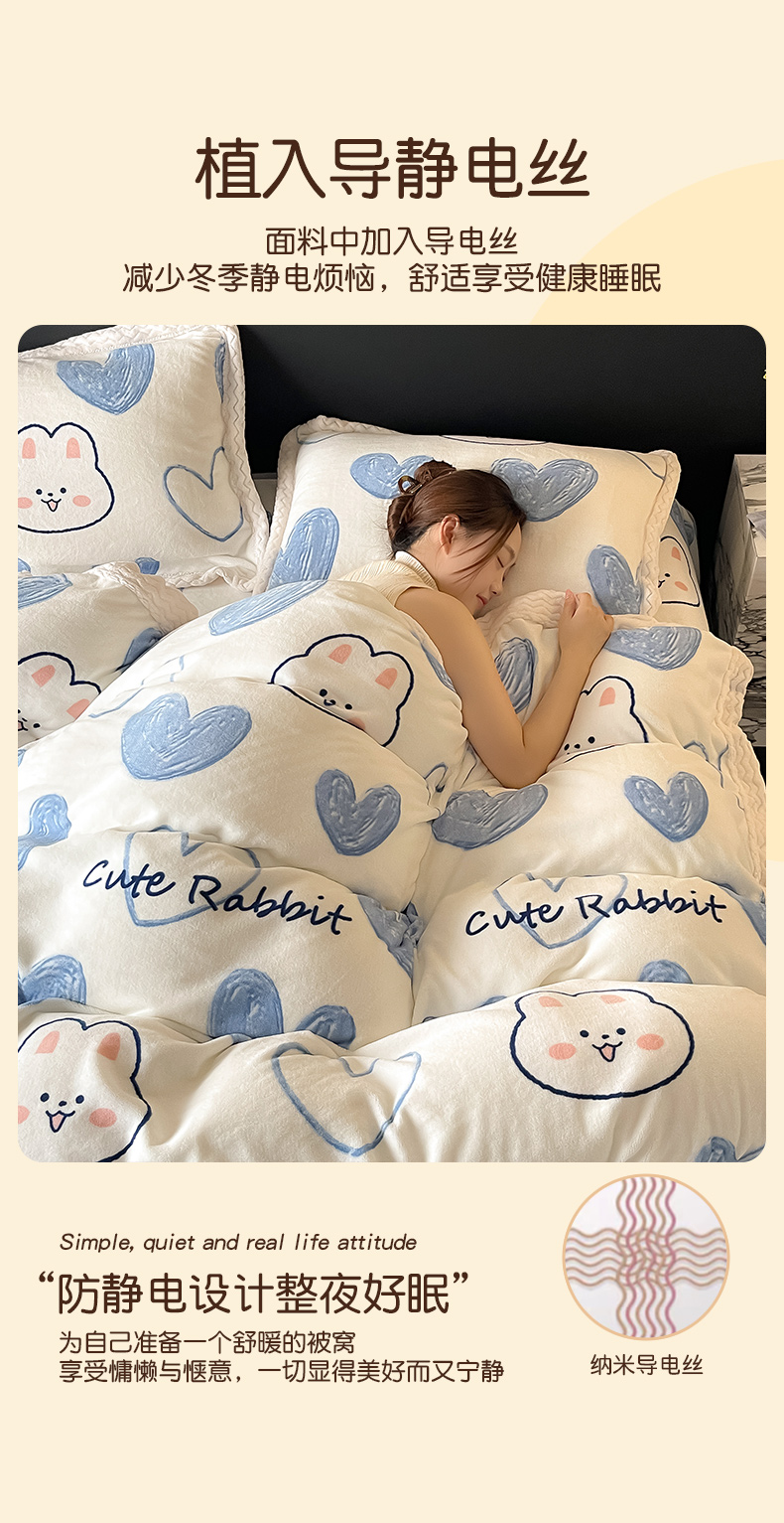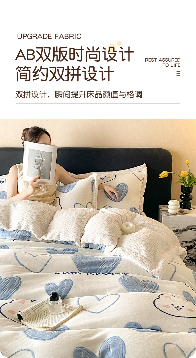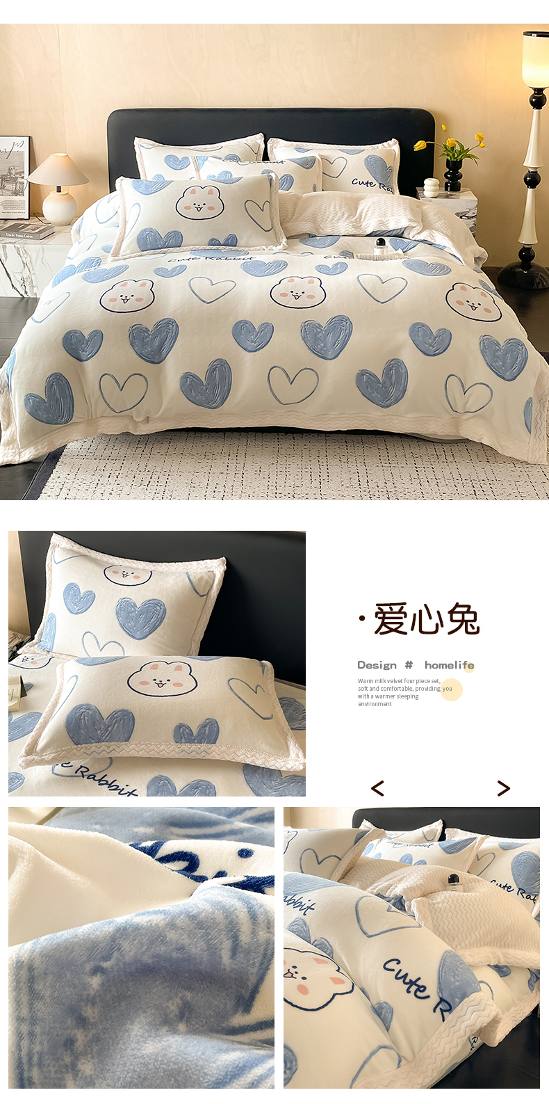 当前位置: 91家纺网 > 商品网购 > 床品套件 > 四件套 > 牛奶绒四件套 > 全季家居 2024新款A类纯色印花波浪大包边牛奶绒贝贝绒加厚保暖四件套 爱心兔