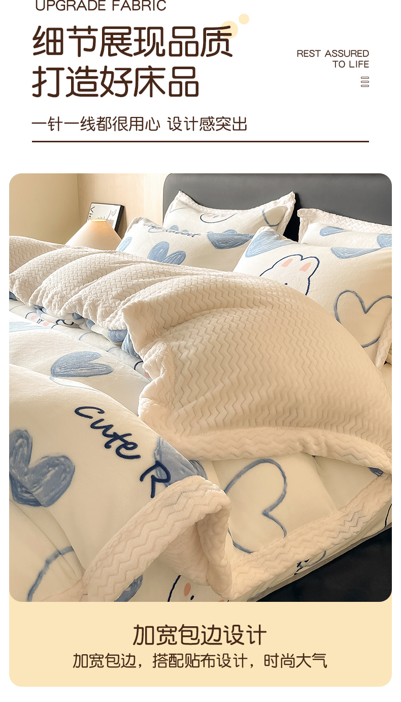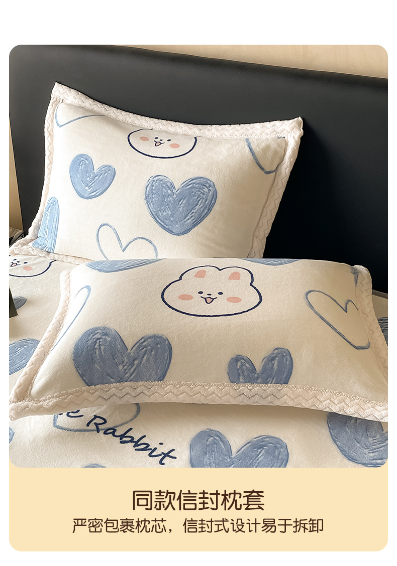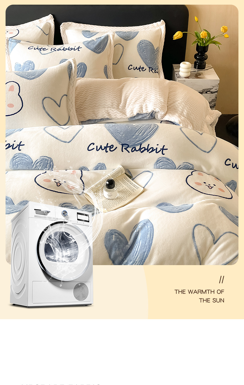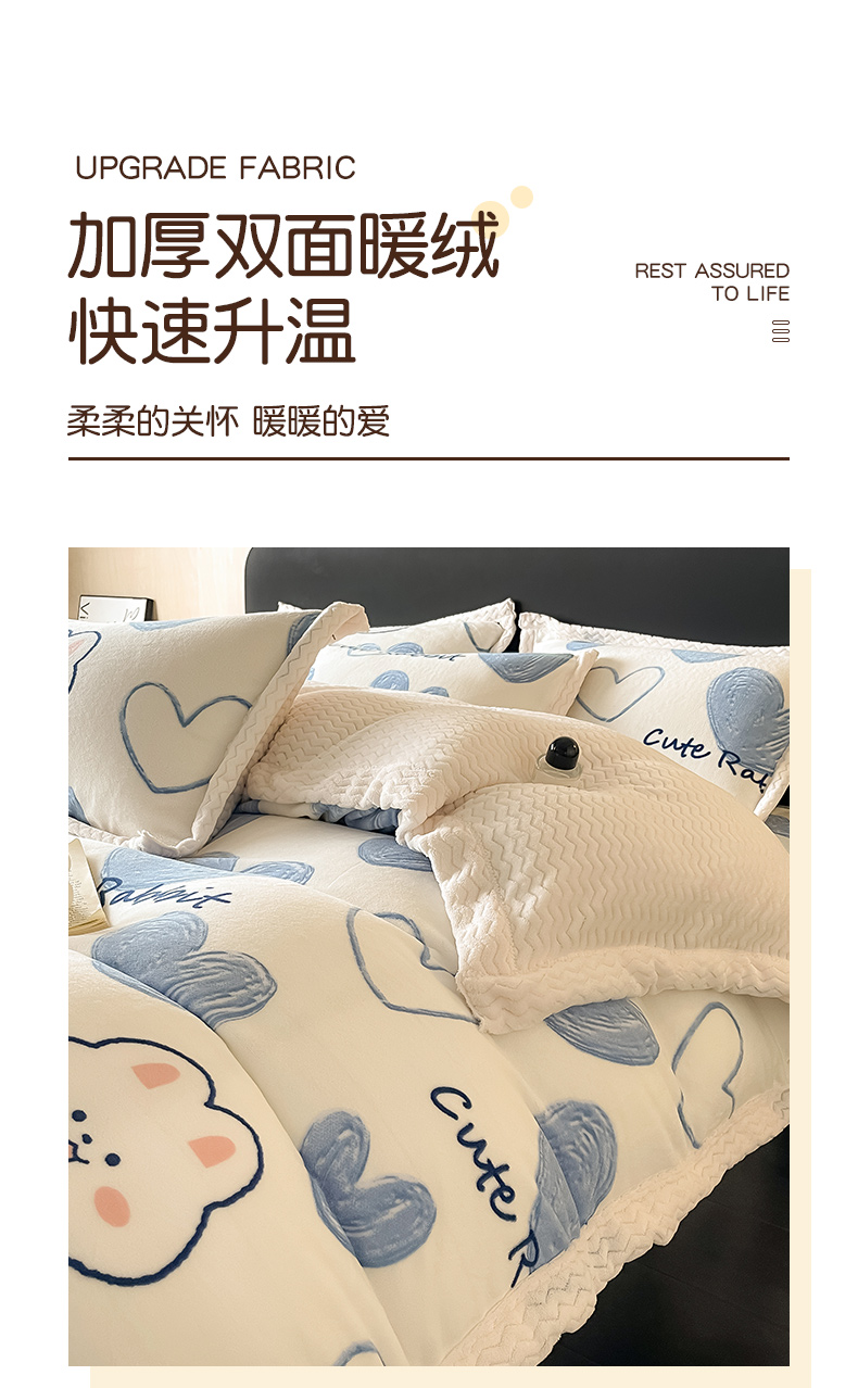 当前位置: 91家纺网 > 商品网购 > 床品套件 > 四件套 > 牛奶绒四件套 > 全季家居 2024新款A类纯色印花波浪大包边牛奶绒贝贝绒加厚保暖四件套 爱心兔