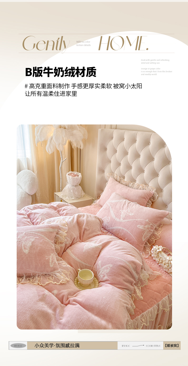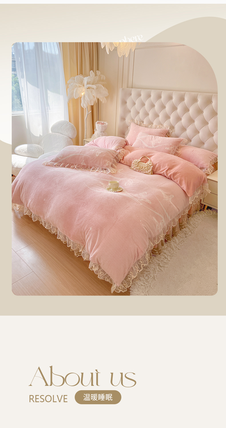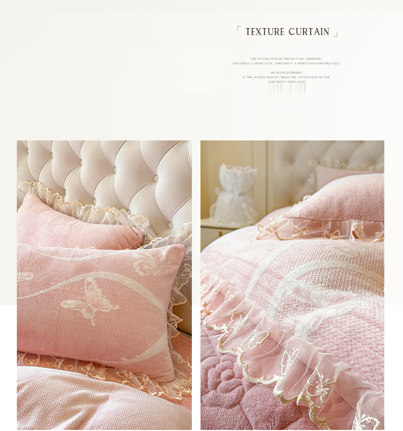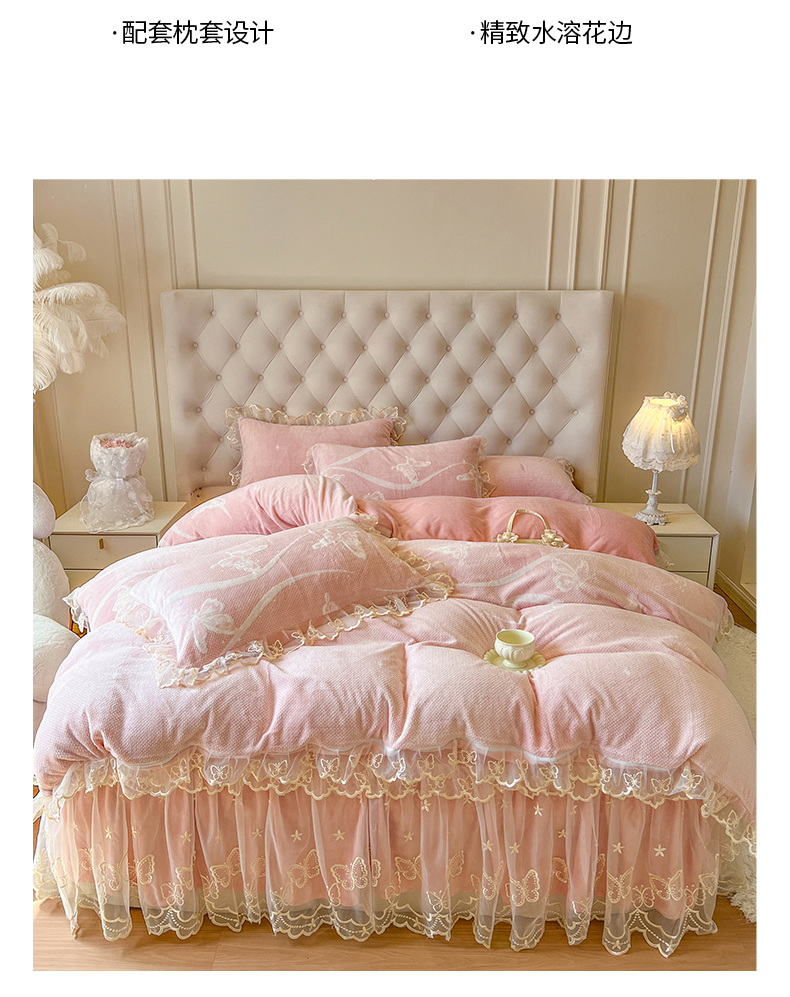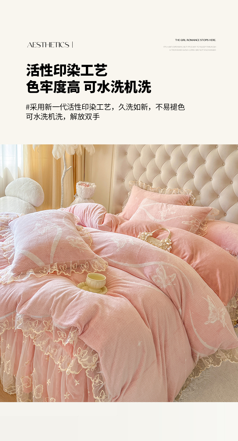 商品名称:2024新款雕花绒牛奶绒重工艺床裙四件套-蝴蝶梦境 樱粉