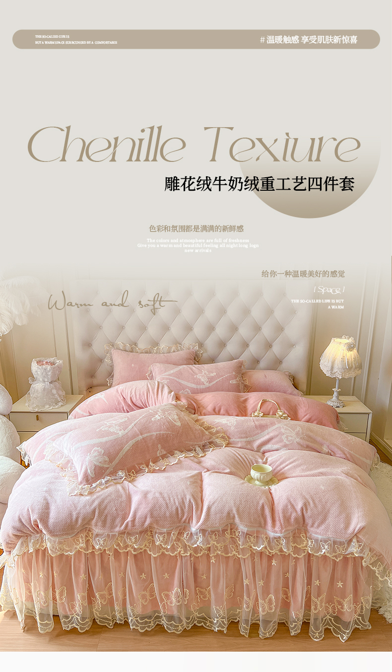 2024新款雕花绒牛奶绒重工艺床裙四件套-蝴蝶梦境 樱粉
