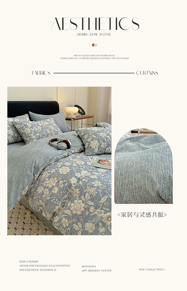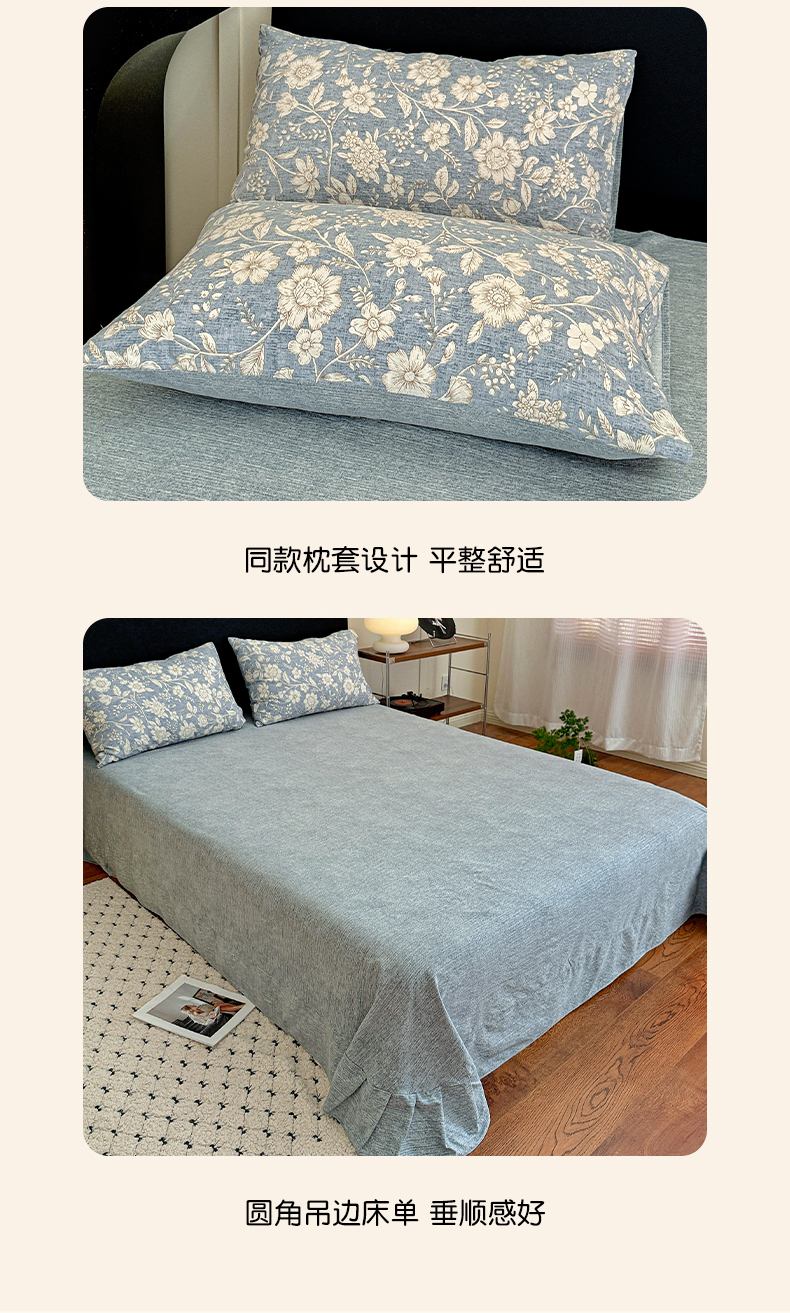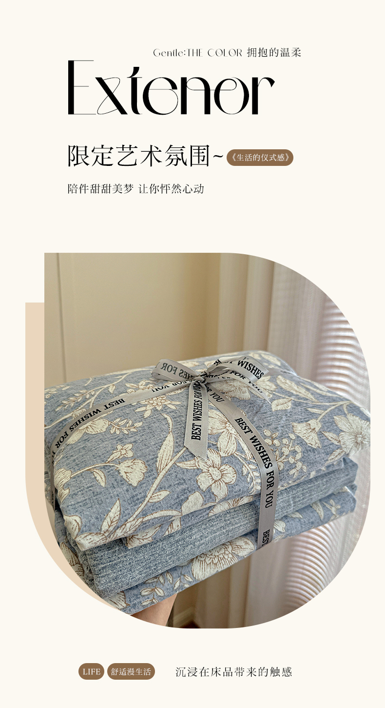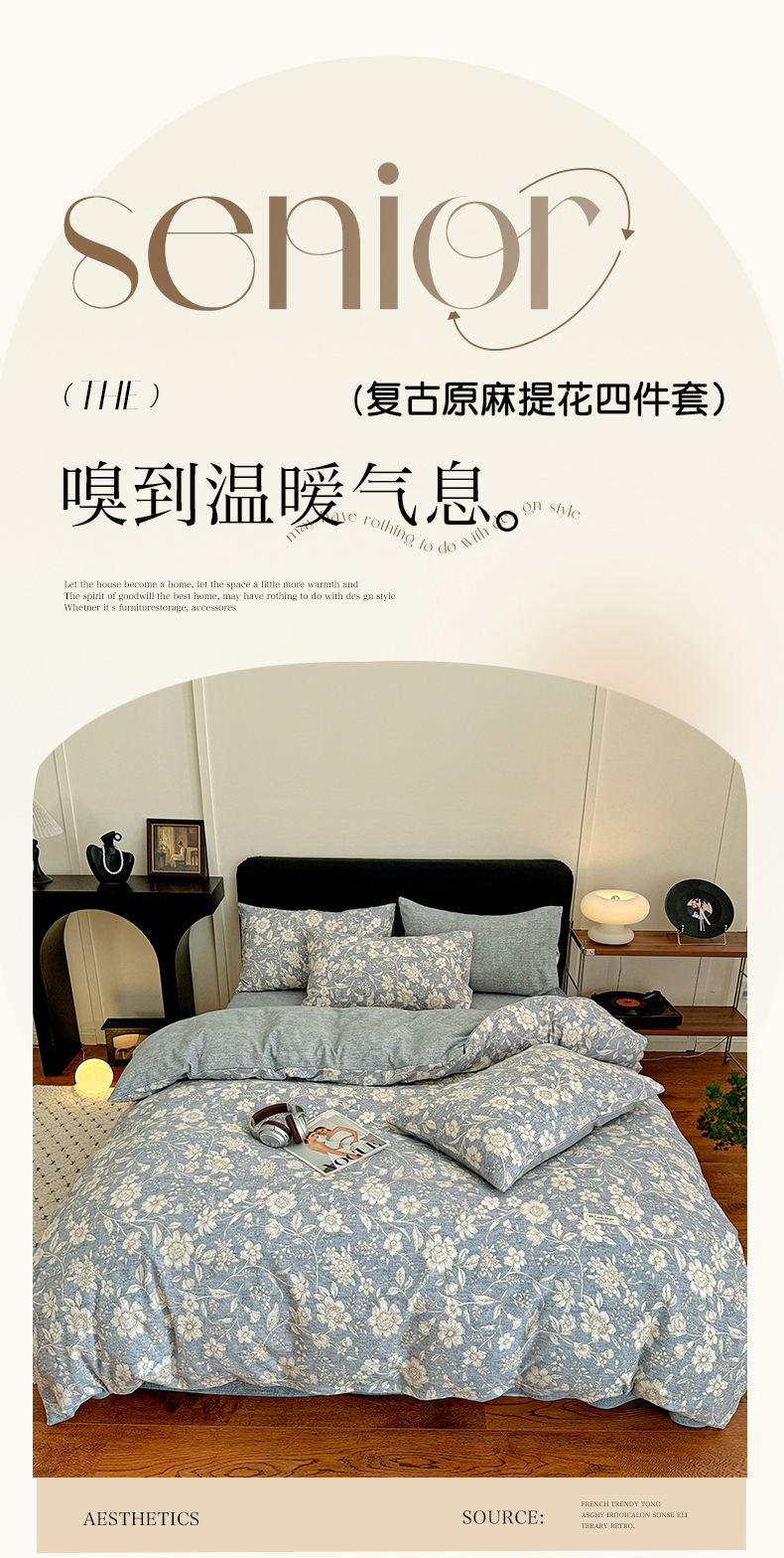 商品名称:金梦拉家纺 2025秋冬爆款新品高克重加厚原麻亚麻皱皱纱印花四件套 兰兮