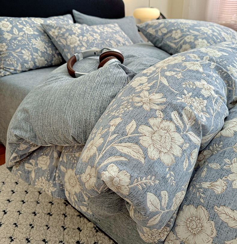 金梦拉家纺 2025秋冬爆款新品高克重加厚原麻亚麻皱皱纱印花四件套 兰兮