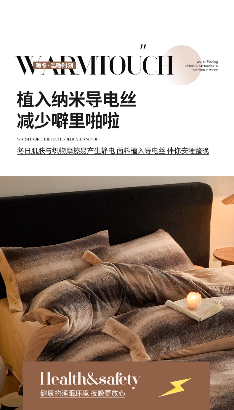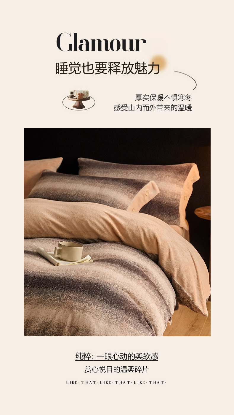 商品名称:吾秀家居 绒城 2025 纽扣工艺款230克美丽绒四件套 牛奶绒四件套-美丽系列 宽条咖