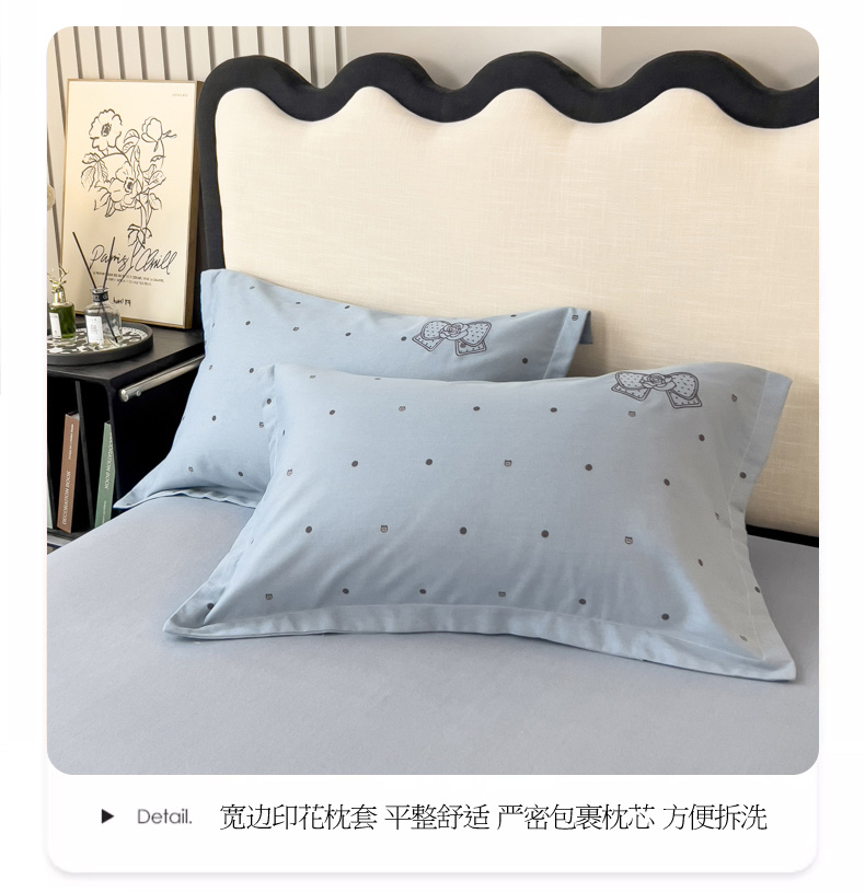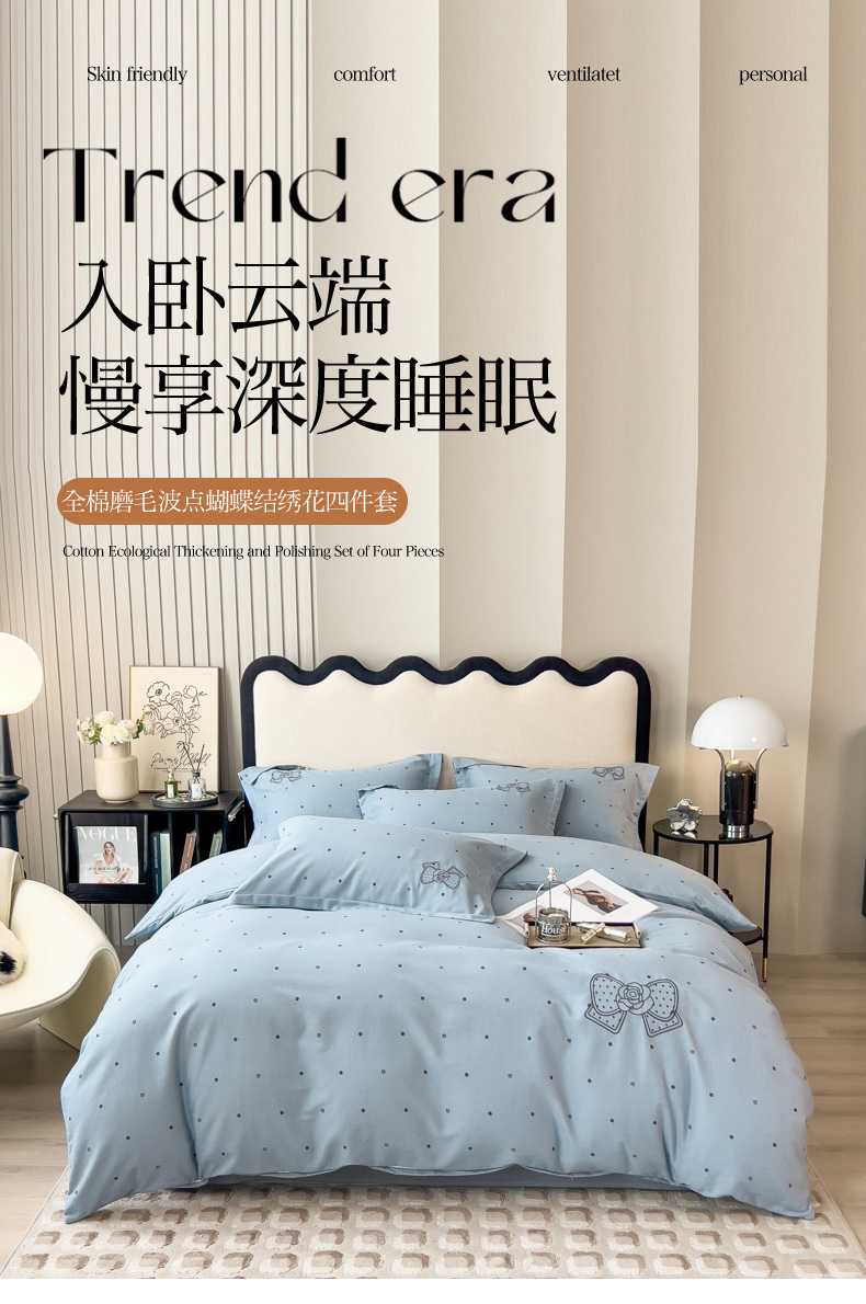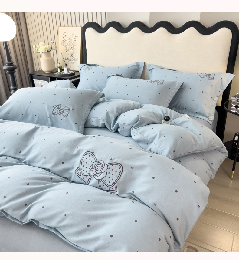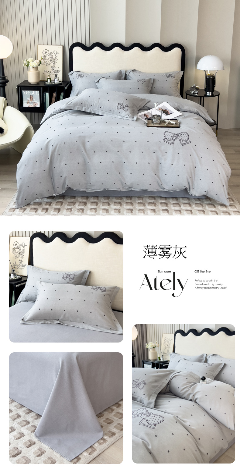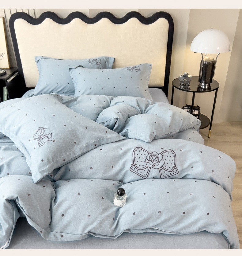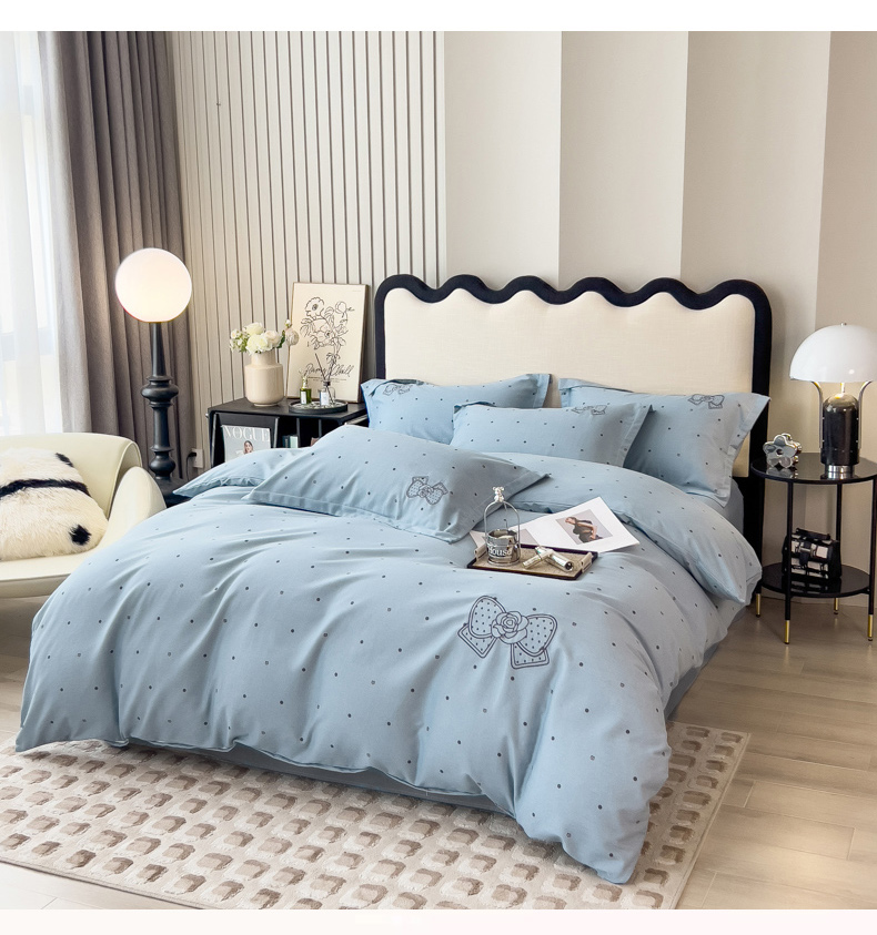 当前位置: 91家纺网 > 商品网购 > 床品套件 > 四件套 > 全棉普通四件套 > 印季家纺 2025新款全棉纯棉波点蝴蝶结绣花混纺磨毛四件套 螺甸青-灰